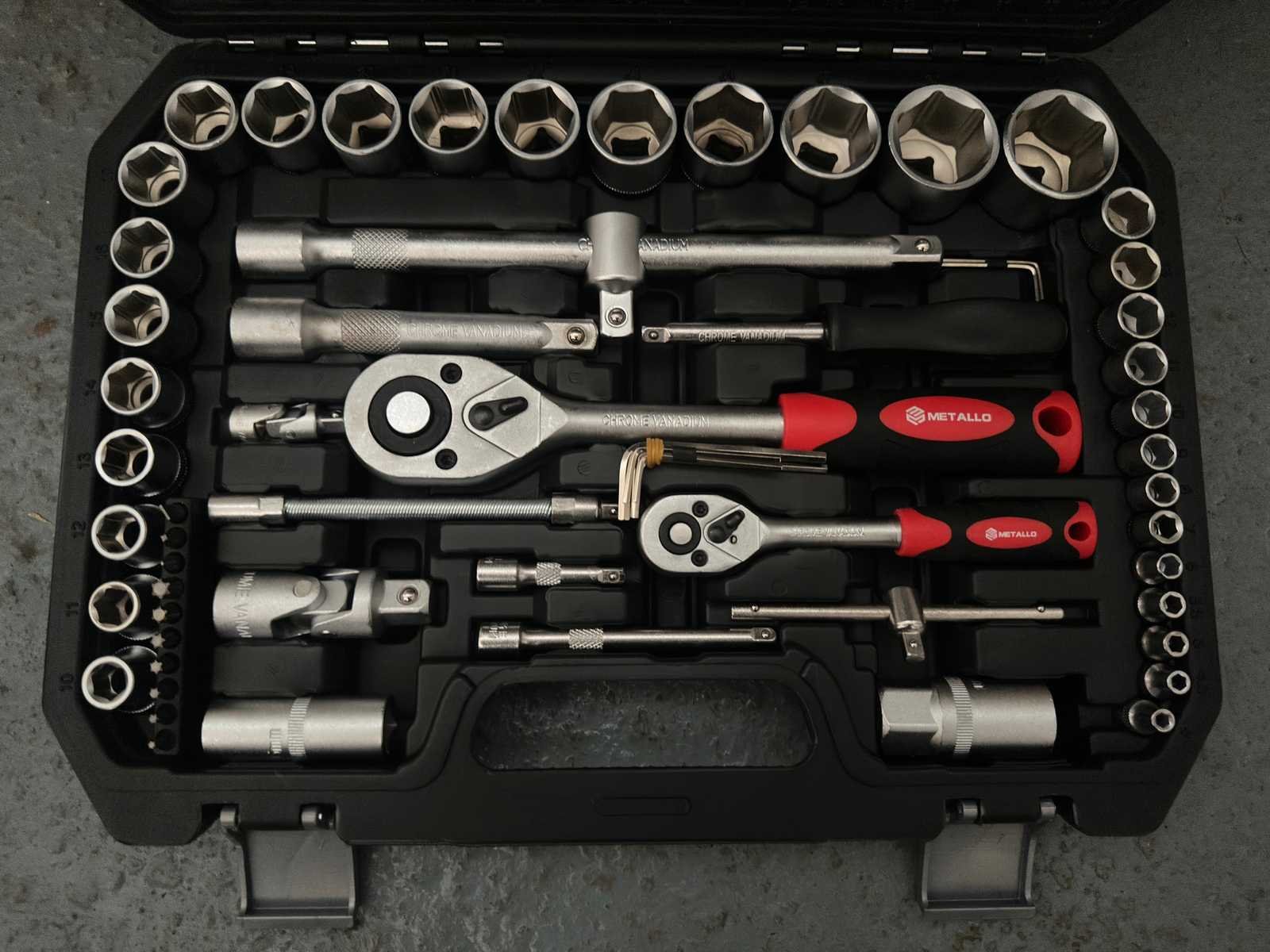 Voorzien van 13 x doppenset DR6PTREG maten 4-4,5-5-5,5-6-7-8-9-10-11-12-13-14; 8 1/4” DR6PT diepe doppen maten: 6-7-8-9-10-11-12-13; 3 x 1/4” DRBIT Doppen: FD 4-5,5-7; 2 x 1/4” DRBIT Doppen: PH1-PH2; 2 x 1/4” DRBIT doppen: PZ1-PZ2; 4 x 1/4” DRBIT Doppen: HW 3-4-5-6; 6 X 1/4” DRBIT Doppen: TX 8-10-15-20-25-30; 1 X 1/4” Doppenadapter; 1 x 1/4” DR Ratelsleutel; 2 x 1/4” DR verlengstuk 2”-4”; 1 x 1/4” verstelbare t sleutel; 1 x 1/4” DR universele koppeling; 1 x DR Spinnersleutel; 1 x DR Flexibele spinner sleutel; 18 x 1/2” DR6PTREG doppen: 10-11-12-13-14-15-16-17-18-19-20-21-22-23-24-27-30-32; 4 x 1/2” DR6PTDEEP doppen: 14-15-17-19; 2 x 1/2” DREXTENTION: 5-10’; 2 x 1/2” Bougie sleutel 16-21; 1 x 1/2” DR Universele koppeling; 1 x 1/2” DR 8 Hexagon bit koppeling; 1 x 3/8” Fx1/2”M 3weg adapter; 5 x inbussleutel 1,5-2-25 25-bits; kunststof koffer; Ongebruikt in doos Merk: Metallo Met koffer: true Delig: 106 Type: META-106W Bouwjaar: 2024
