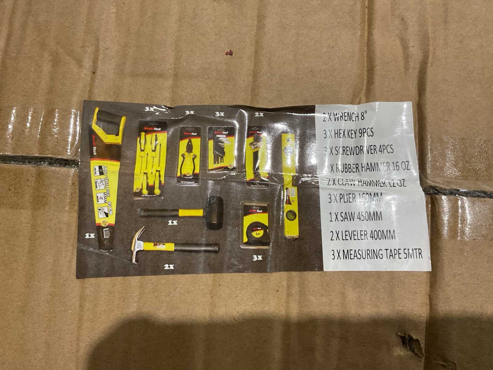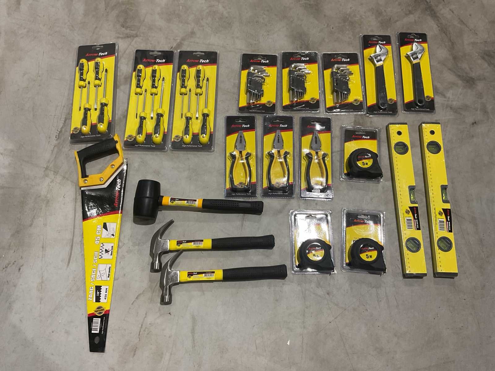 Voorzien van 2x 8” sleutel;3x inbussleutel 96st; 3x Schroevendraaier; 1x rubberen hamer; 2x klauwhamer; 3x tang 3x Meetlint; 1x zaag 450mm; 2x Waterpas; Ongebruikt in doos (Verpakking Gewicht 5,9 Afmeting 59x27,5x11) Merk: Arrow-Tech Bouwjaar: 2025 Type: 009747