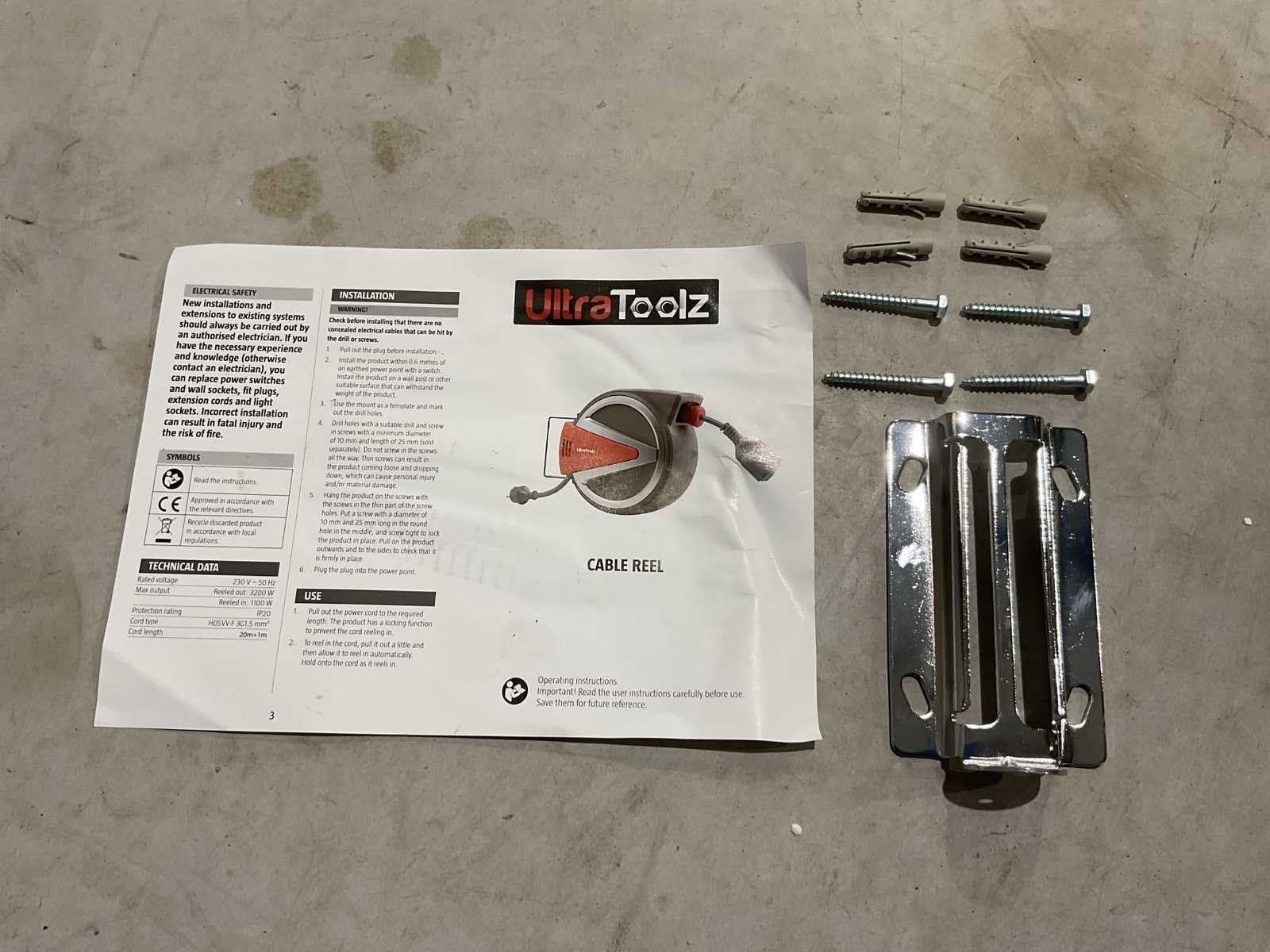 Voorzien van Voltage 230 V 12A; Kabellengte op haspel 20m; Muurbevestiging; 180° draaibaar; Lengte aansluitkabel 1 meter; Maximale stroombelasting van de kabel 1100W (opgerold), 3200W (uitgerold); Dikte kabel 3G 2.5 mm2; IP klasse IP44; Bruto gewicht 9km; verpakkingsafmeting: 14kg 395x345x335mm; Ongebruikt in doos Merk: Ultratoolz Type: 20m Bouwjaar: 2025 Aansluiting: 220V Male-male: true Male-female: true Op haspel: true Lengte: 20m