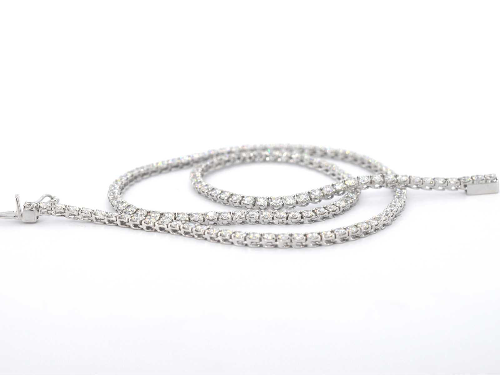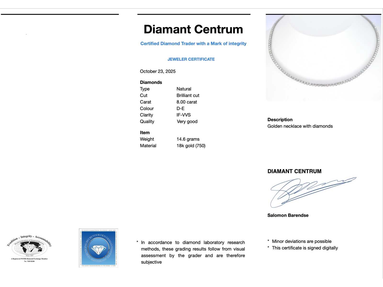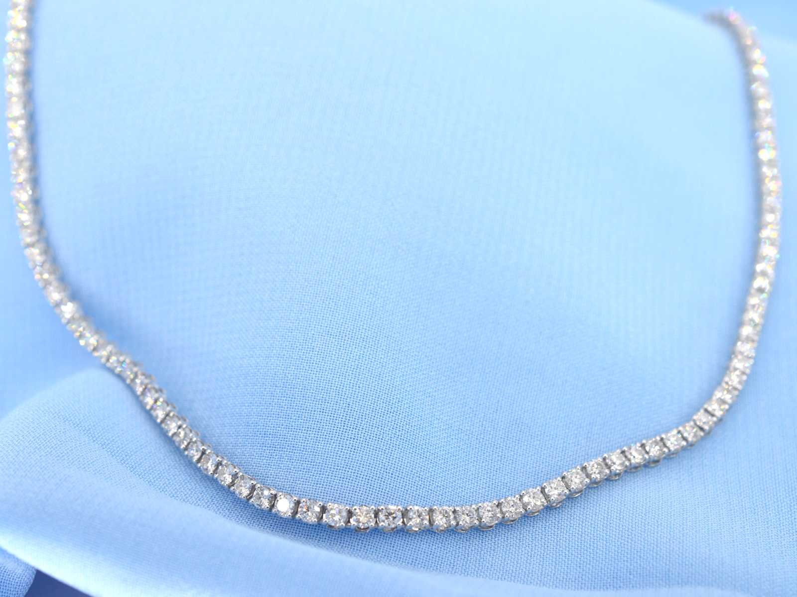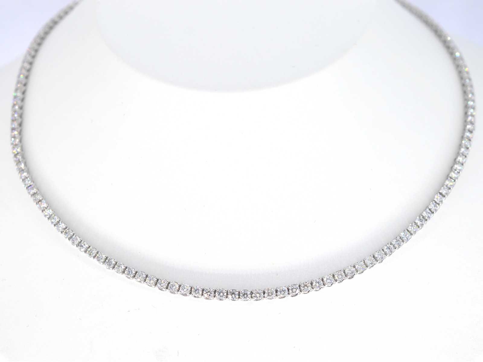 Samenvatting van gegevens Witgouden collier met natuurlijke diamanten 8.00 carat Diamant: Natuurlijk; Aantal: ca. 139 stuks; Slijpvorm: Briljant geslepen; Gewicht (carat): 8.00 carat; Kleur: D-E; Zuiverheid: IF-VVS; Slijpkwaliteit: Excellent; Juweel: Halsketting; Gewicht: 14.6 gram; Afmetingen/lengte: 40 cm; Materiaal: 18K goud (750); Conditie: Nieuw; Verpakking: Luxe sieradendoos; Toelichting: De kwaliteit is overgenomen van het rapport behorend bij item. De waardebepaling is een beoordeling van een gecertificeerde diamantair, gebaseerd op consumentenprijzen.; Consumentenprijs: € 39.200,- Within 14 days Materiaal: Goud Voornaamste diamant: Natuurlijk Kleur diamant: D-E Gewicht diamant: 8.00ct Slijpvorm diamant: Briljant geslepen Slijpkwaliteit diamant: Excellent Zuiverheidsgraad diamant: IF-VVS Totaal gewicht: 14.6g Keurmerk: 750