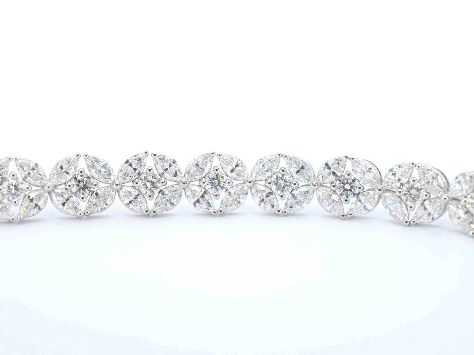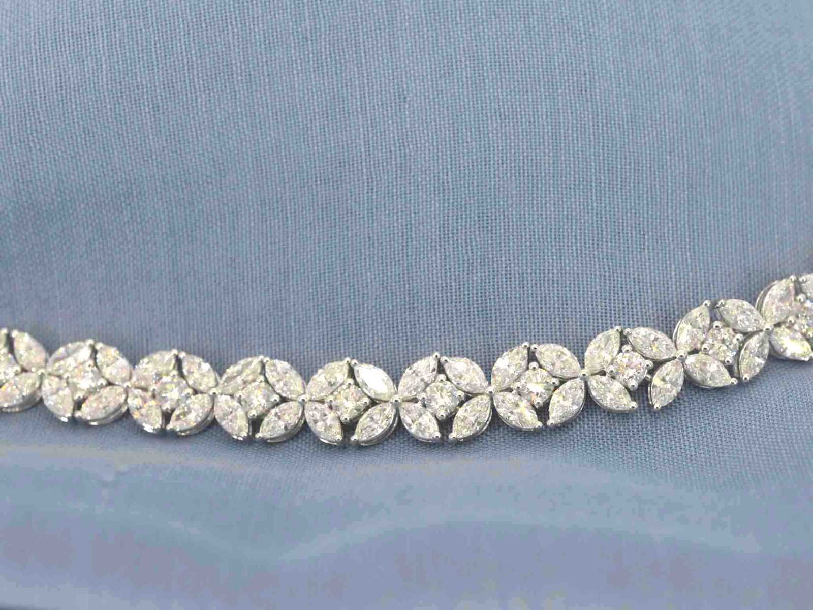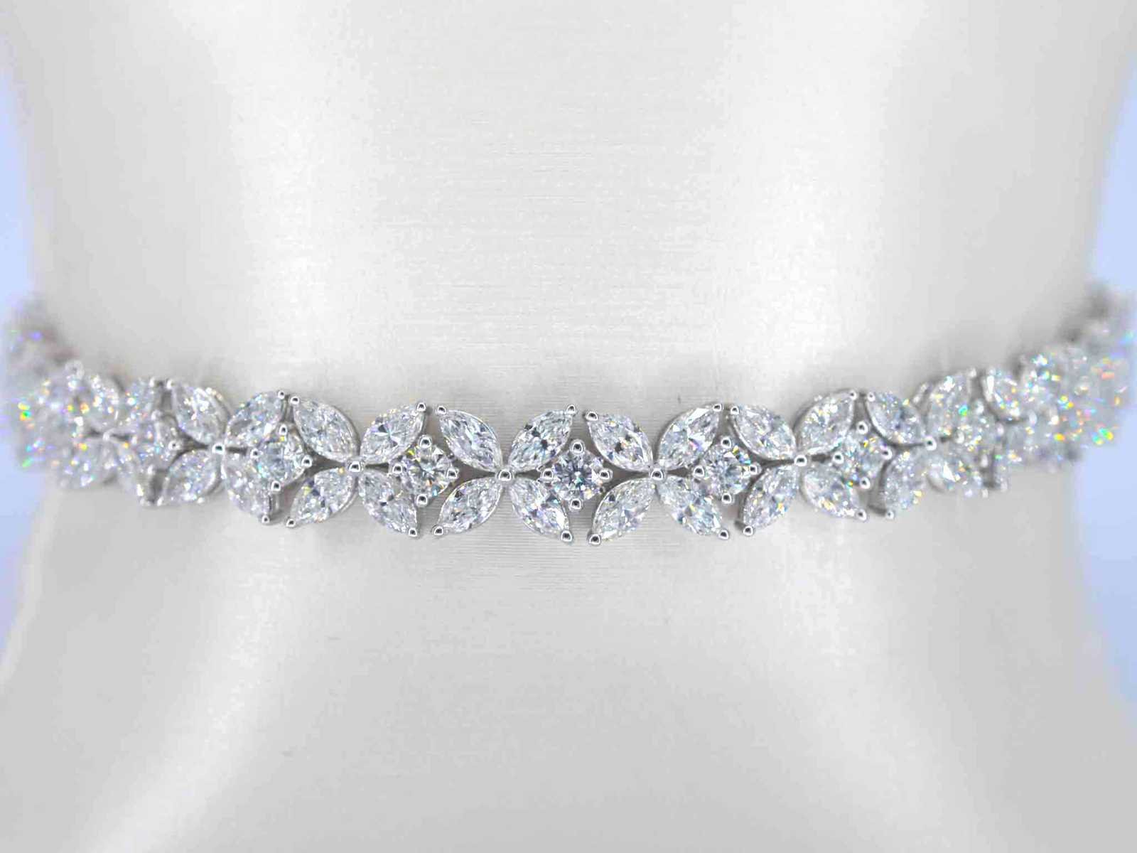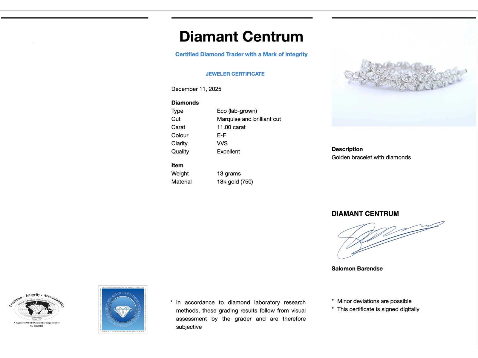 Samenvatting van gegevens Witgouden exclusieve armband met 11.00 carat aan marquise en briljant geslepen diamanten Diamant: Eco (lab-grown); Aantal: 104 stuks; Slijpvorm: Marquise en Briljant geslepen; Gewicht (carat): 11.00 carat; Kleur: E-F; Zuiverheid: VVS; Slijpkwaliteit: Excellent; Juweel: Armband; Gewicht: 13 gram; Afmetingen/lengte: 18 cm; Materiaal: 18K goud (750); Conditie: Nieuw; Verpakking: Luxe sieradendoos; Toelichting: De kwaliteit is overgenomen van het rapport behorend bij item. De waardebepaling is een beoordeling van een gecertificeerde diamantair, gebaseerd op consumentenprijzen.; Consumentenprijs: € 25200,- Within 14 days Totaal gewicht: 13g Keurmerk: 750
