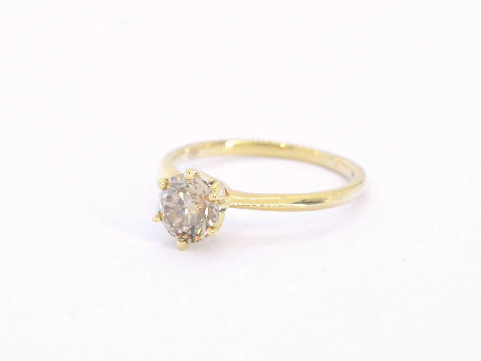 Samenvatting van gegevens Gouden solitair ring met diamant 1.01 carat Diamant: Natuurlijk; Aantal: 1 stuk; Slijpvorm: Briljant geslepen; Gewicht (carat): 1.01 carat; Kleur: Champagne; Zuiverheid: VS; Slijpkwaliteit: Zeer mooi; Juweel: Ring; Gewicht: 2.3 gram; Ringmaat (op maat gemaakt*): 53 (17 mm); Materiaal: 18K goud (750); Conditie: Nieuw; Verpakking: Luxe sieradendoos; Toelichting: De kwaliteit is overgenomen van het rapport behorend bij item. De waardebepaling is een beoordeling van een gecertificeerde diamantair, gebaseerd op consumentenprijzen.; Consumentenprijs: € 7.920,- Within 14 days Materiaal: Goud Voornaamste diamant: Natuurlijk Gewicht diamant: 1.01ct Totaal gewicht: 2.3g Keurmerk: 750 Kleur diamant: Champagne Slijpvorm diamant: Briljant geslepen Slijpkwaliteit diamant: Zeer mooi Zuiverheidsgraad diamant: VS