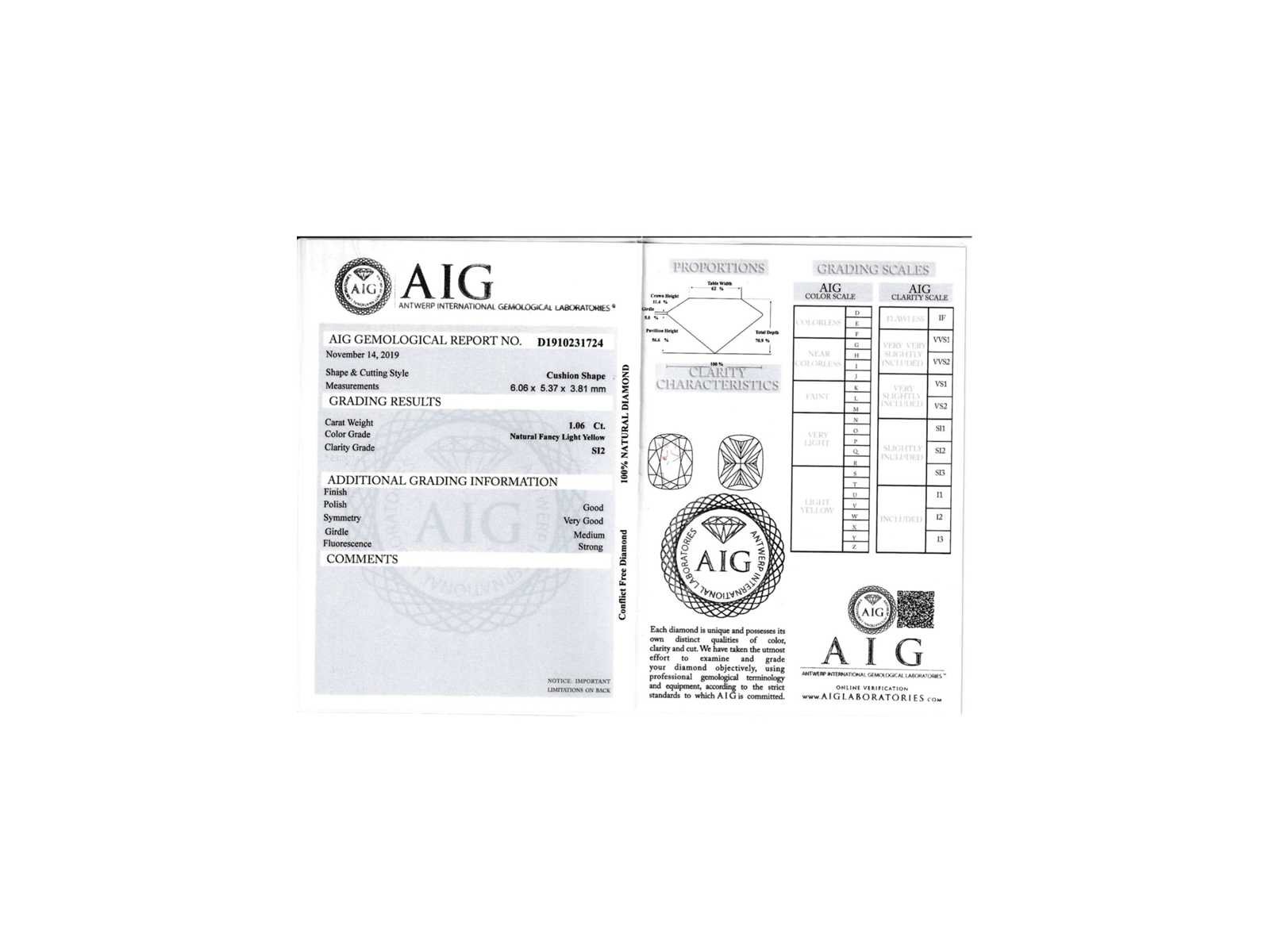 Samenvatting van gegevens Diamant - 1.06 carat natuurlijke diamant (gecertificeerd) Diamant: Natuurlijk; Aantal: 1 stuk; Slijpvorm: Cushion geslepen; Gewicht (carat): 1.06 carat; Kleur: Natural fancy light yellow; Zuiverheid: SI2; Slijpkwaliteit: Very good; Certificaat: AIG; Certificaat nummer: D1910231724; Conditie: Nieuw; Verpakking: Edelsteendoos; Toelichting: De kwaliteit is overgenomen van het rapport behorend bij item. De waardebepaling is een beoordeling van een gecertificeerde diamantair, gebaseerd op consumentenprijzen.; Consumentenprijs: € 6.000,- Within 14 days Voornaamste diamant: Natuurlijk Kleur diamant: Natural fancy light yellow Gewicht diamant: 1.06ct Slijpvorm diamant: Cushion geslepen Slijpkwaliteit diamant: Very good Zuiverheidsgraad diamant: SI2 Certificaat: AIG