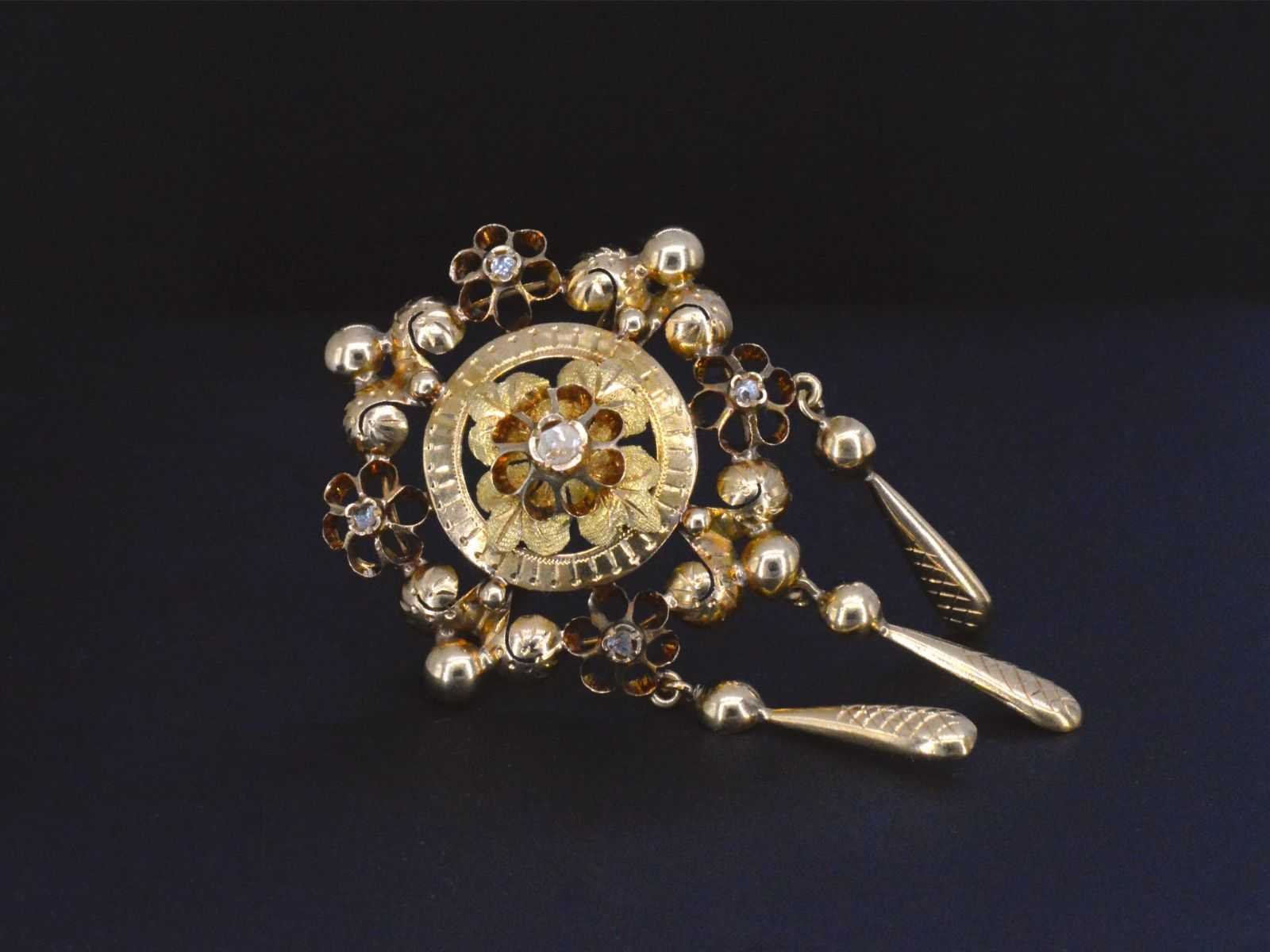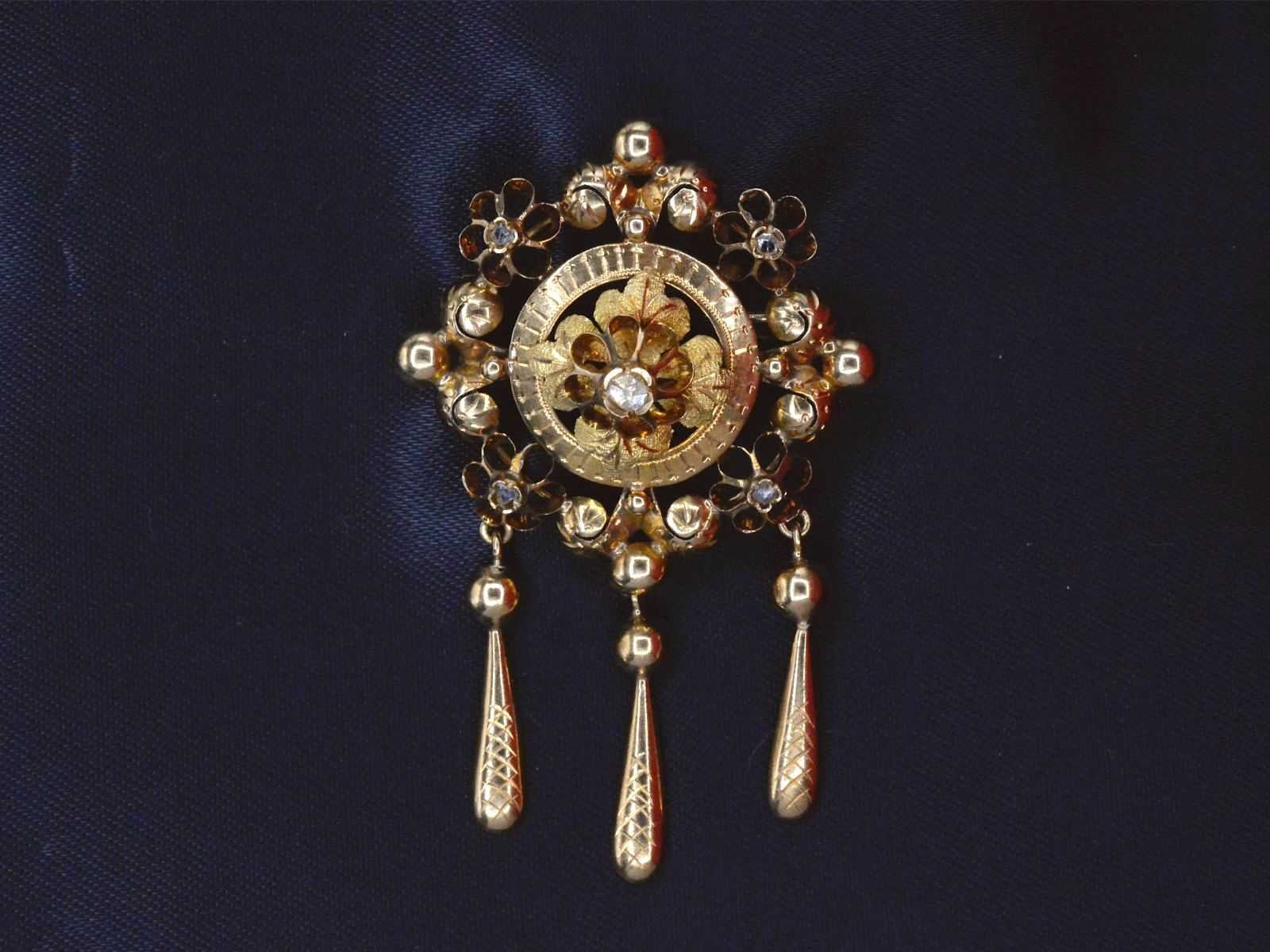 Samenvatting van gegevens Gouden broche met diamanten Diamant: Natuurlijk; Aantal: 5 stuks; Slijpvorm: Roos chipped; Gewicht (carat): 0.10 carat; Kleur: Wit; Zuiverheid: Met natuurlijke insluitsels; Juweel: Broche; Gewicht: 7.7 gram; Afmetingen/lengte: 56 x 37 mm; Materiaal: 18k goud (750); Conditie: Vintage; Verpakking: Luxe sieradendoos; Toelichting: De kwaliteit is overgenomen van het rapport behorend bij item. De waardebepaling is een beoordeling van een gecertificeerde diamantair, gebaseerd op consumentenprijzen.; Consumentenprijs: € 6.160,- Within 14 days Materiaal: Goud Voornaamste diamant: Natuurlijk Kleur diamant: Wit Gewicht diamant: 0.10ct Slijpvorm diamant: Roos chipped Zuiverheidsgraad diamant: Met natuurlijke insluitsels Totaal gewicht: 7.7g Keurmerk: 750