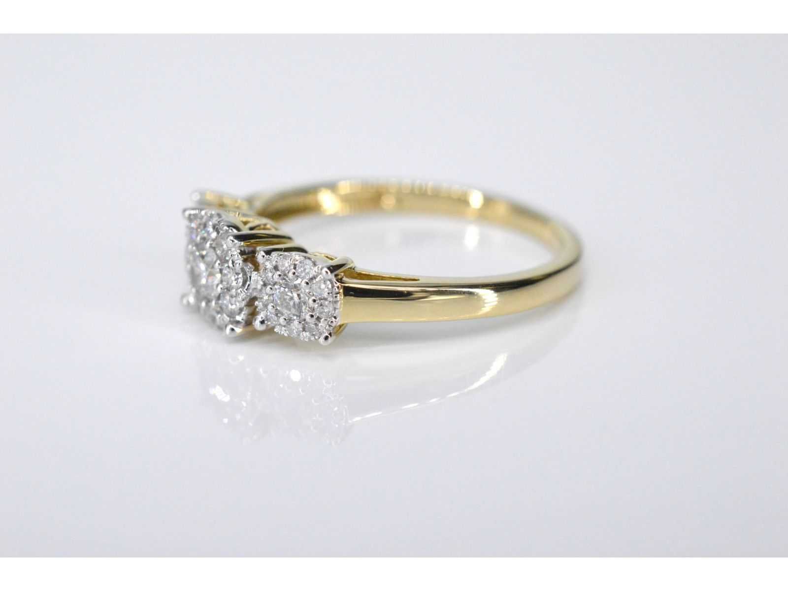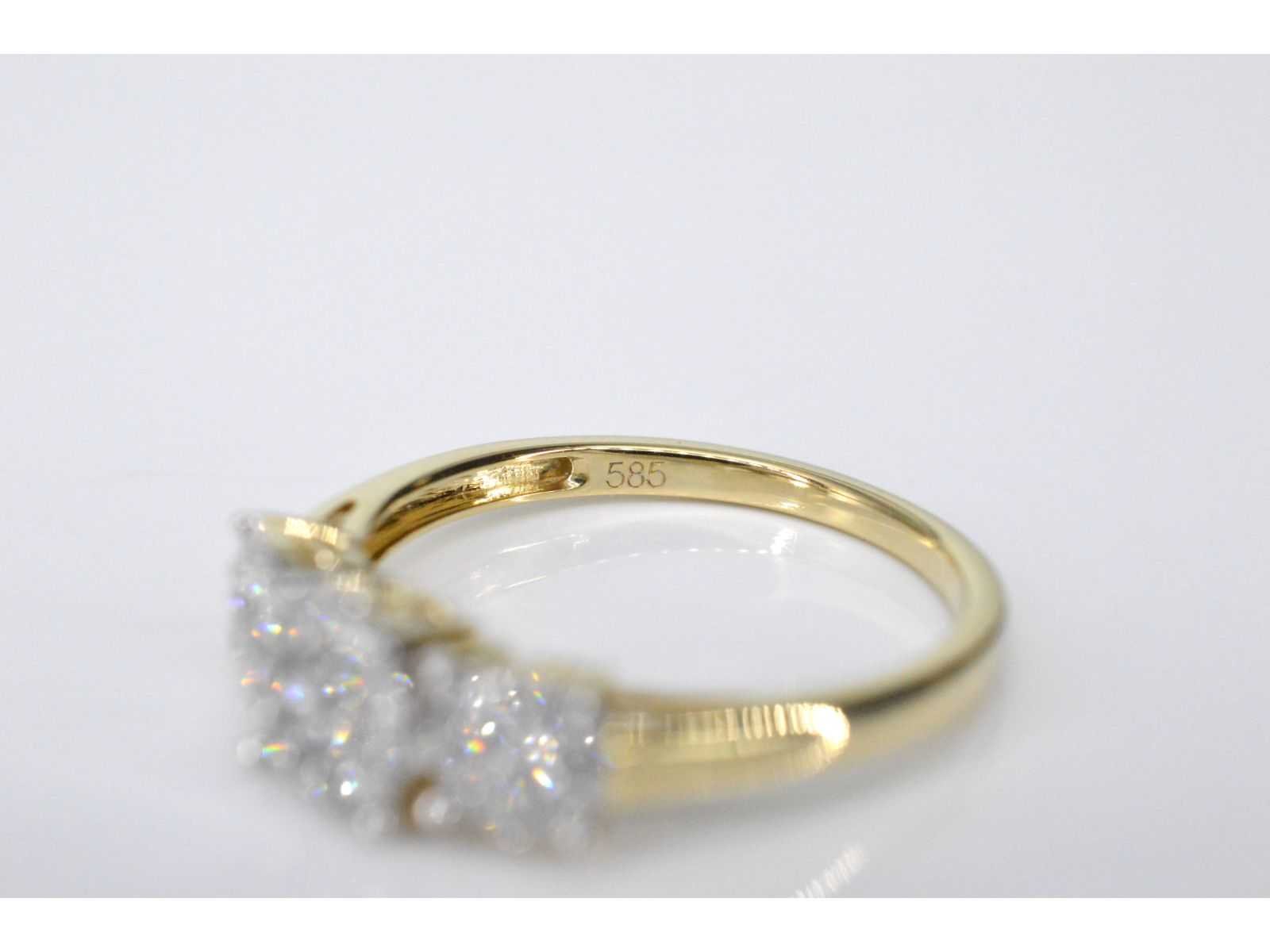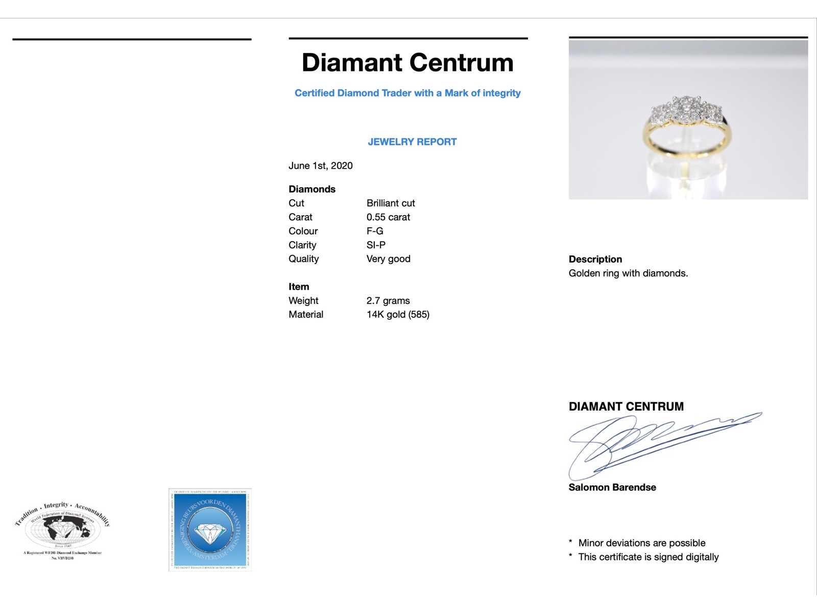 Samenvatting van gegevens Gouden trinity ring met diamanten Diamant: Natuurlijk; Slijpvorm: Briljant en rond geslepen; Gewicht (carat): 0.55 carat; Kleur: F-G; Zuiverheid: SI-P; Slijpkwaliteit: Zeer mooi; Juweel: Ring; Gewicht: 2.7 gram; Ringmaat (op maat gemaakt*): 54 (17.25 mm); Materiaal: 14k goud (585); Conditie: Nieuw; Verpakking: Luxe sieradendoos; Toelichting: De kwaliteit is overgenomen van het rapport behorend bij item. De waardebepaling is een beoordeling van een gecertificeerde diamantair, gebaseerd op consumentenprijzen.; Consumentenprijs: € 2.538,- Within 14 days Materiaal: Goud Voornaamste diamant: Natuurlijk Gewicht diamant: 0.55ct Totaal gewicht: 2.7g Keurmerk: 585 Kleur diamant: F-G Slijpvorm diamant: Briljant en rond geslepen Slijpkwaliteit diamant: Zeer mooi Zuiverheidsgraad diamant: SI-P