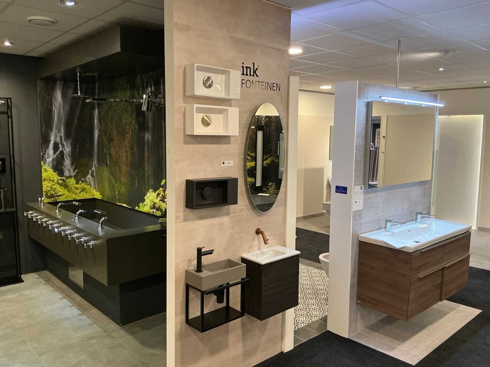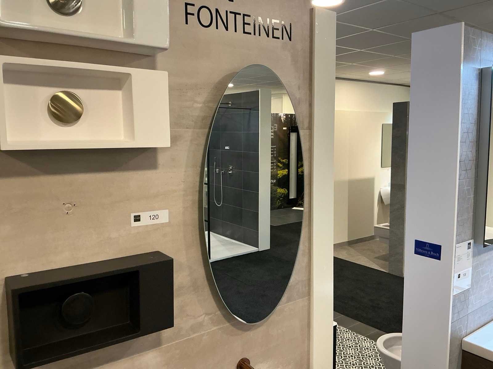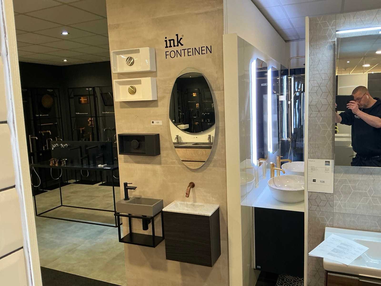 Verschillende soorten en maten op 1 wand met spiegel (40x80cm) kranen zijn alleen afbouwgedeelte zonder inbouwgedeelte. Merk: Sanibell Model: Ink