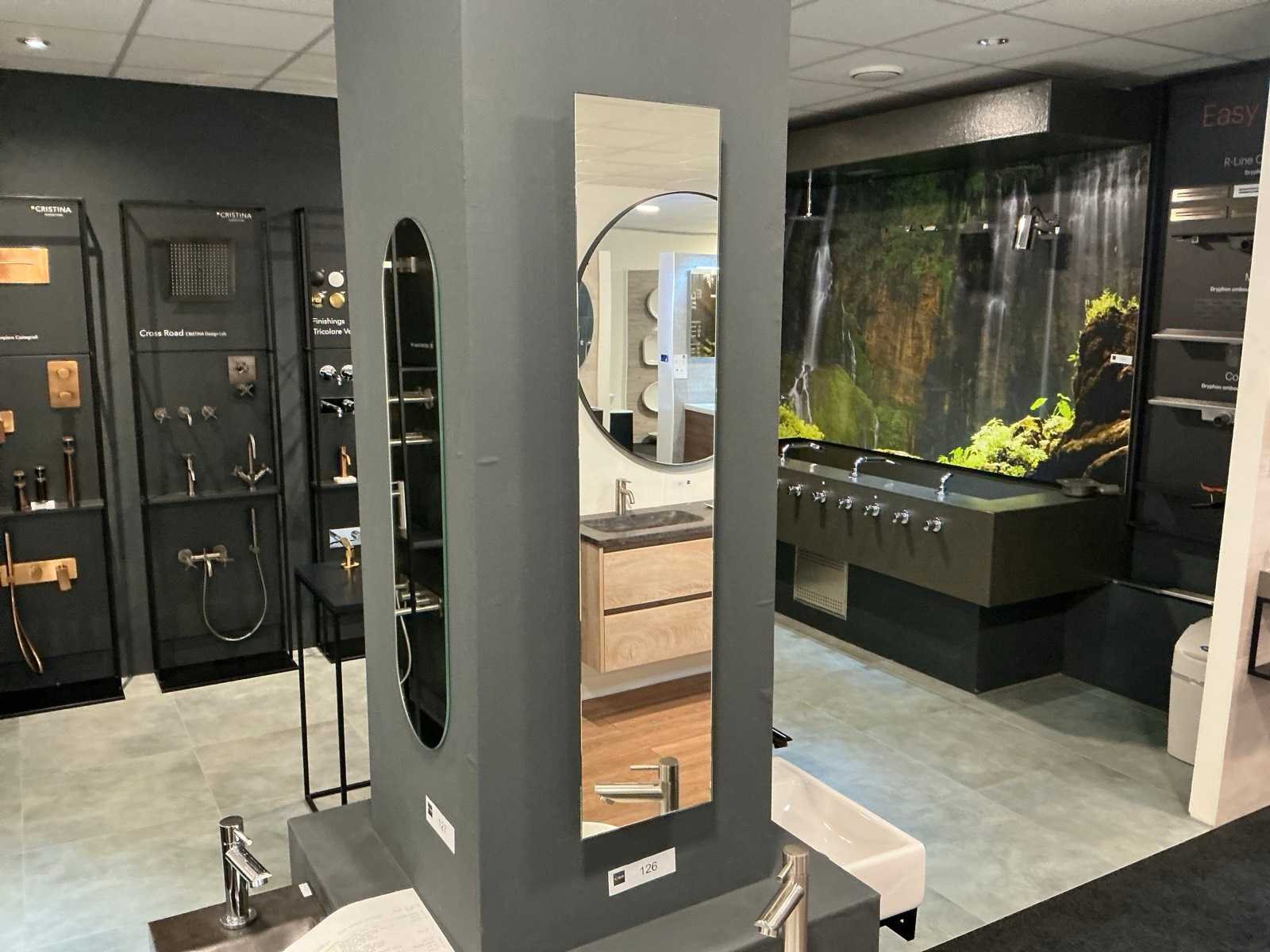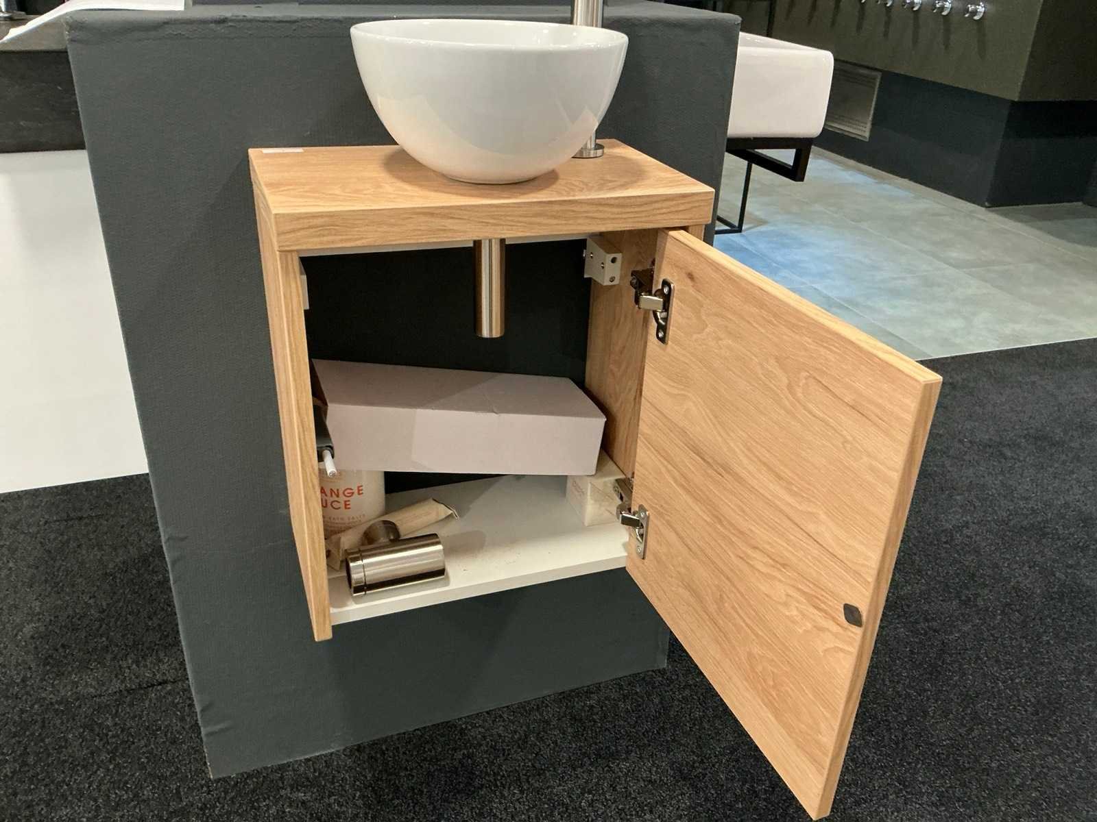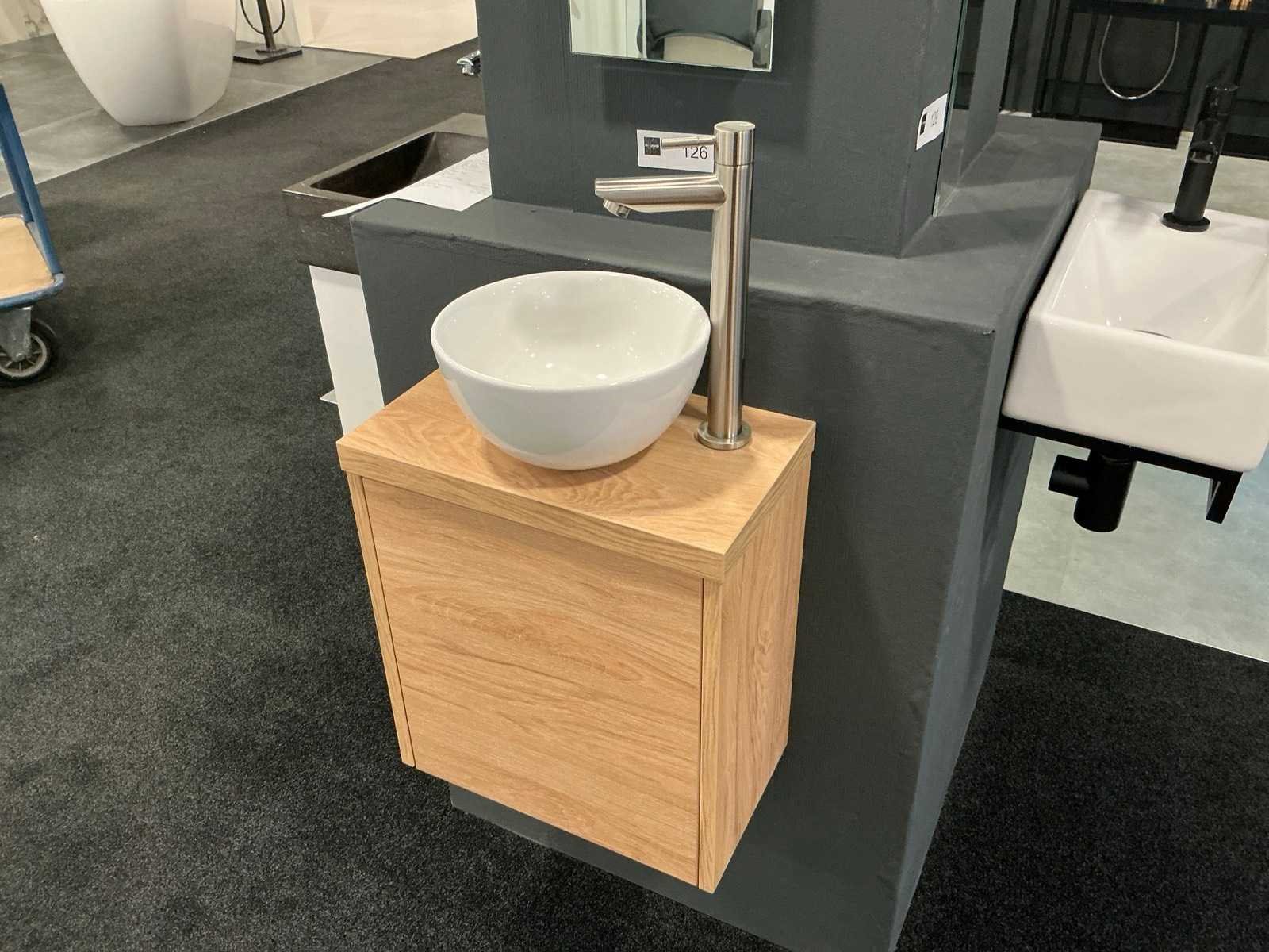 Bestaande uit een spiegel 20x90cm, opzetkom rond 24cm met afbouwgedeelte fonteinkraan zonder inbouwgedeelte, Ideal Oak onderkast met afdekblad (40x23x40cm) met 1 push to open deur. Merk: Sanibell Model: Proline