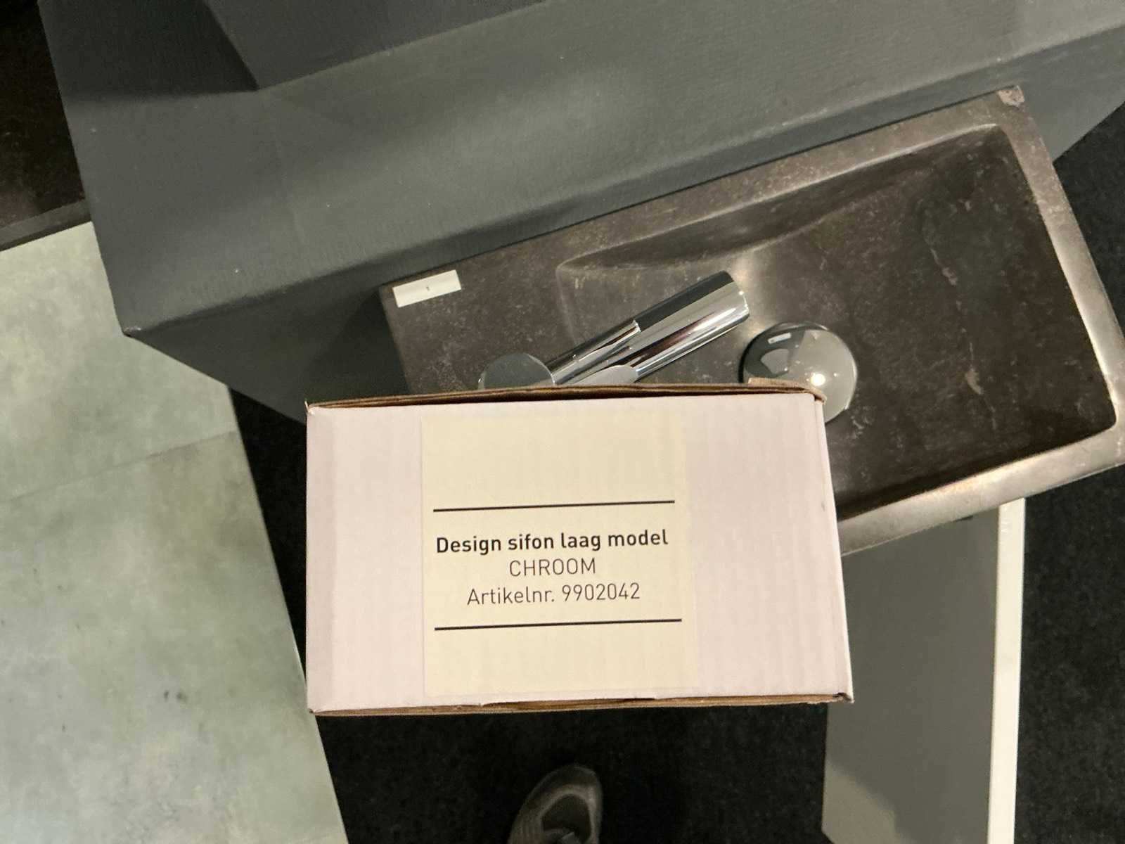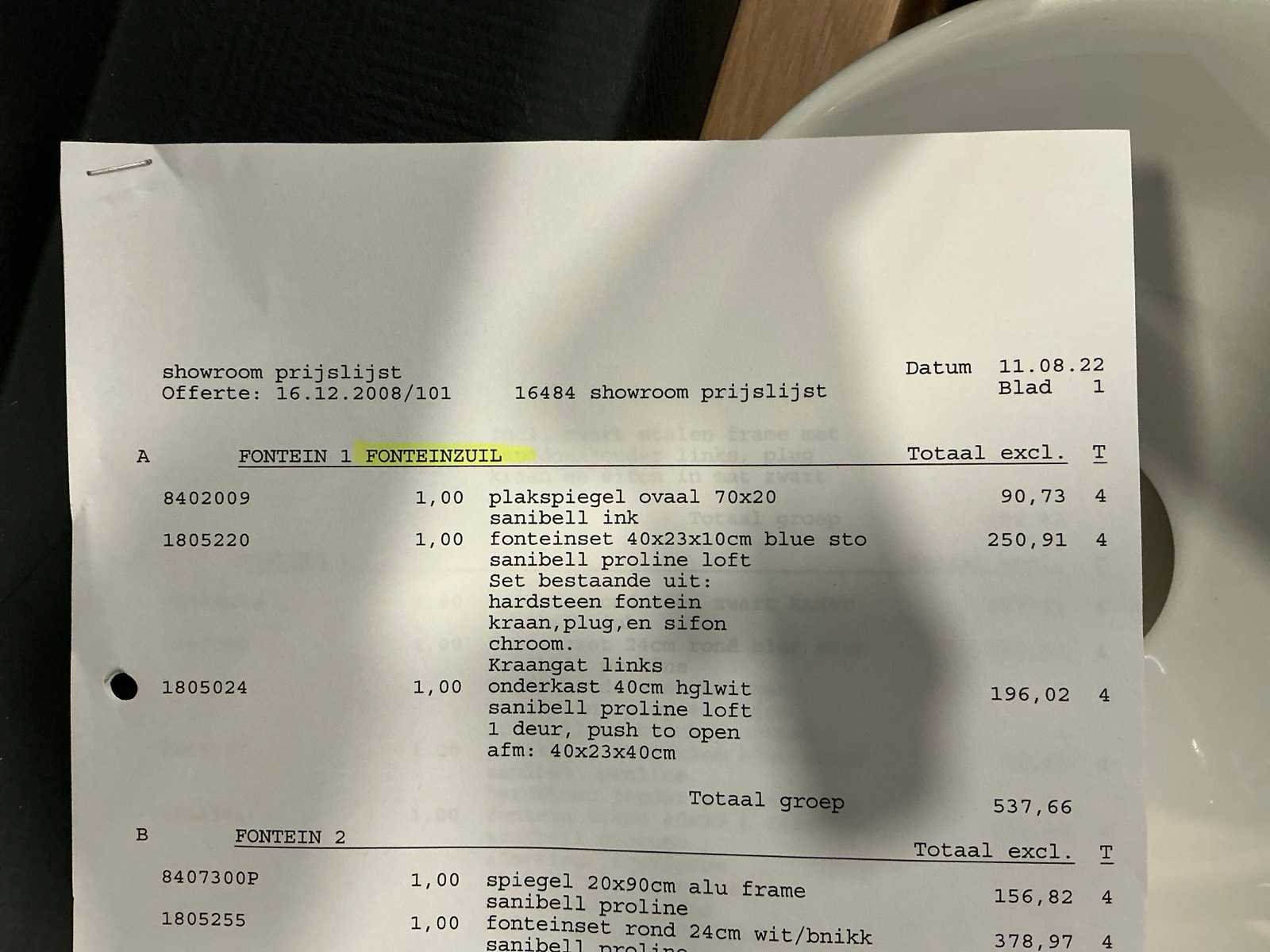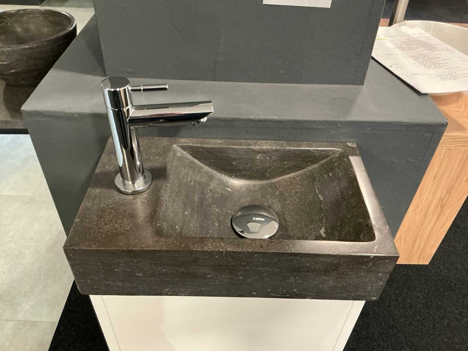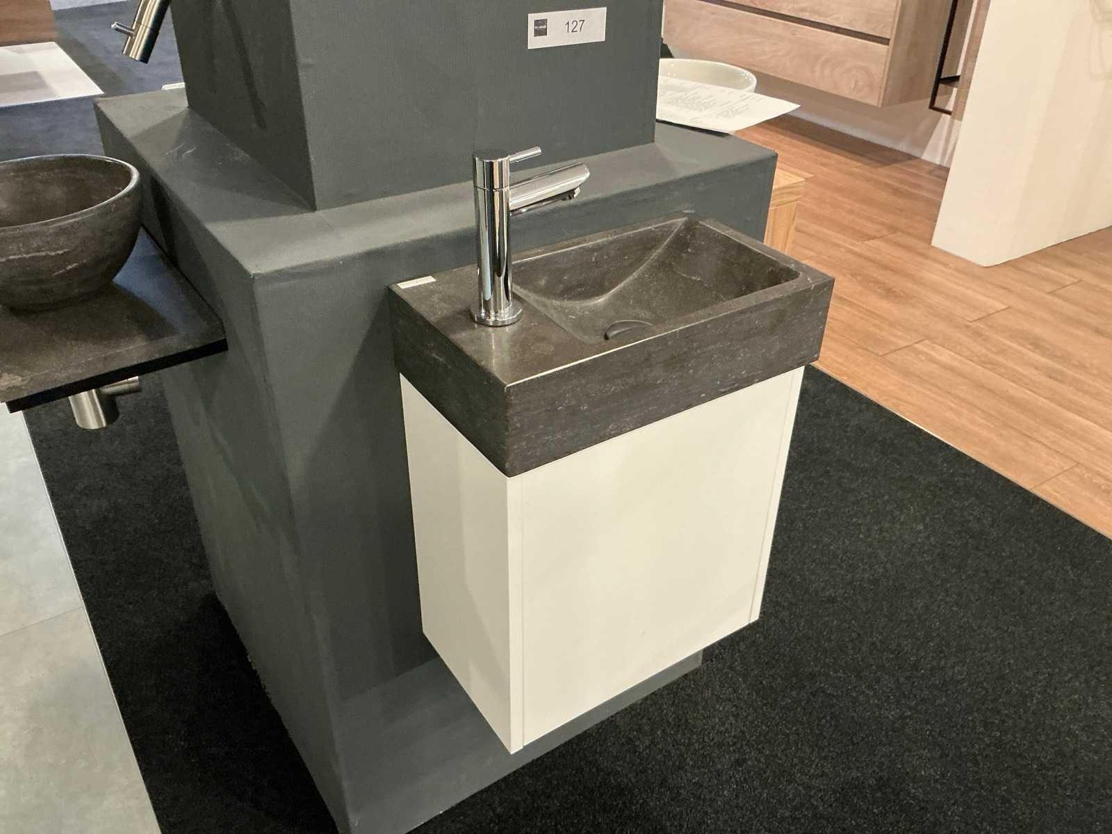Bestaande uit een plakspiegel 20x70cm, hardsteen fontein 40x 23x10cm met afbouwgedeelte fonteinkraan zonder inbouwgedeelte, hagelwit Loft onderkast met afdekblad (40x23x40cm) met 1 push to open deur. Merk: Sanibell Model: Proline Ink