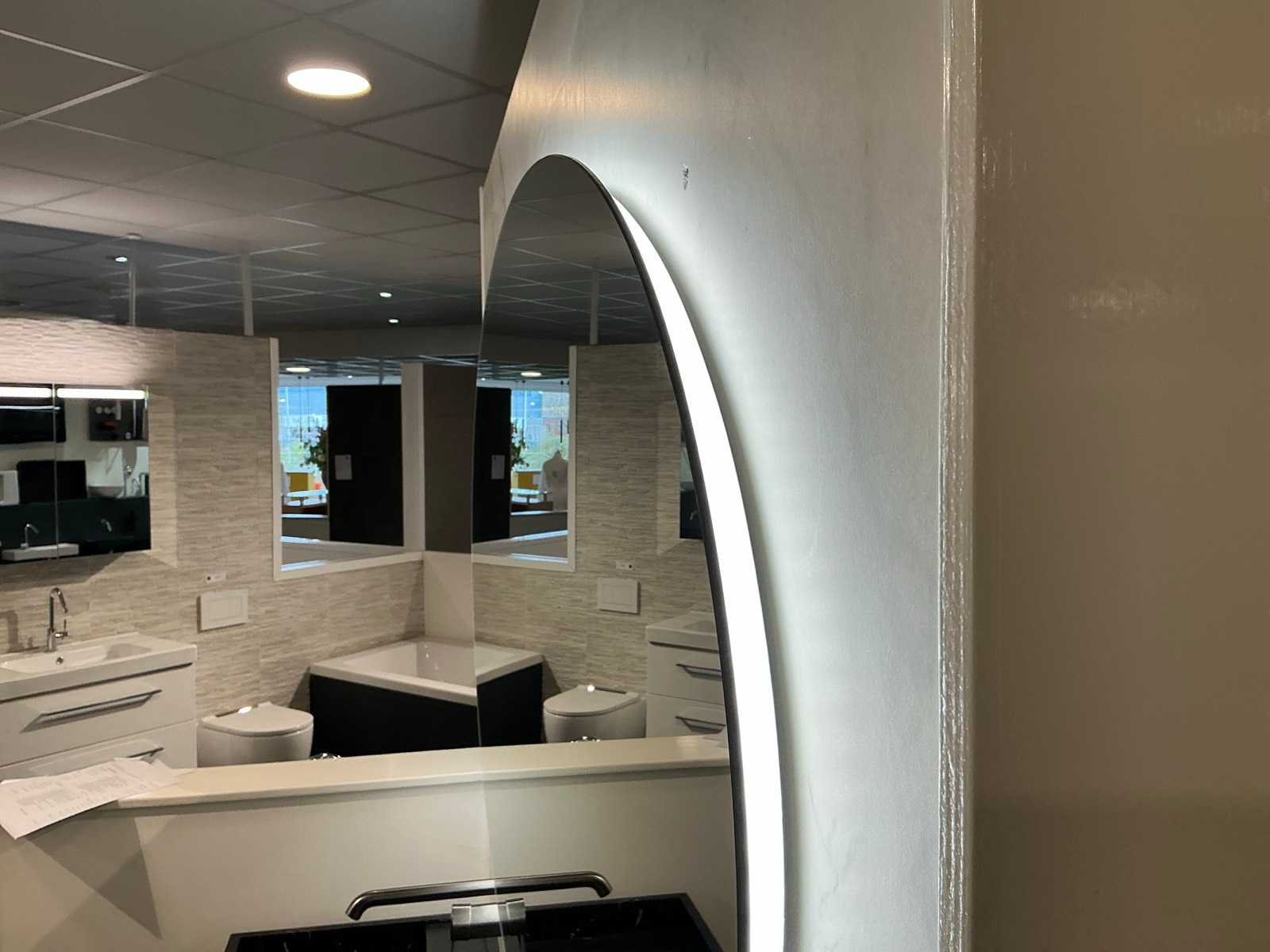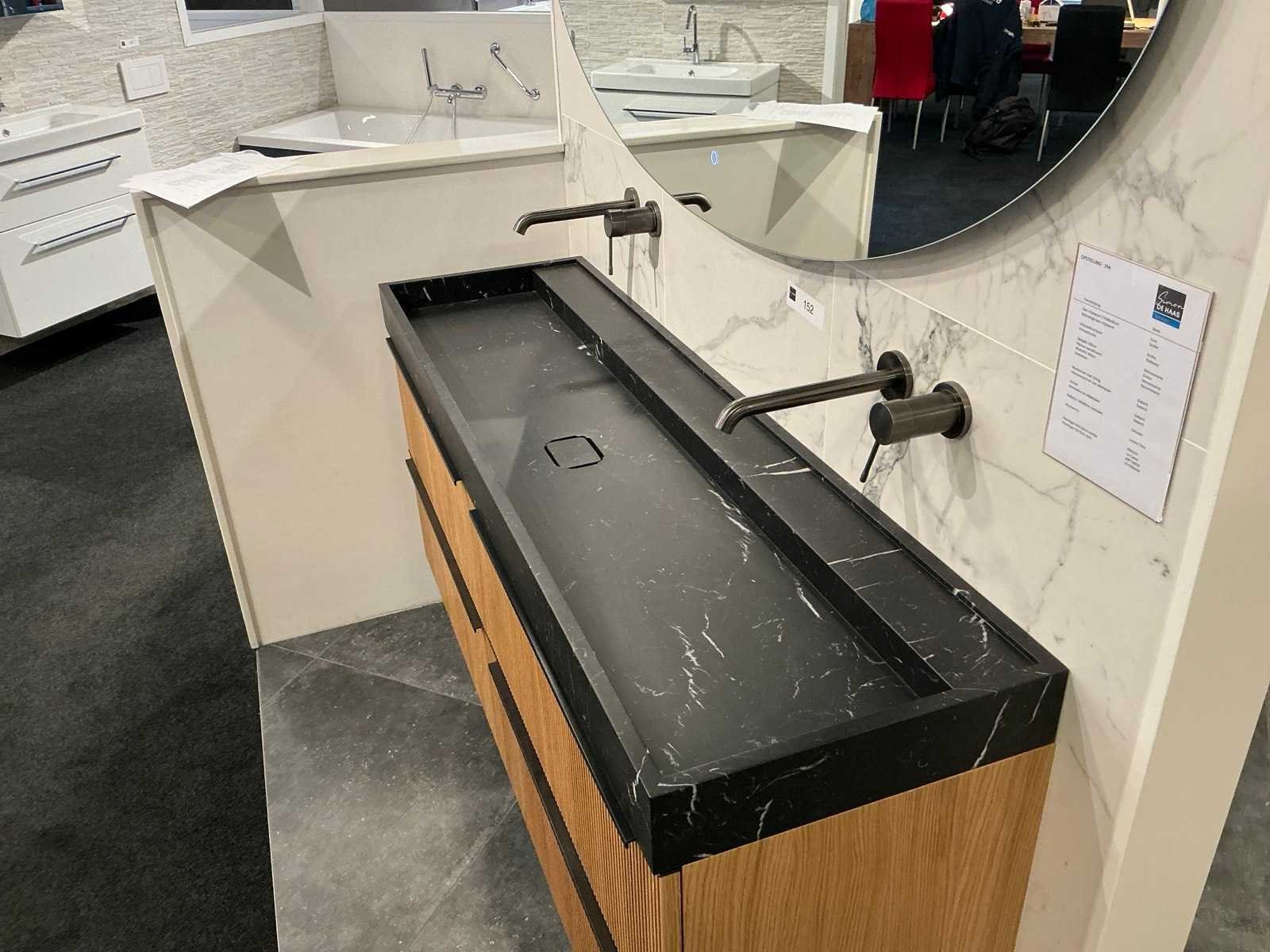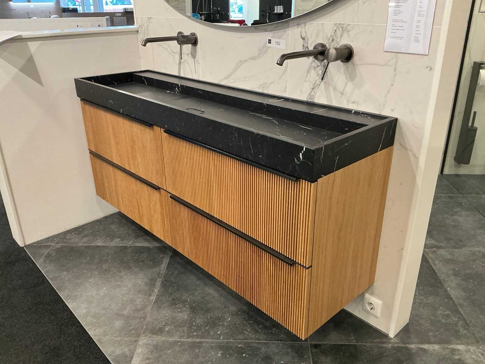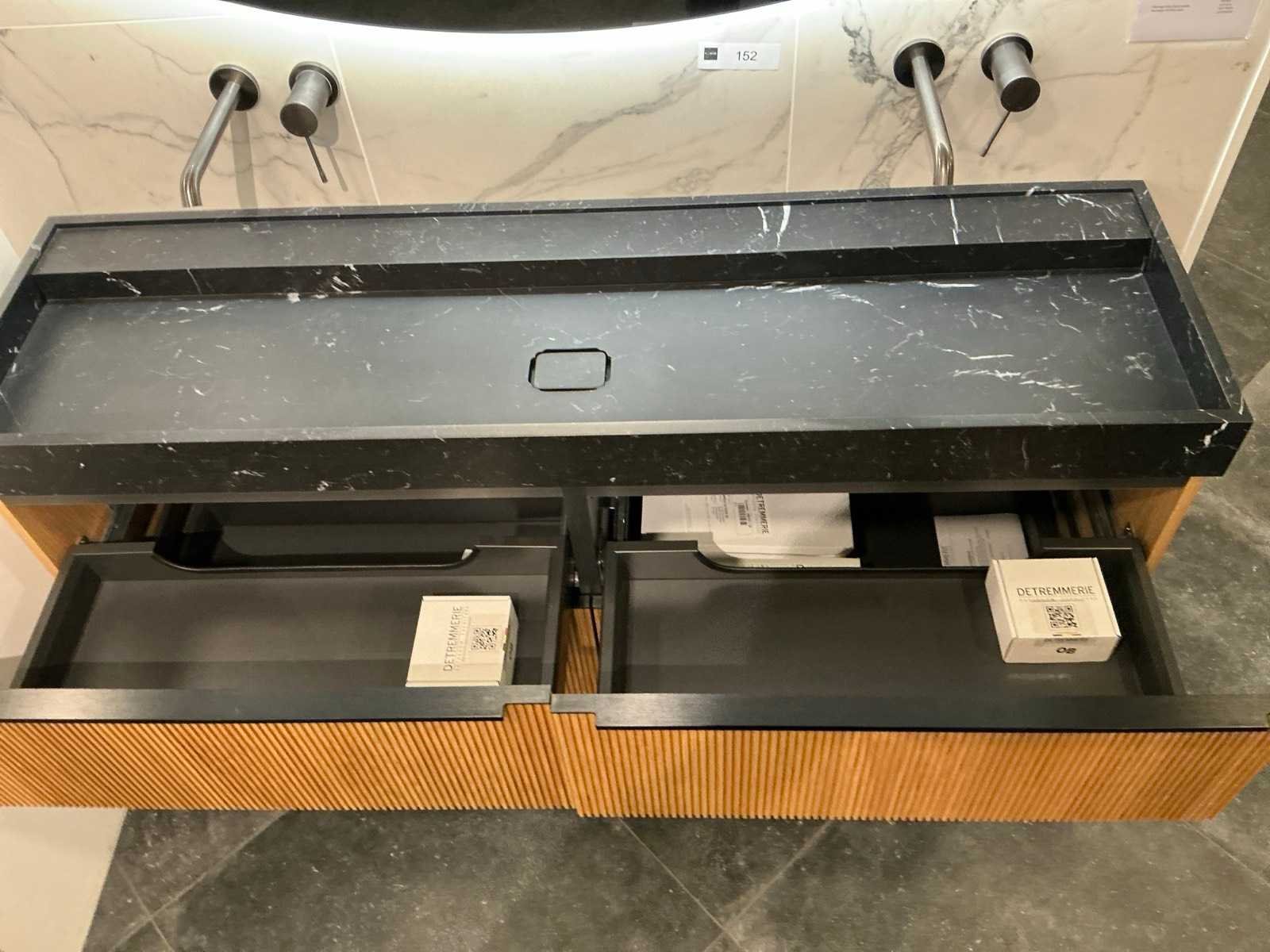 Bestaande uit een condensvrije LED spiegel 160cm ovaal, 160cm duowastafel (WT211 marmer), Licht eiken onderkast (160x45x59cm) met 4 lades, 2x opbouwgedeelte van Grohe inbouwwaskraan zonder inbouwgedeelte. Merk: Detremmerie Model: Negro