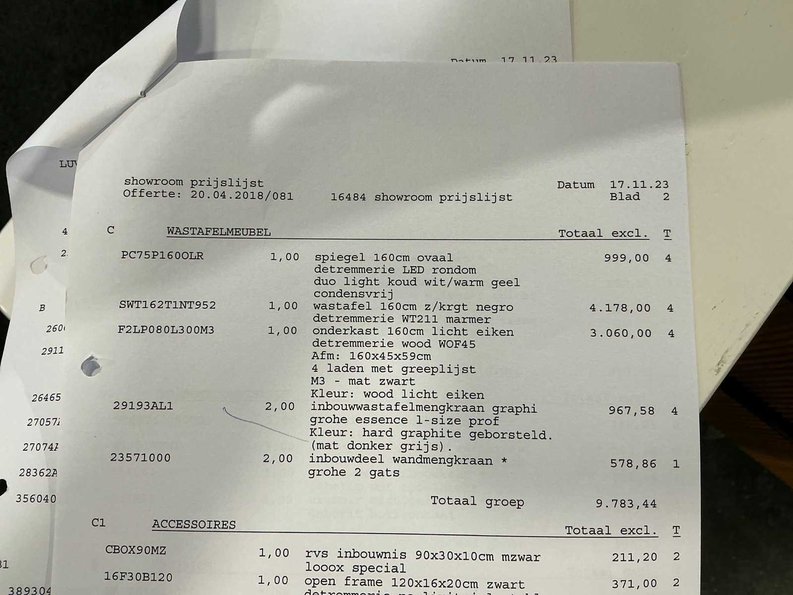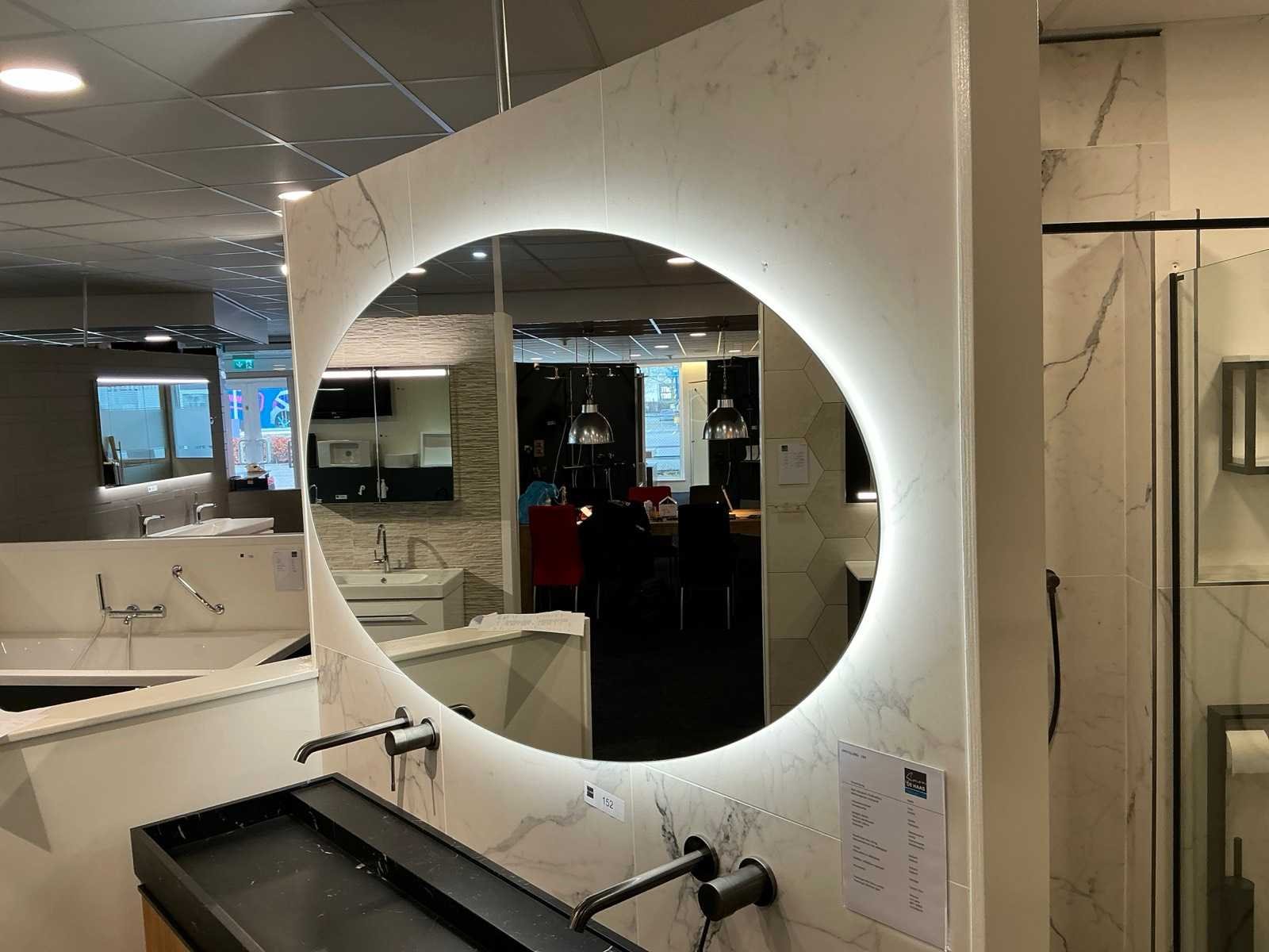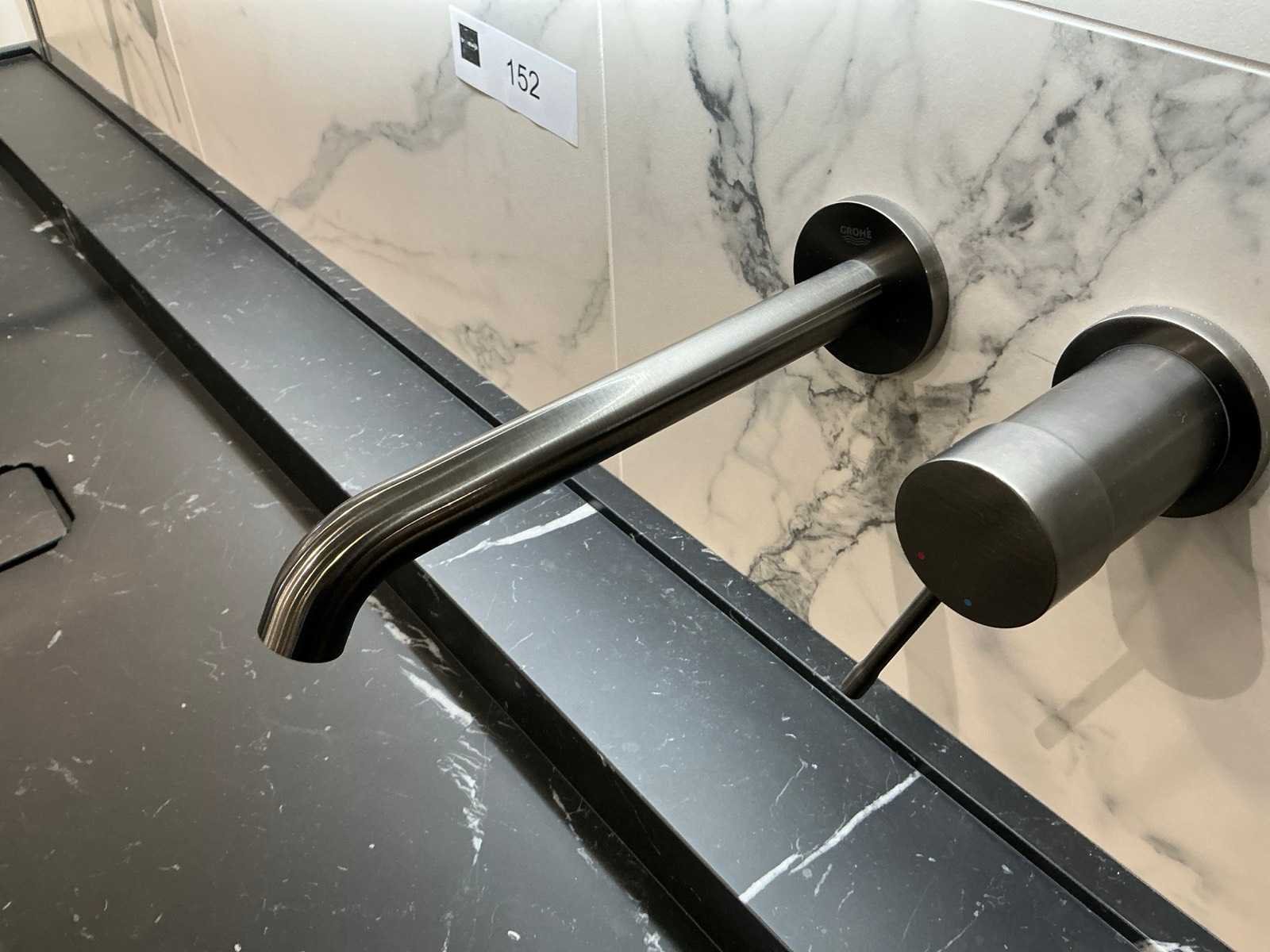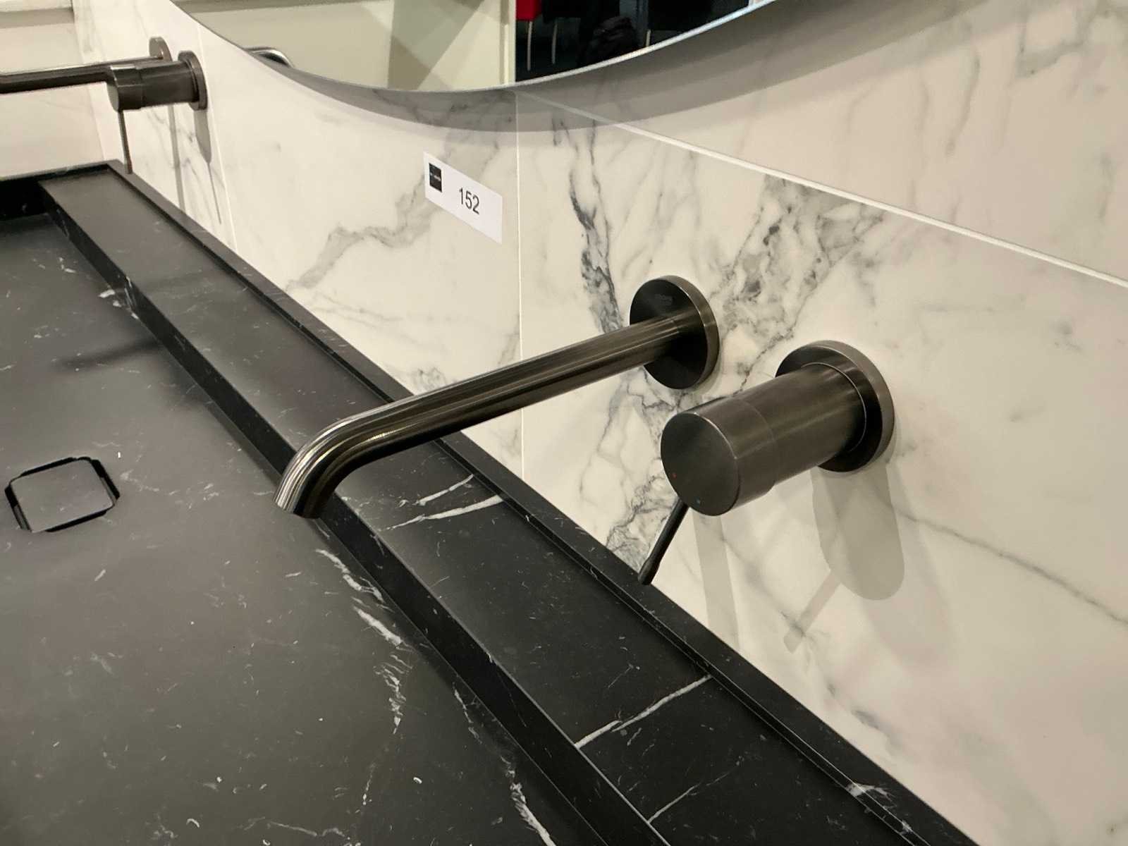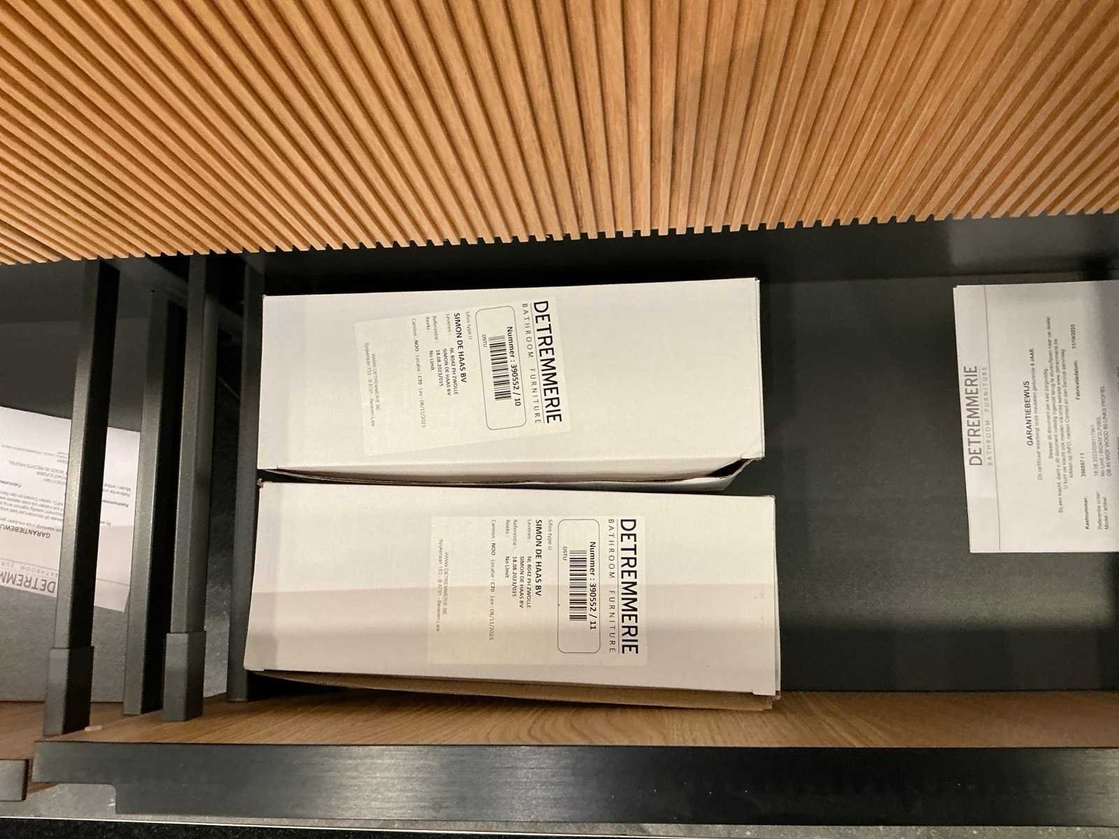 Bestaande uit een condensvrije LED spiegel 160cm ovaal, 160cm duowastafel (WT211 marmer), Licht eiken onderkast (160x45x59cm) met 4 lades, 2x opbouwgedeelte van Grohe inbouwwaskraan zonder inbouwgedeelte. Merk: Detremmerie Model: Negro