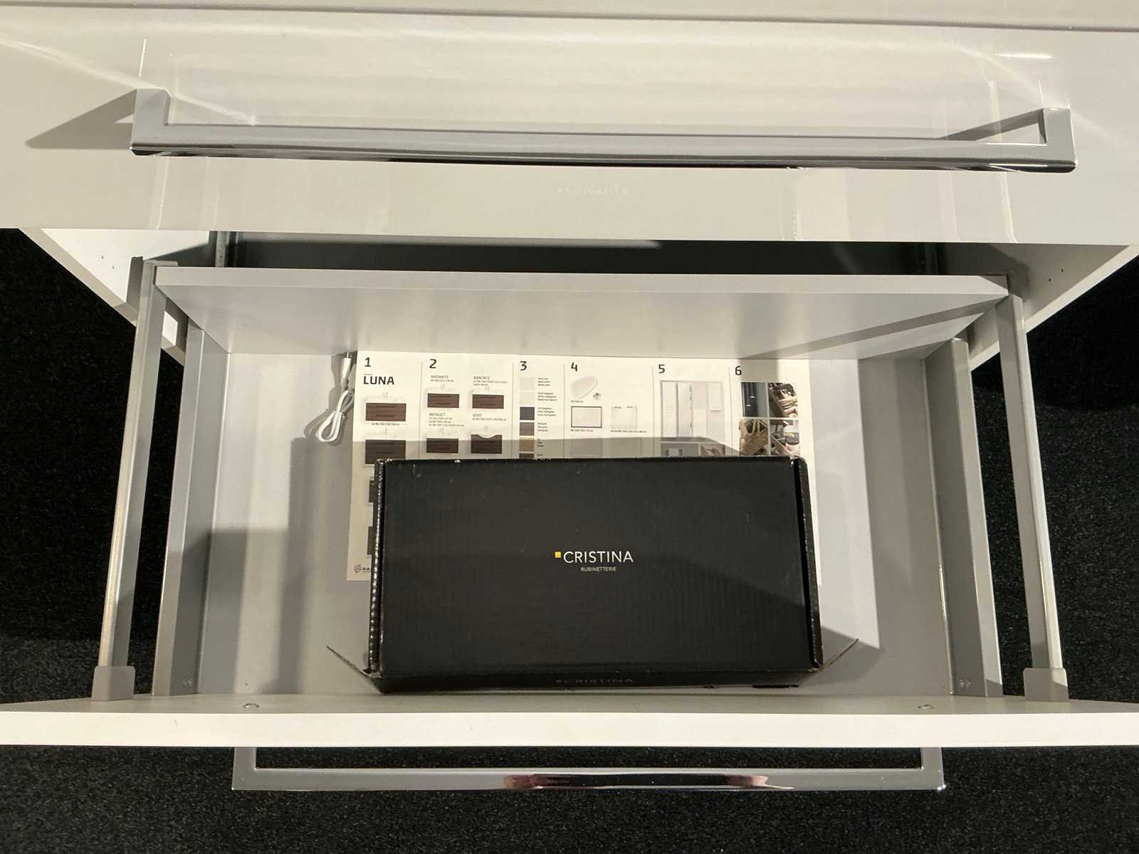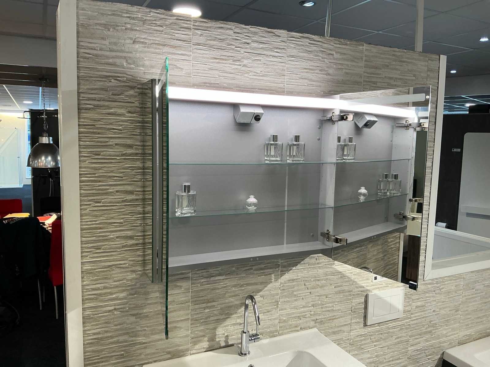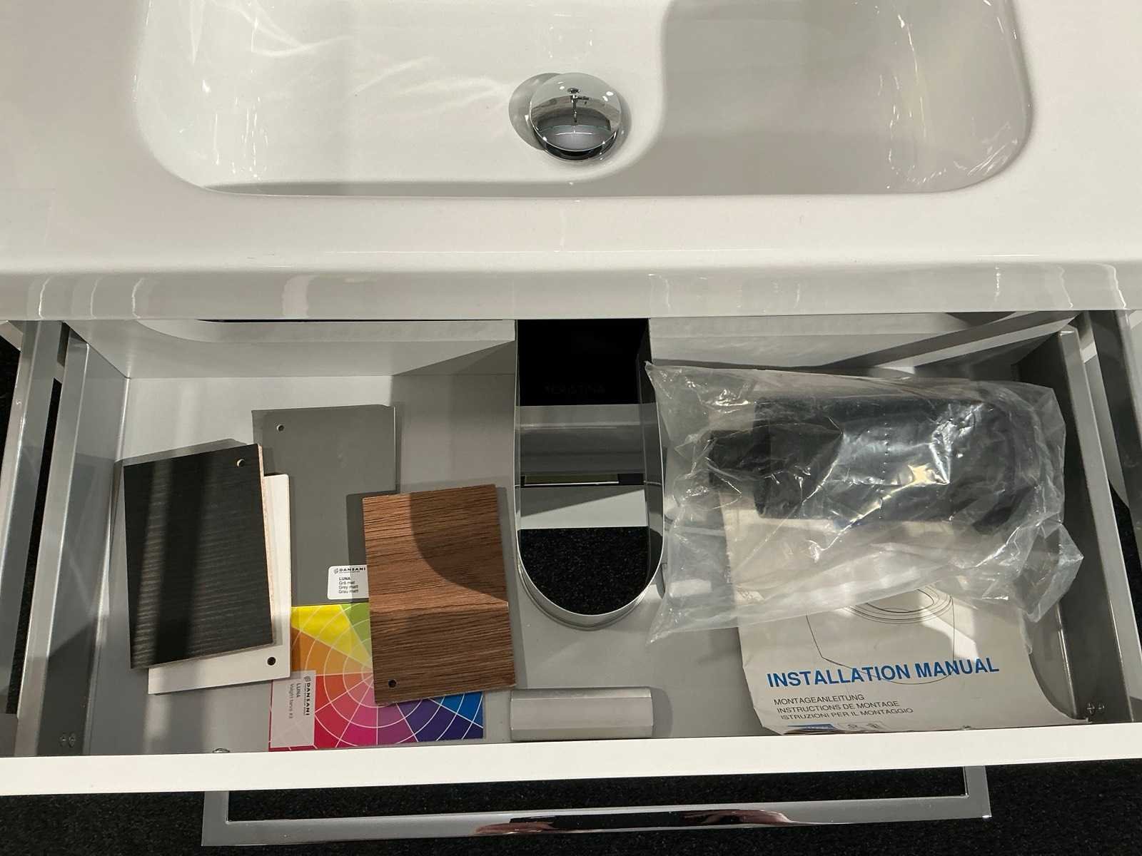 Bestaande uit Dansani LED spiegelkast(80x70cm)met 2 planchetten , Menuet wastafel (81x45,5cm) met Christina Pic wastafelkraan, onderkast (80x46x64,5cm) met 2 lades. Merk: Dansani Model: Luna