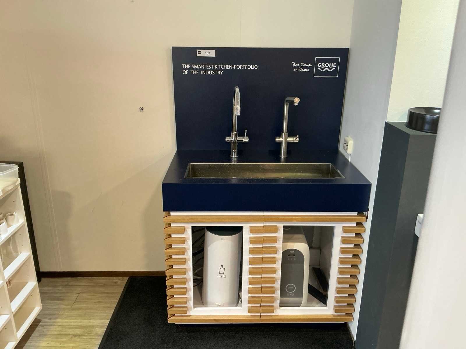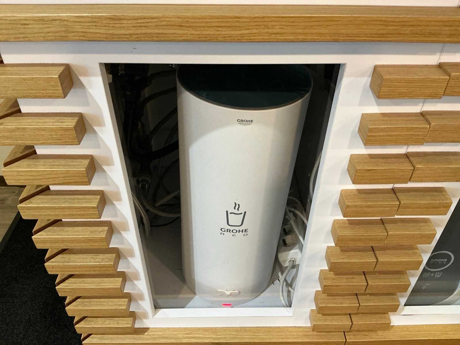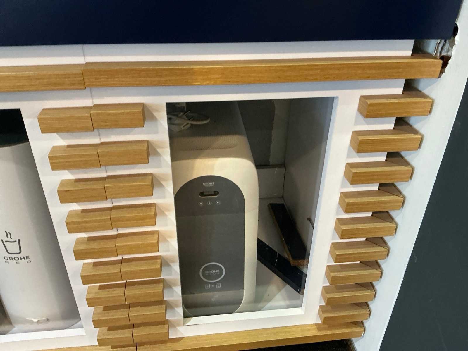 Dit kavel bestaat uit een demomeubel met wasbak met de Grohe Red en de Grohe Blue boilers met kranen. Dit kavel is aangesloten op het waternet en dient professioneel gedemonteerd en afgedopt te worden. Merk: Grohe Model: Blue en Red Lengte: 100cm Breedte: 60cm Hoogte: 153cm