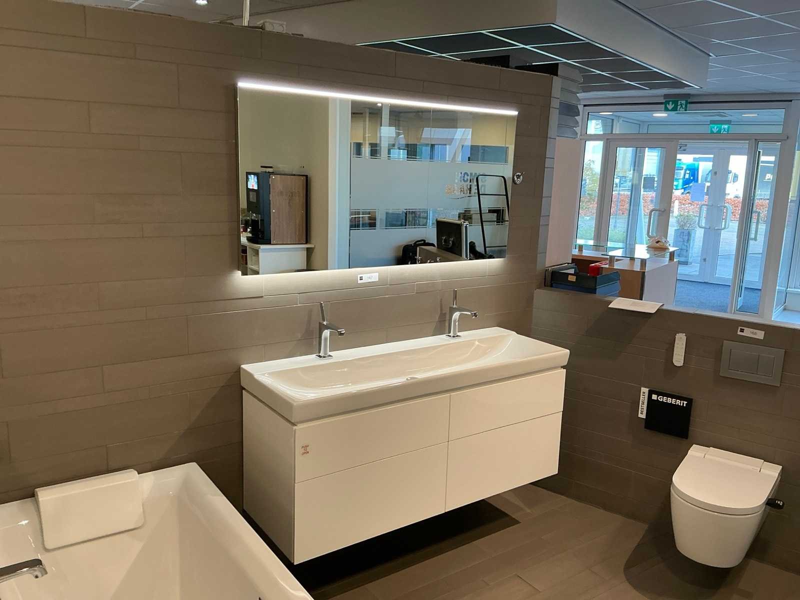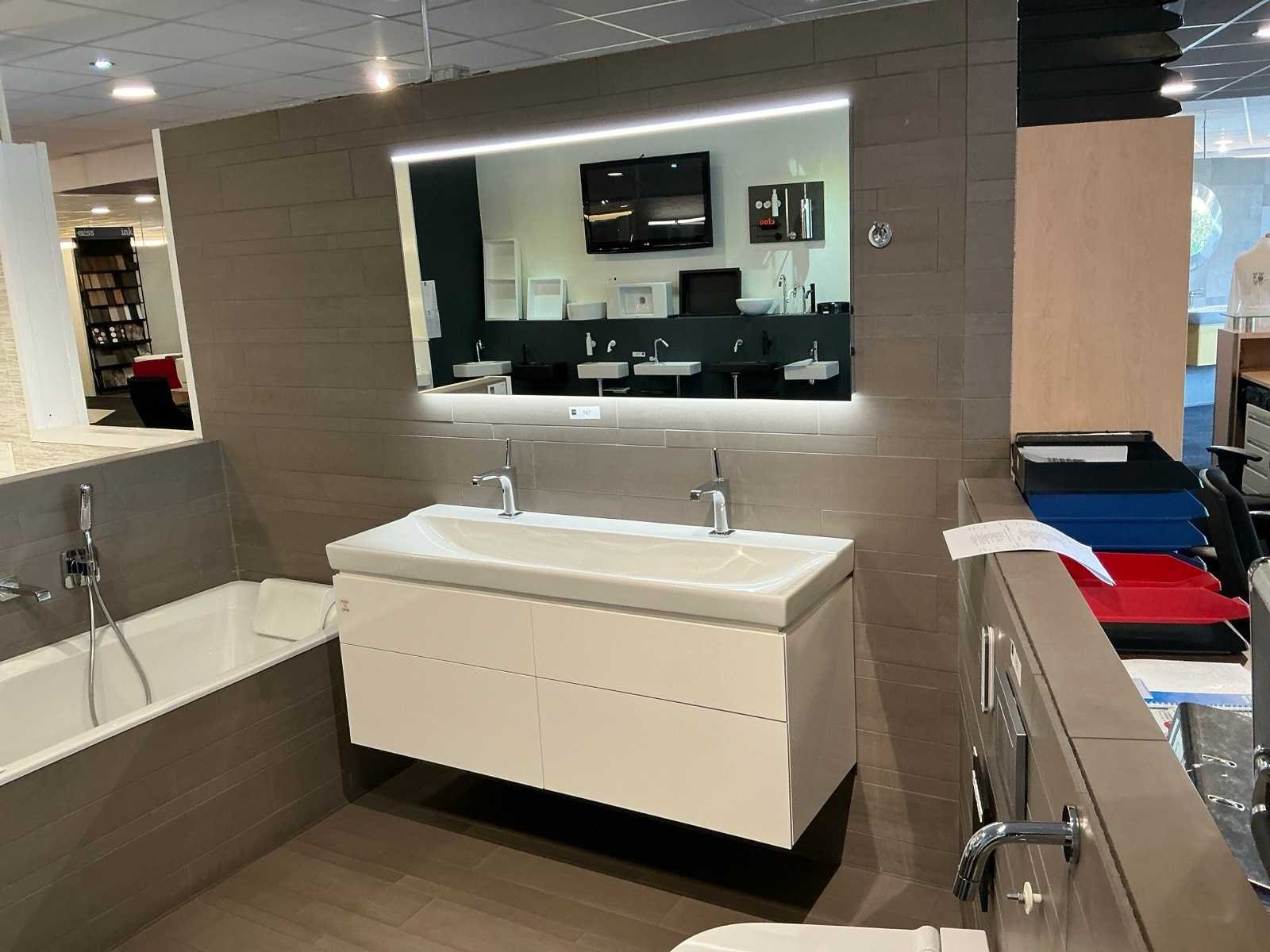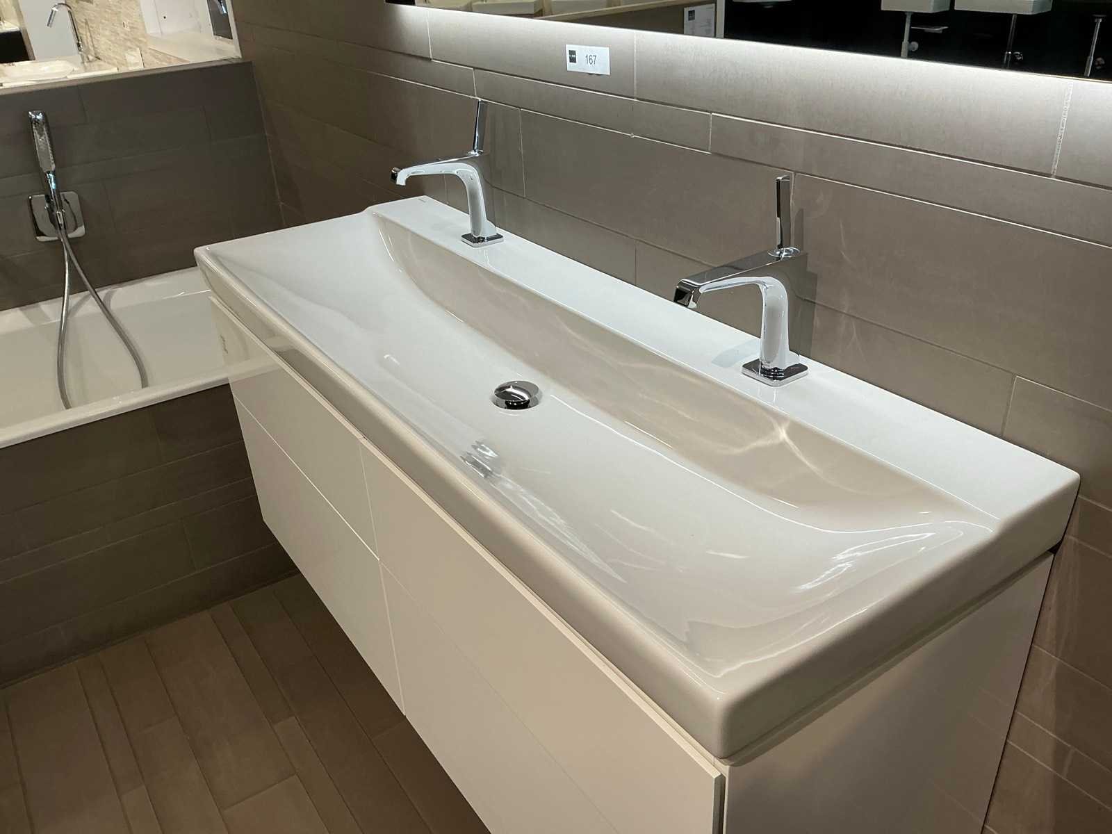 Bestaande uit een Hipp lichtspiegel (140x70cm) met verwarming, 140cm duowastafel zonder overloop, onderkast(140x47x51cm) met 4 asymmetrische lades, 2x Hansgröhe Axor CitterionE wastafelmengkraan. Merk: Geberit Model: Xeno 2