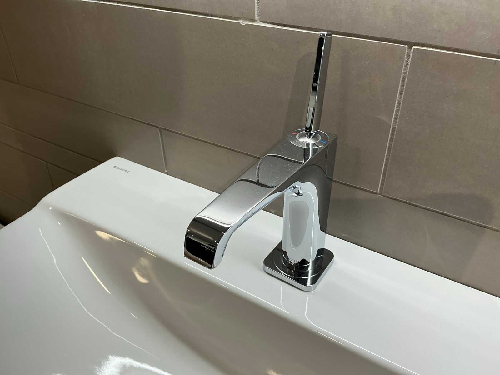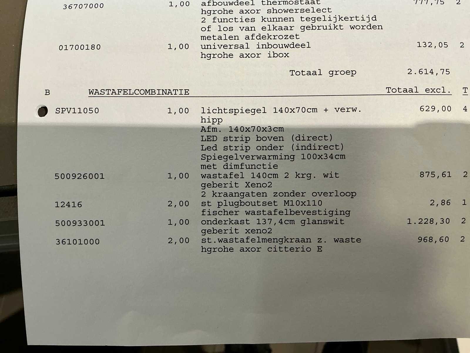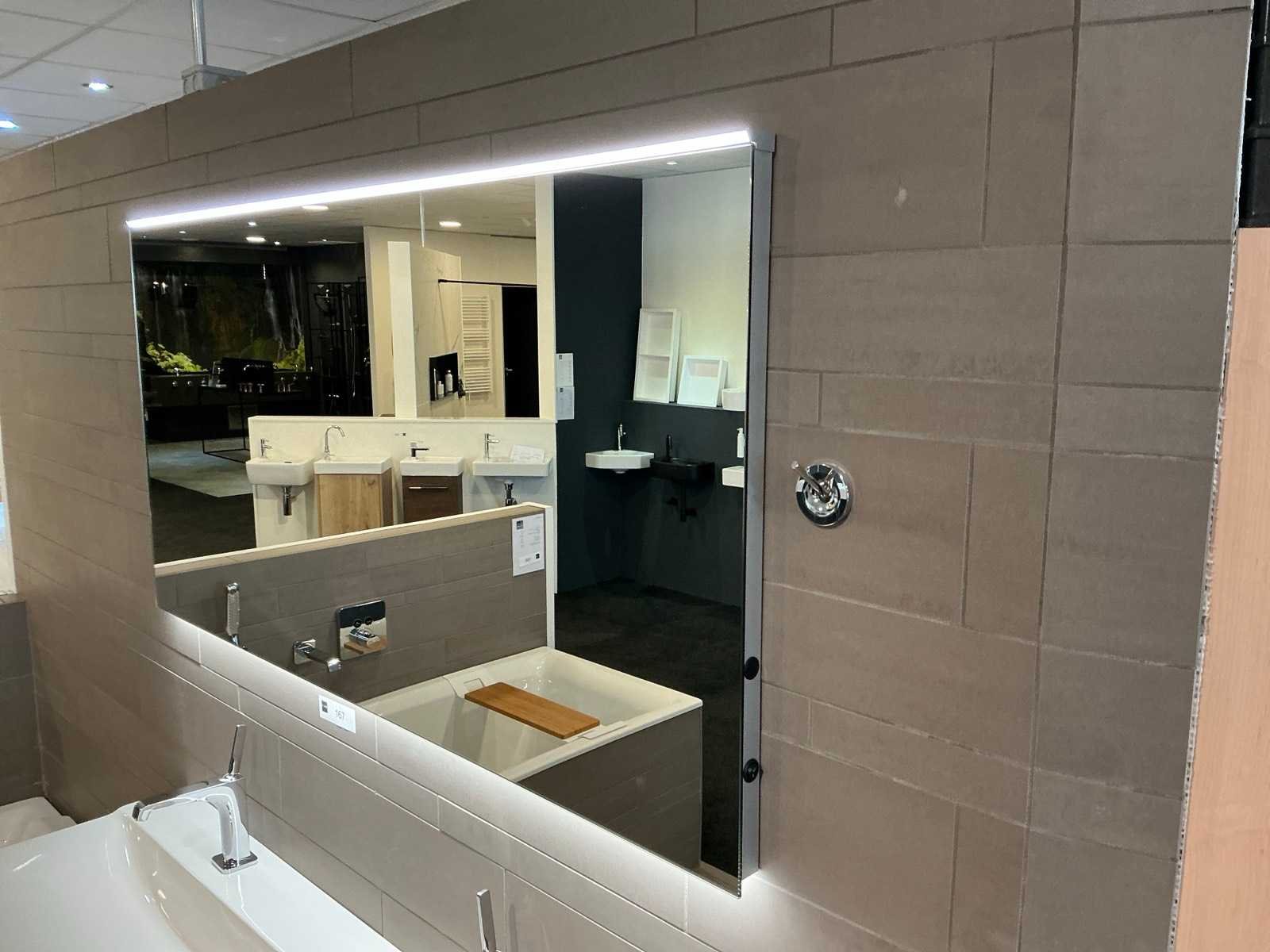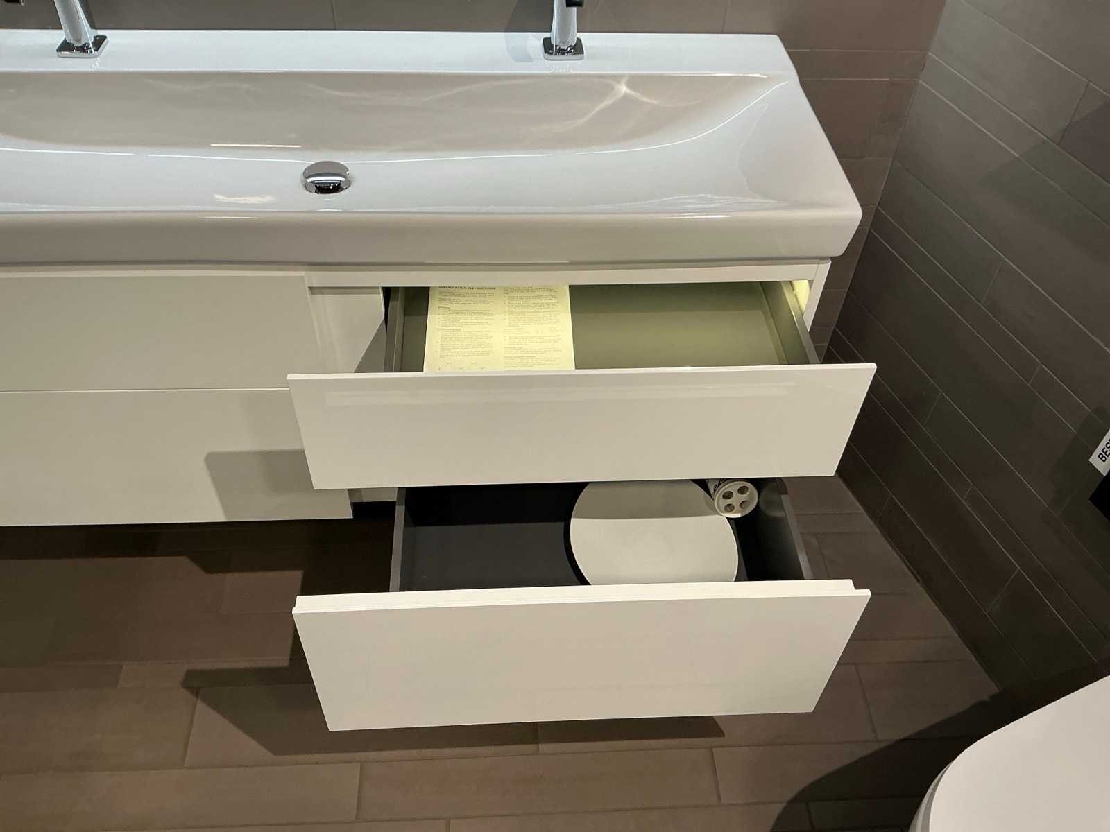 Bestaande uit een Hipp lichtspiegel (140x70cm) met verwarming, 140cm duowastafel zonder overloop, onderkast(140x47x51cm) met 4 asymmetrische lades, 2x Hansgröhe Axor CitterionE wastafelmengkraan. Merk: Geberit Model: Xeno 2