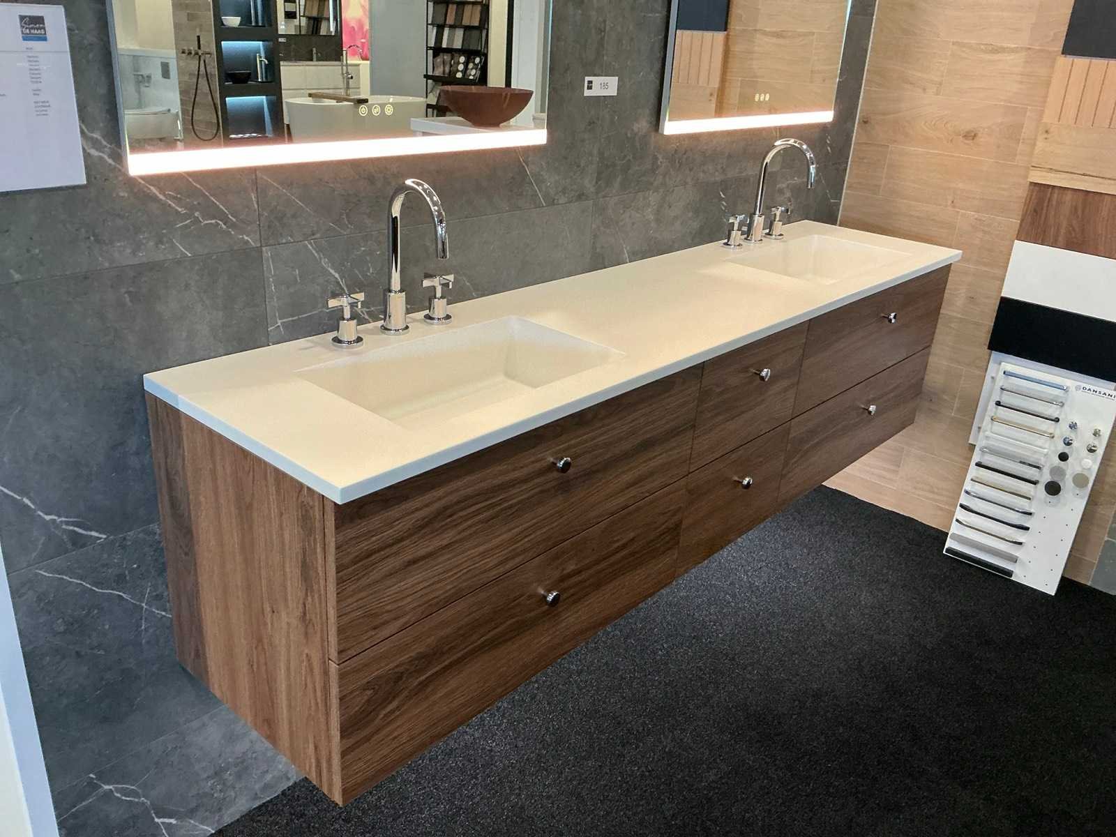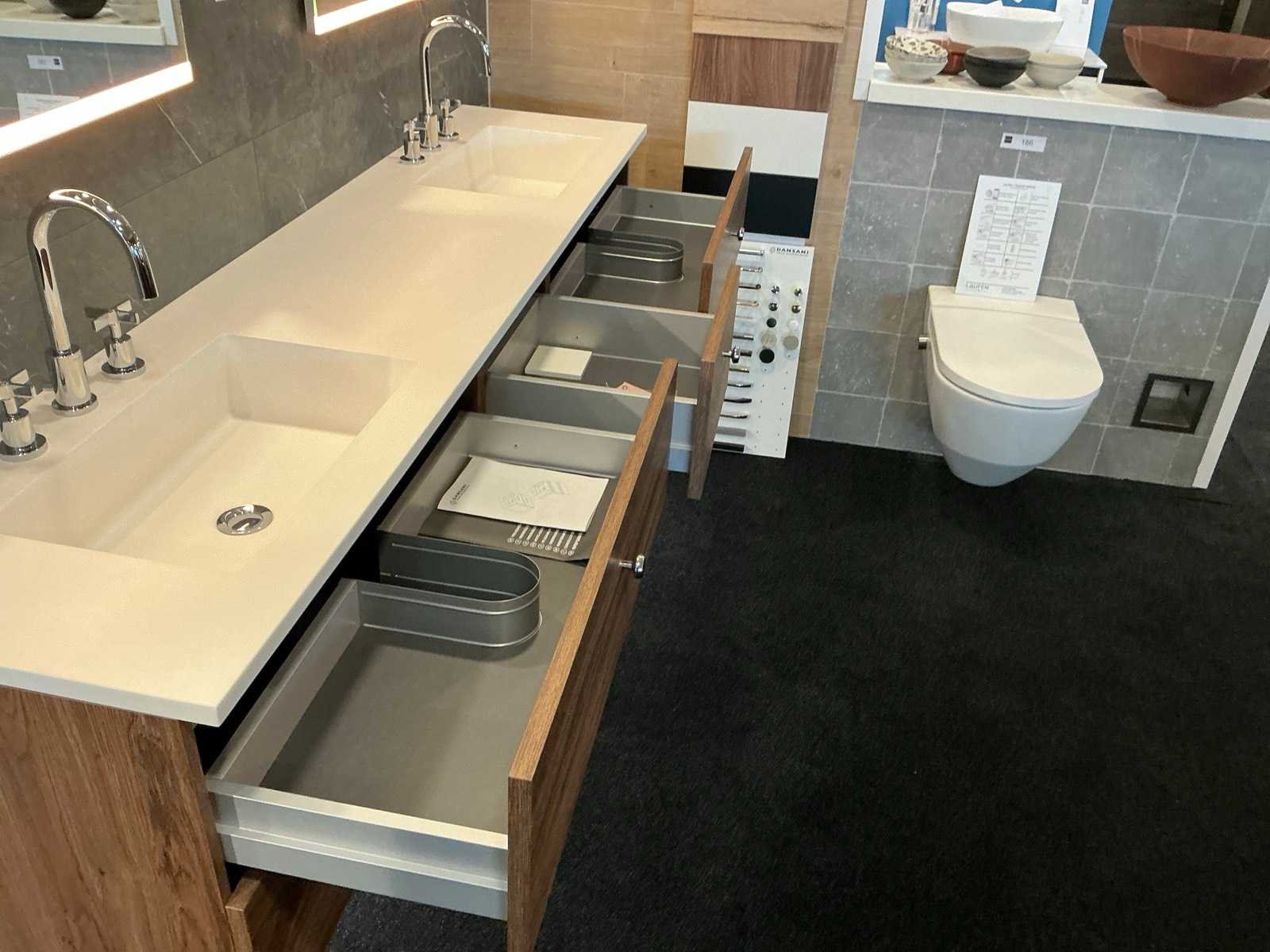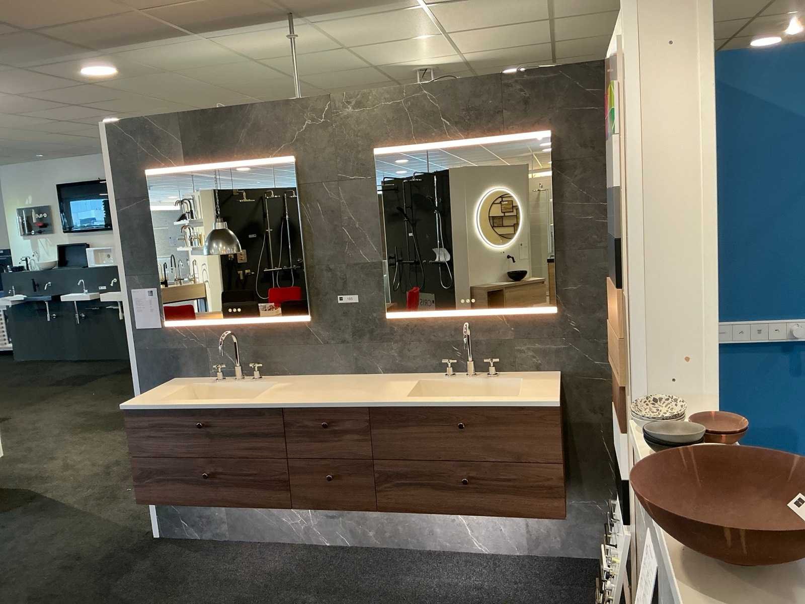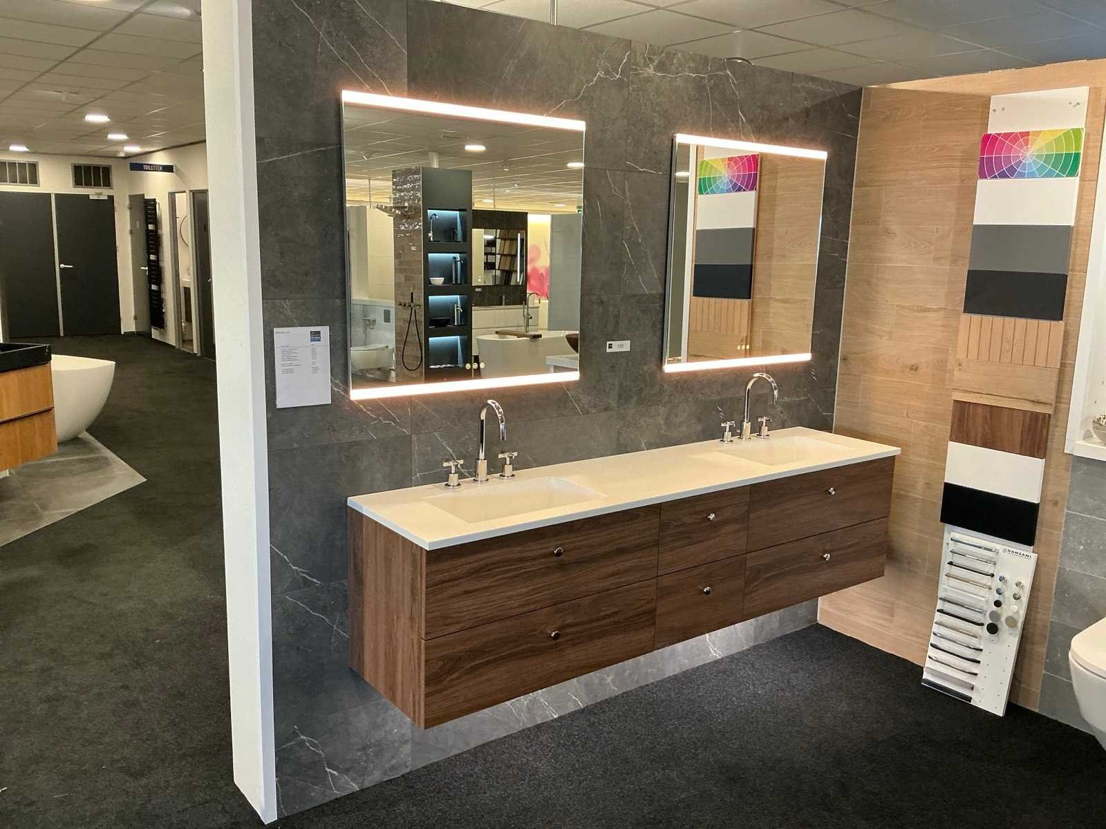 Bestaande uit 2x lichtspiegel (80x80cm), Custom maatwerk duowastafel 200cm, 2x onderkast bruin eiken(80x44x48cm) met 2 lades, 1x onderkast bruin eiken (40x44x48cm), 2x Cristina Cross Road wastafelmengkraan. Merk: Dansani Model: Luna