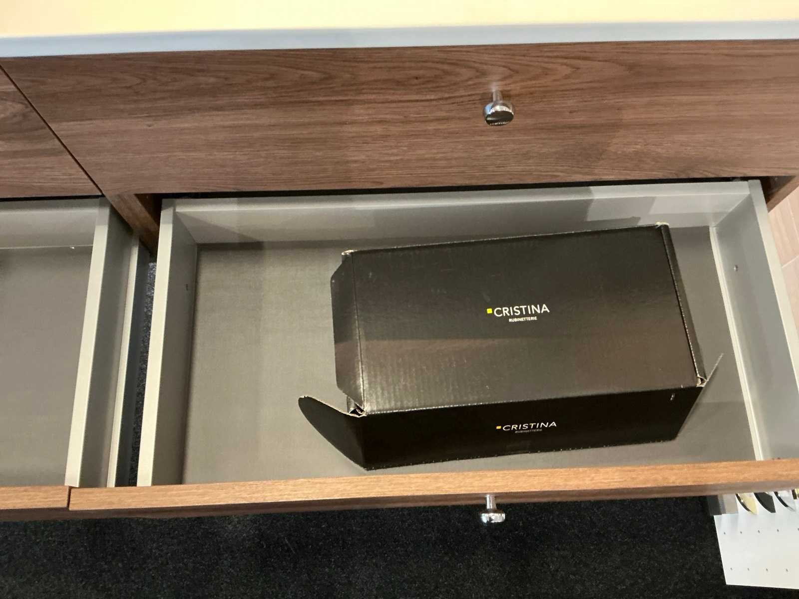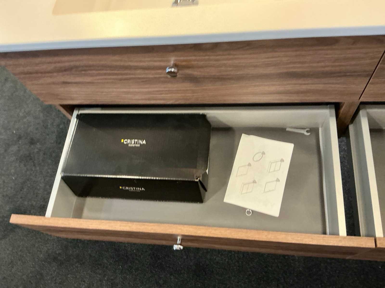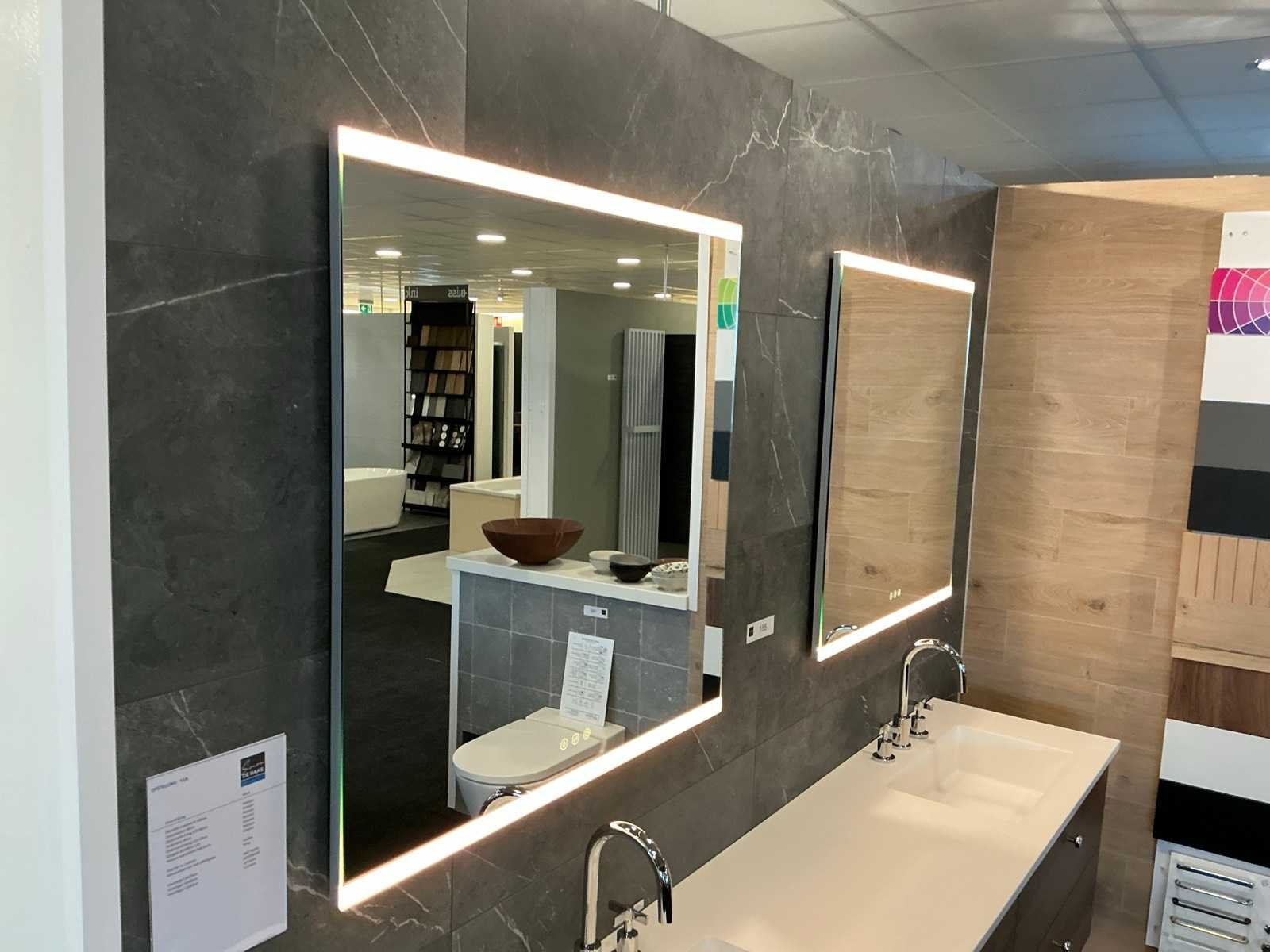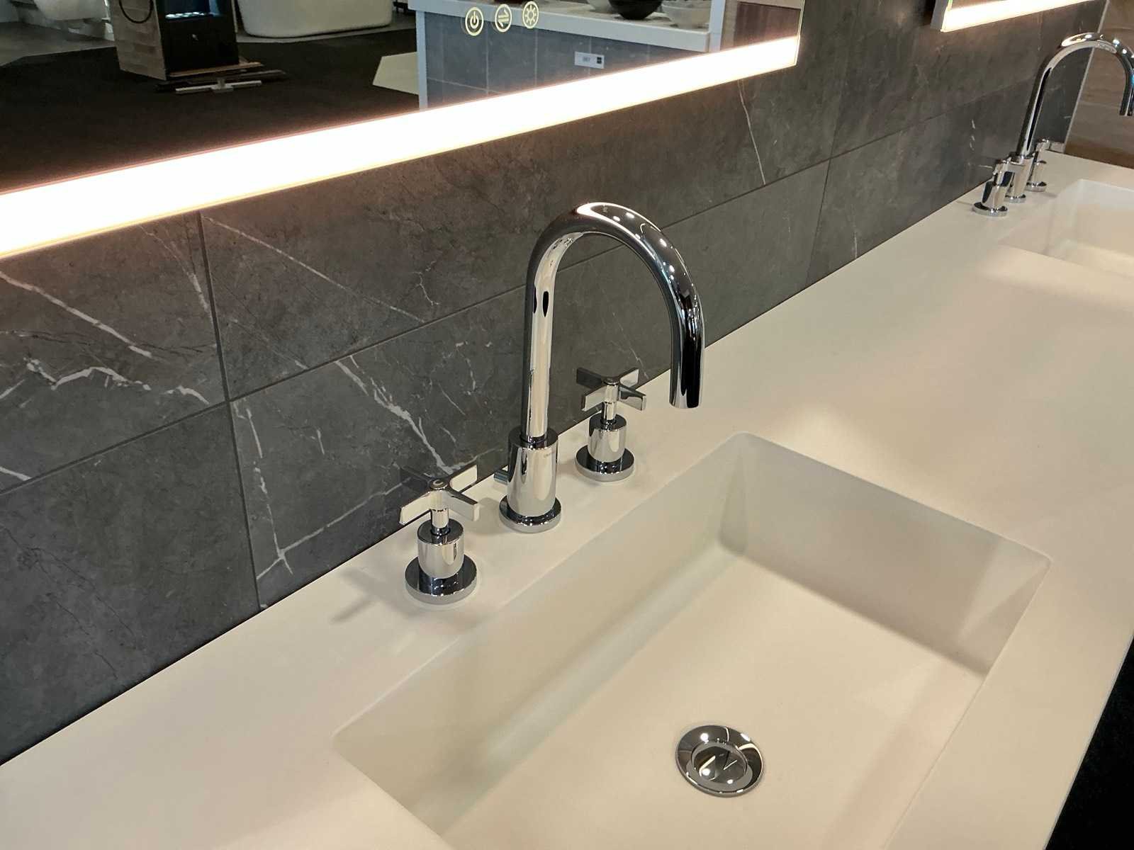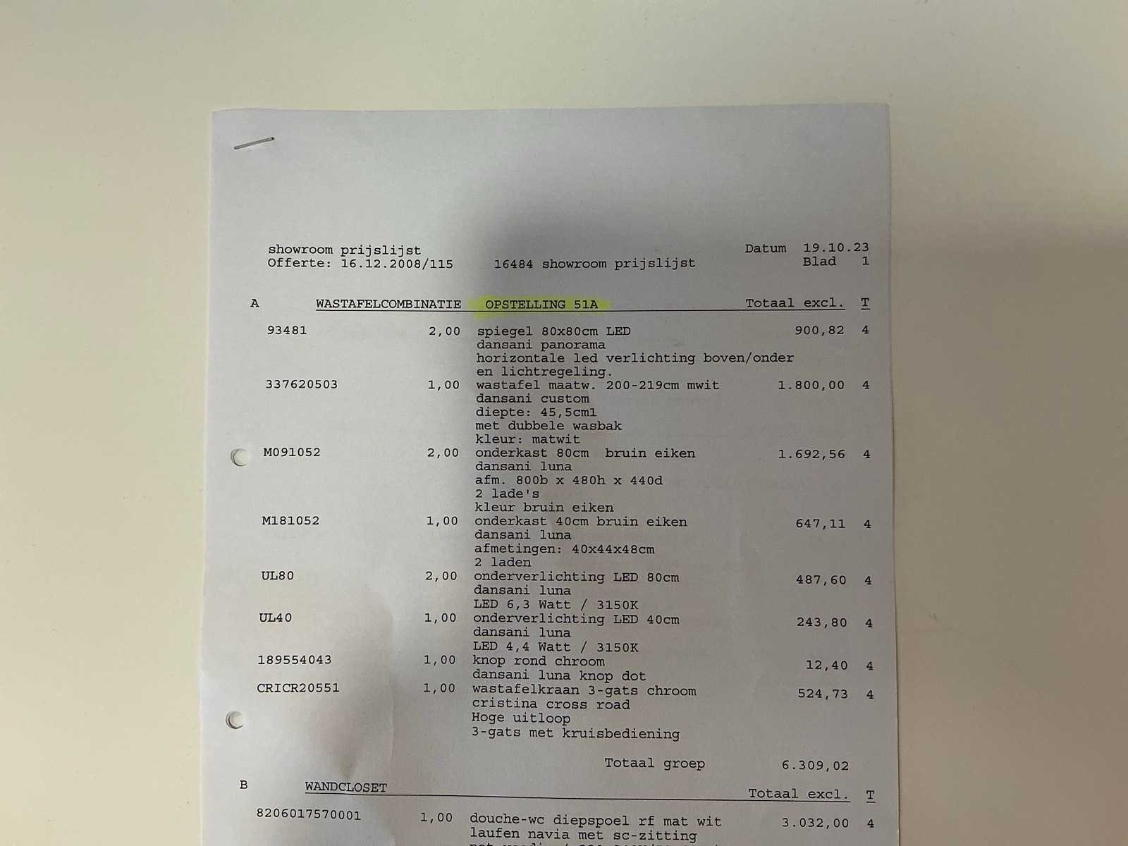 Bestaande uit 2x lichtspiegel (80x80cm), Custom maatwerk duowastafel 200cm, 2x onderkast bruin eiken(80x44x48cm) met 2 lades, 1x onderkast bruin eiken (40x44x48cm), 2x Cristina Cross Road wastafelmengkraan. Merk: Dansani Model: Luna