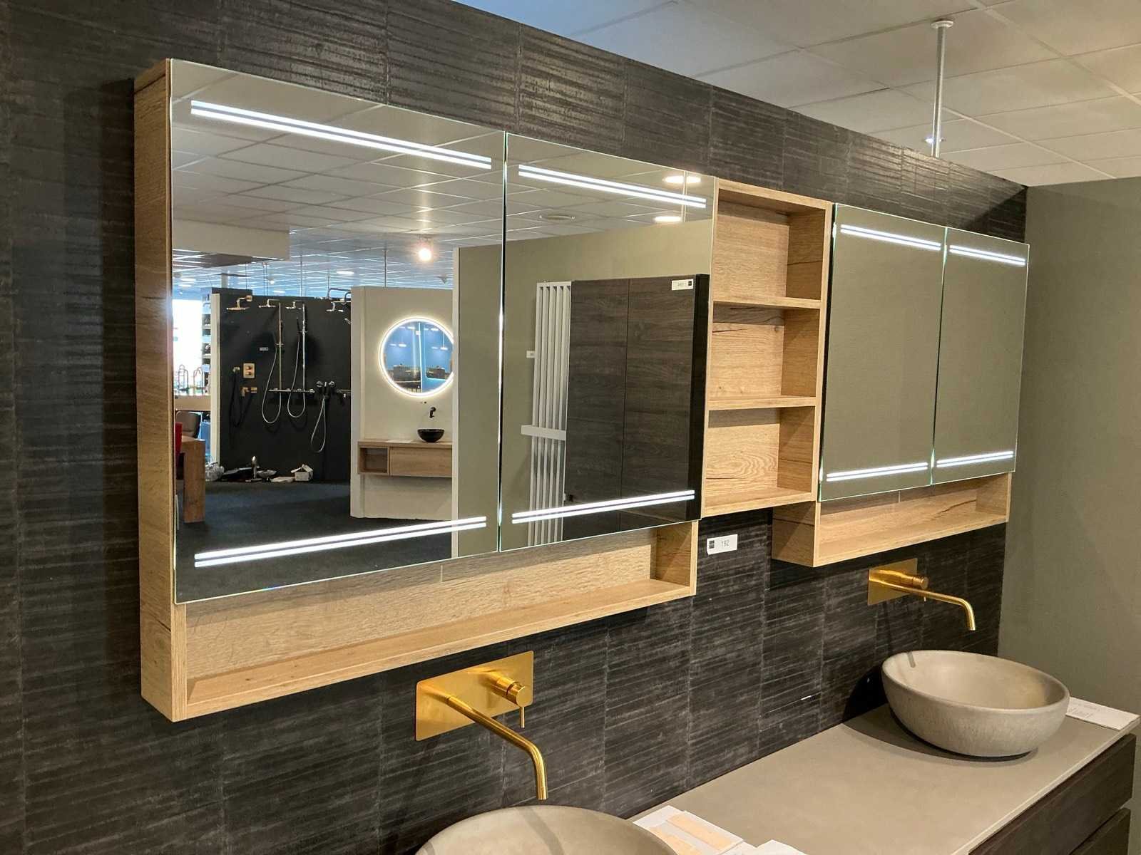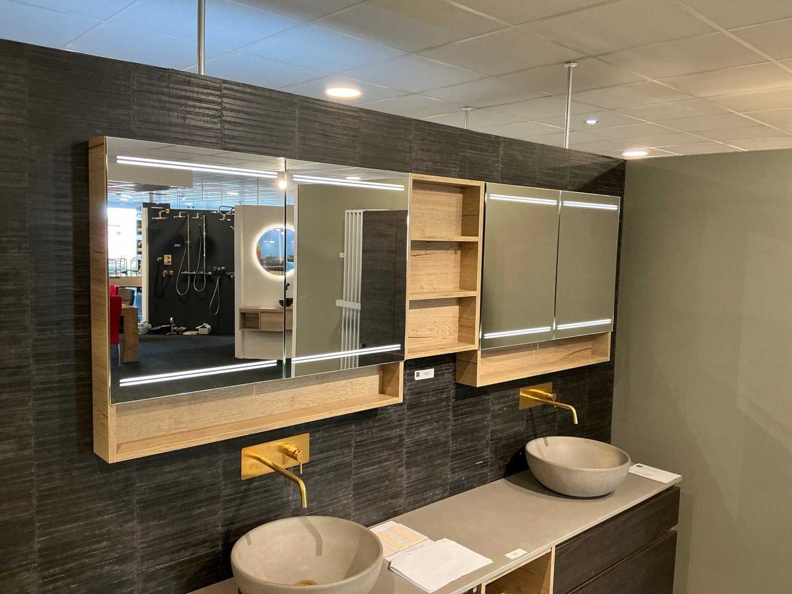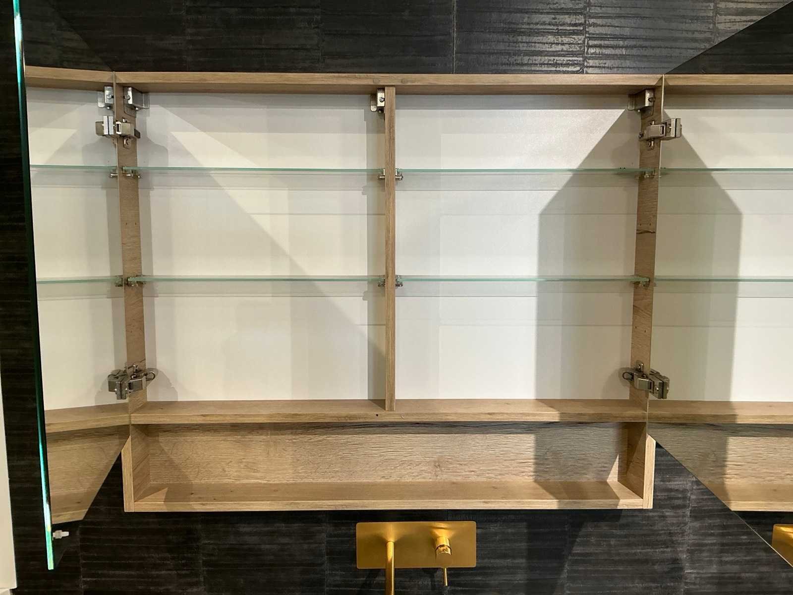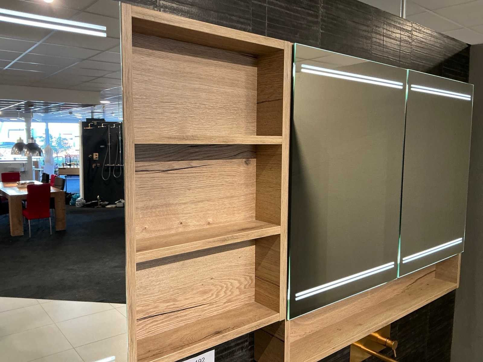 Voorzien van open tussenkast (40x12x65cm). Elke kast is voorzien van 4 glazen planchetten. Zelfde design als kavel 193 en 194 Merk: Primabad Model: Halifax Oak Lengte: 100cm Breedte: 12cm Hoogte: 80cm