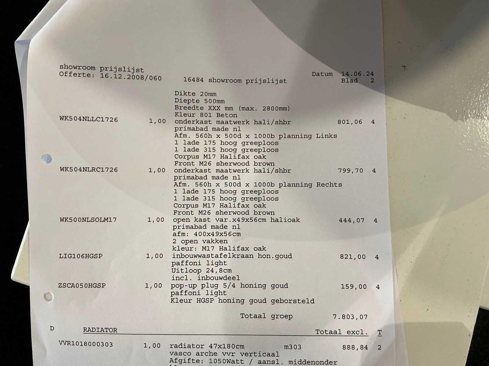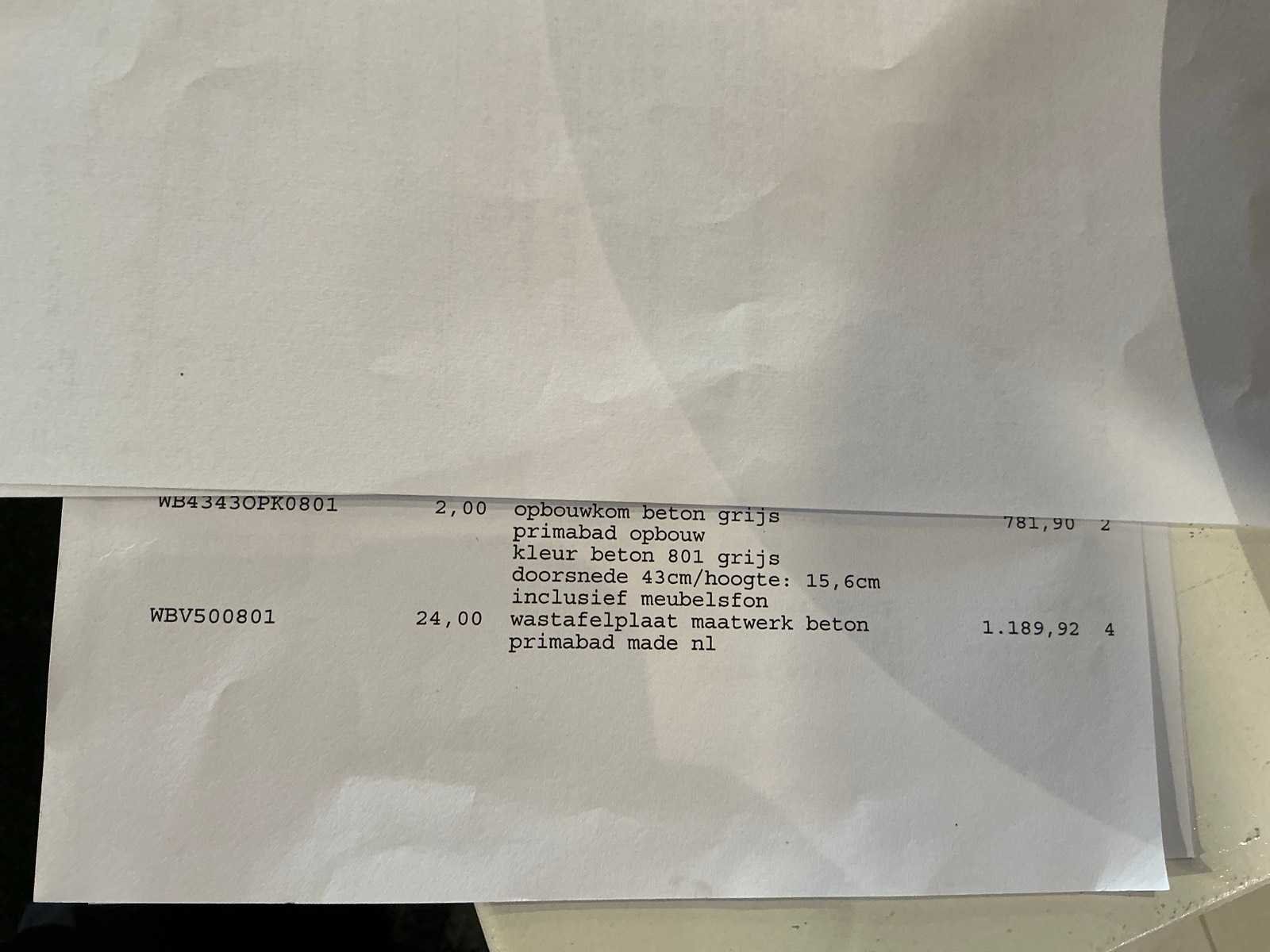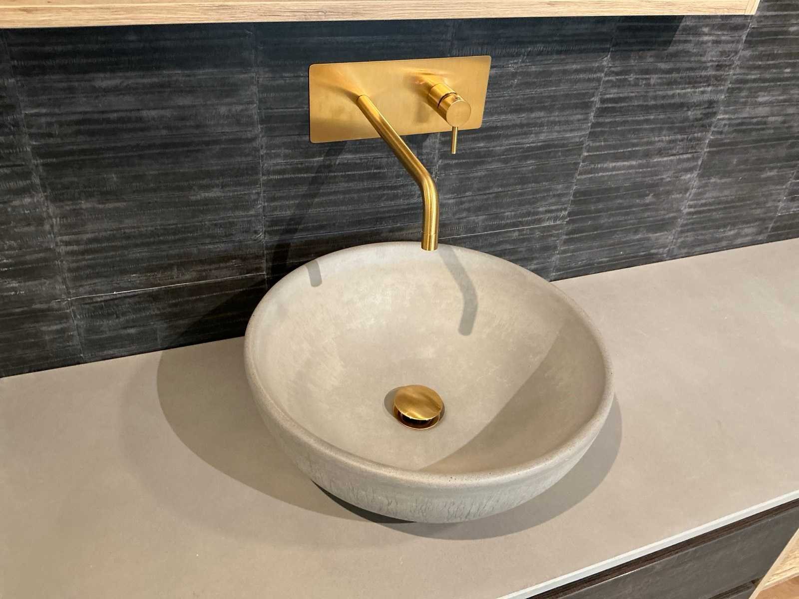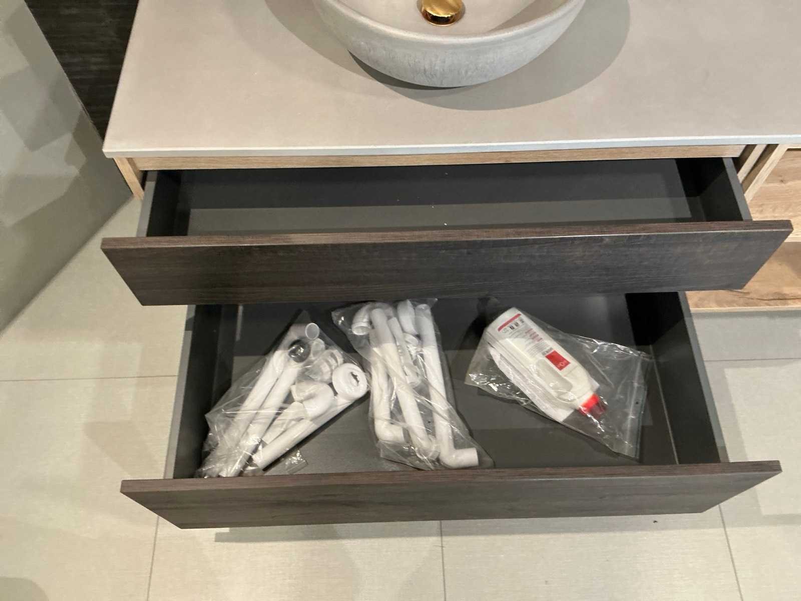 Bestaande uit 2x onderkast (56x50x100cm)met asymmetrische lades,open tussenkast (40x49x56cm), 2x waskom beton grijs (kleur 801) 43x15,6cm, wastafelplaat maatwerk beton (240x50x2cm), Paffoni Light opbouwgedeelte wastafelkraan zonder inbouwgedeelte . Zelfde design als kavel 192en 194 Merk: Primabad Model: Halifax Oak Lengte: 100cm Breedte: 12cm Hoogte: 80cm