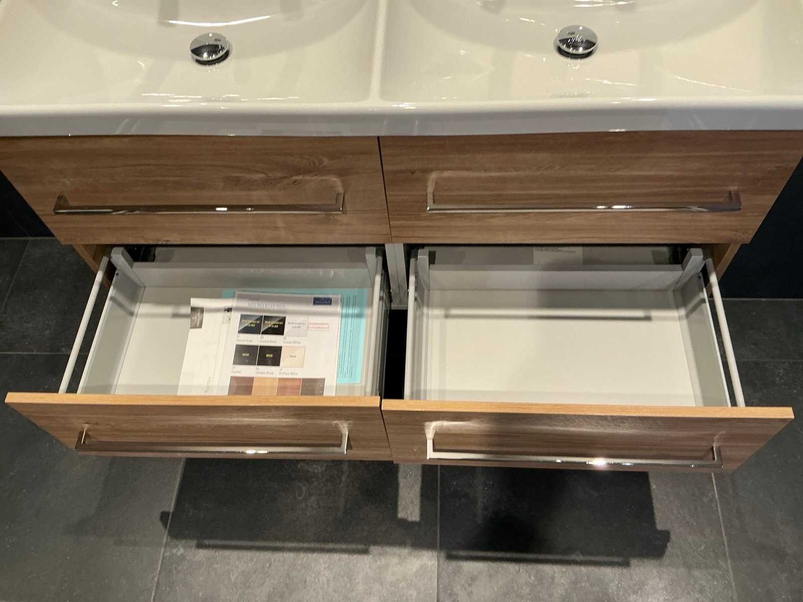 Bestaande uit Duowastafel 120x47cm met onderkast (kleur Kansas Oak)118x51,4x45,2cm , 2x Cristina wastafelkraan Prime chroom, Villeroy & Boch More to See Spiegel 120x60x3cm. Merk: Villeroy & Boch Model: Avento