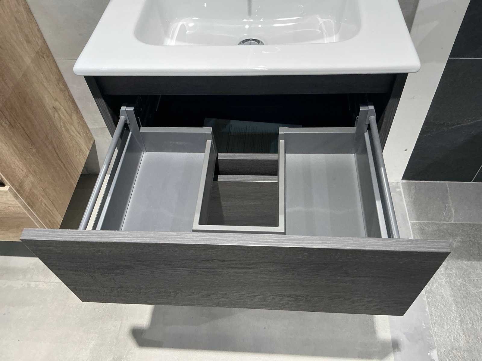 Bestaande uit Primabad Third Edition wastafel 60cm, Primabad spiegel met schakelaar 50x100cm, Primabad third edition Antraciet Oak ondertafel 60cm, Hansgröhe eenhendel wastafelmengkraan Focus 70 Care. Merk: Primabad / Hansgröhe