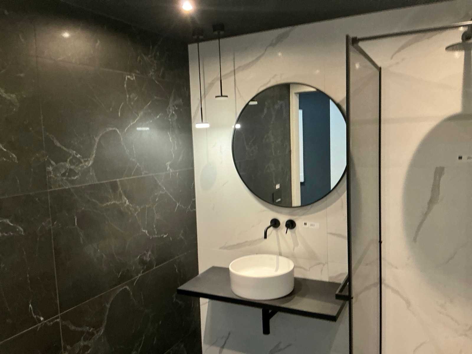 Bestaande uit Primabad 80cm spiegel, 2x Dansani you LED plafond pendellamp, Villeroy & Boch Collaro wastafel rond 40cm, houtskool eiken afdekplank. Merk: Villeroy & Boch