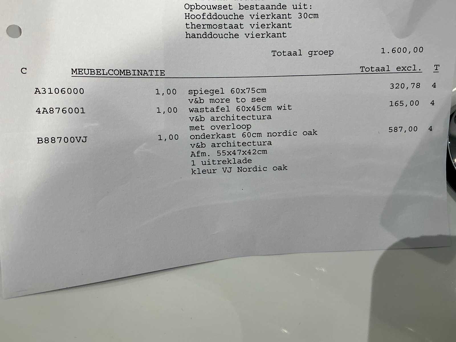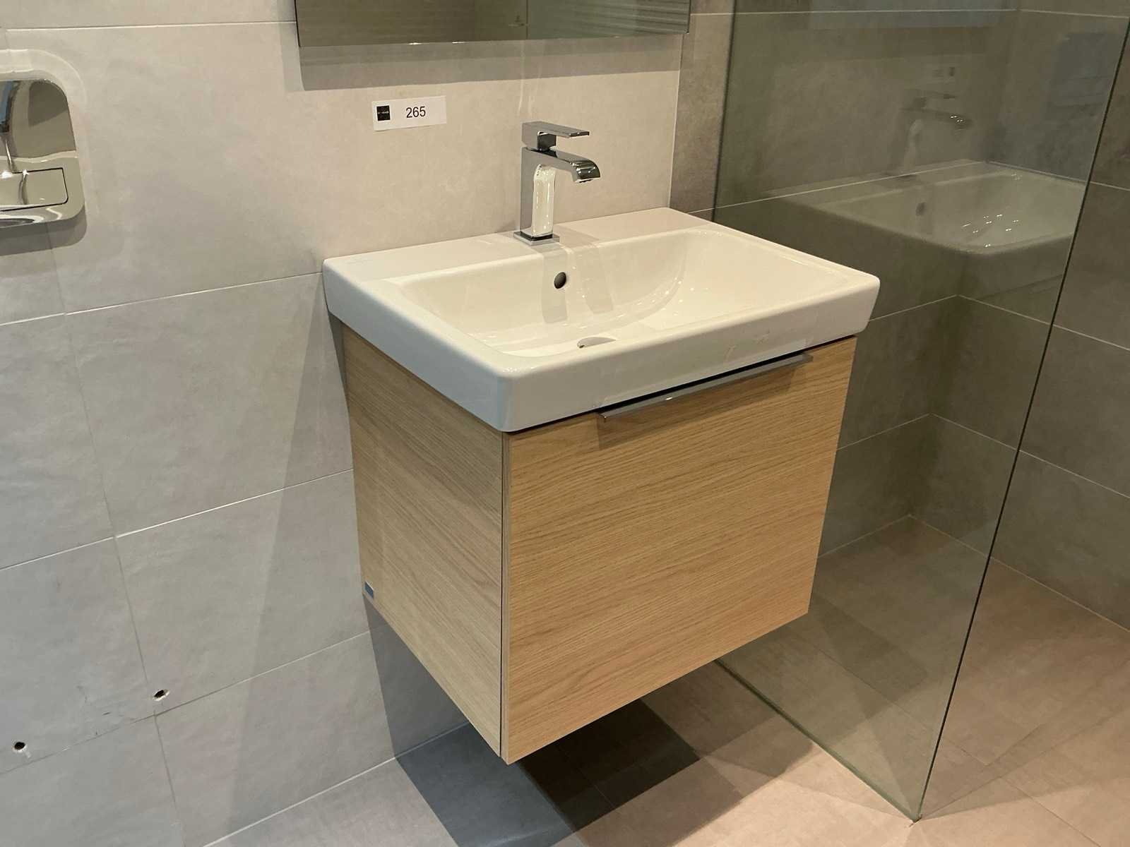 Bestaande uit 60x75cm spiegel, Villeroy & Boch wastafel Architectura 60x45cm met overloop , Architectura onderkast Nordic Oak 55x47x42cm, Christina Quadri wastafelkraan. Merk: Villeroy & Boch Model: More to see