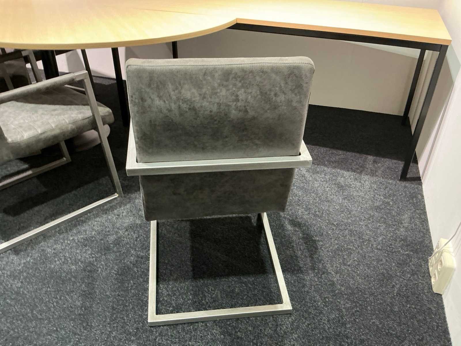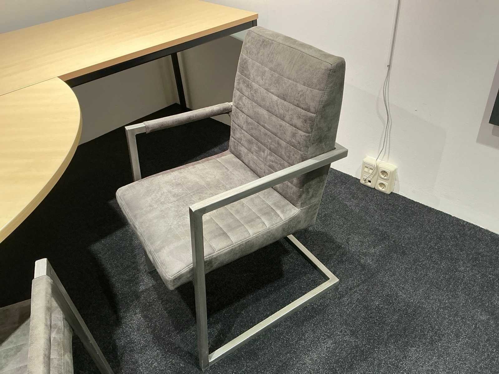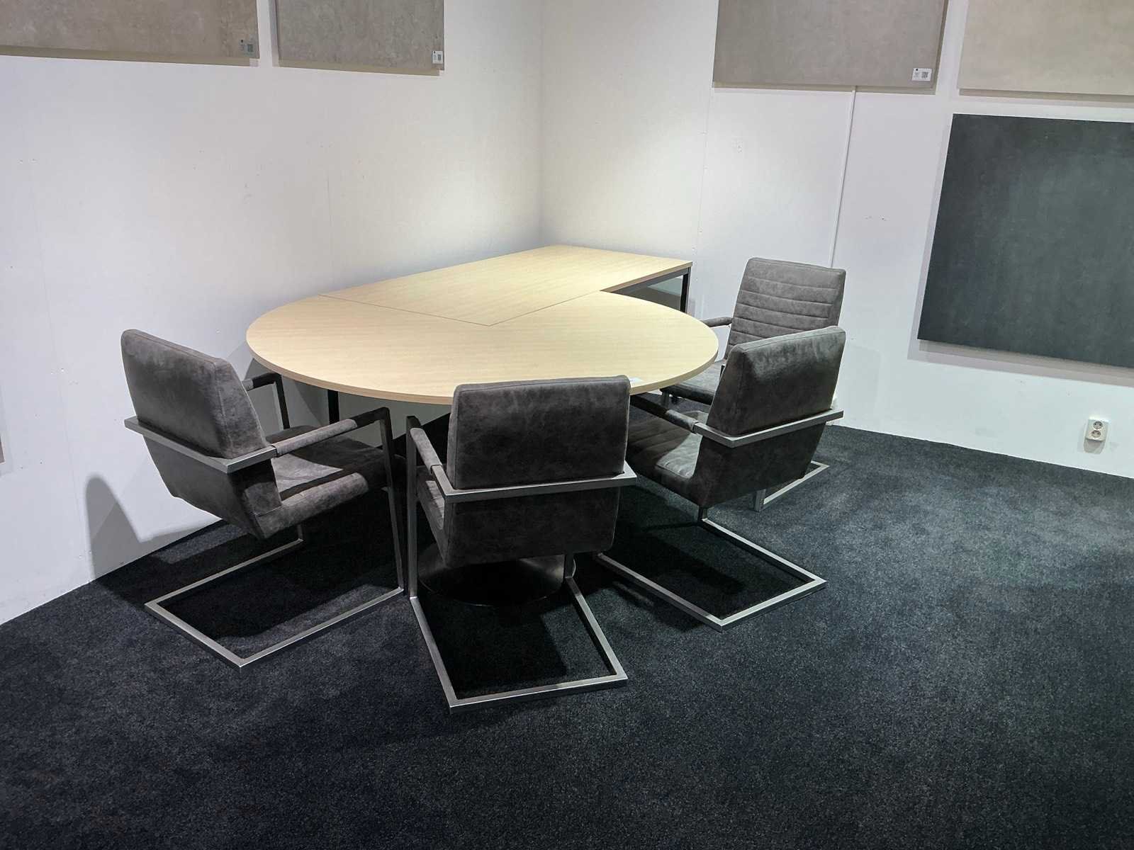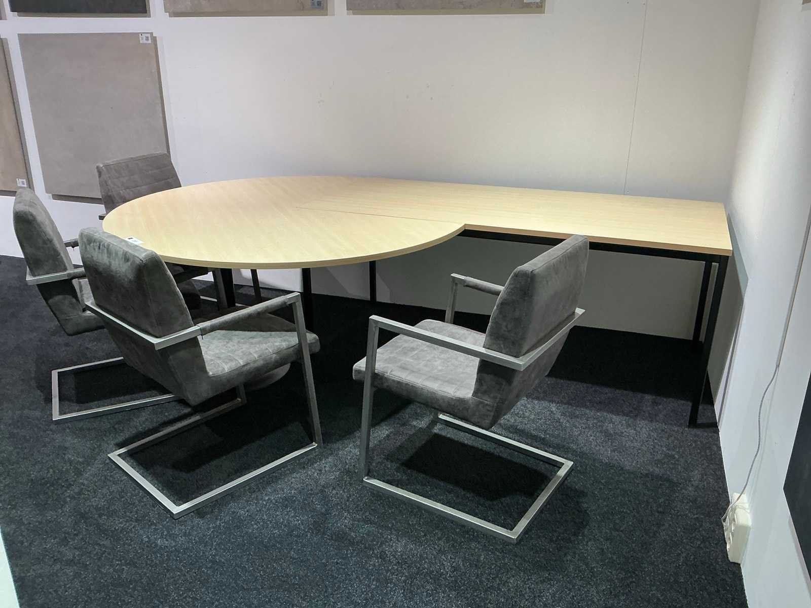 Tafel 160x80x75cm met rond aansluitdeel Ø160cm, voorzien van 4 sledestoelen.