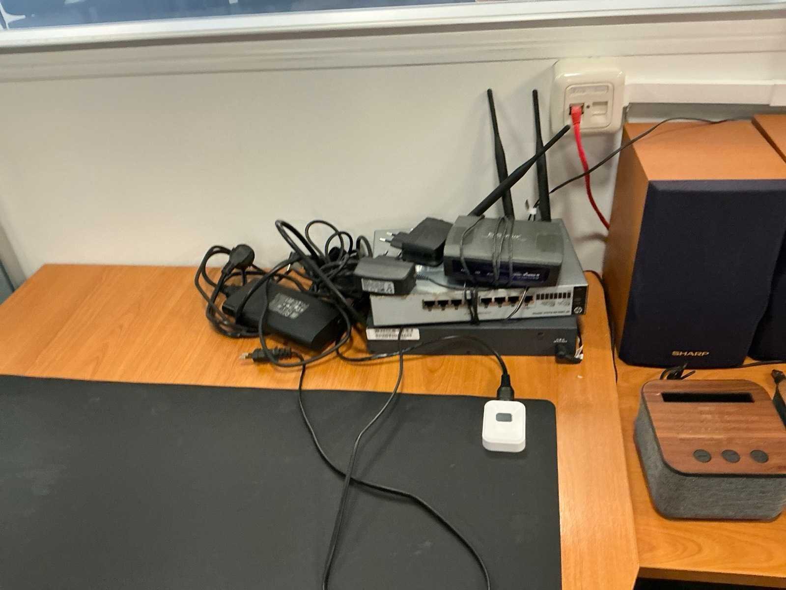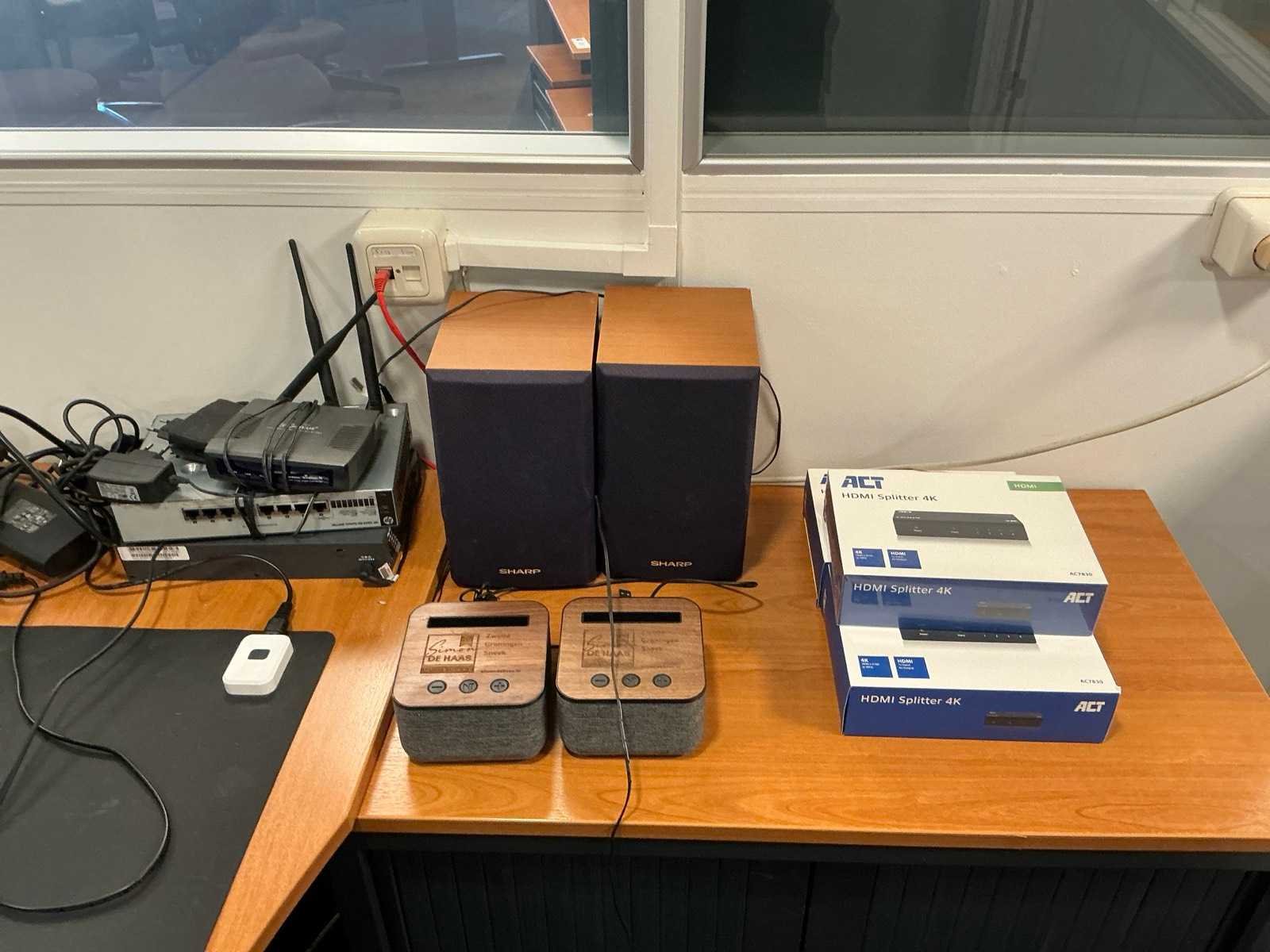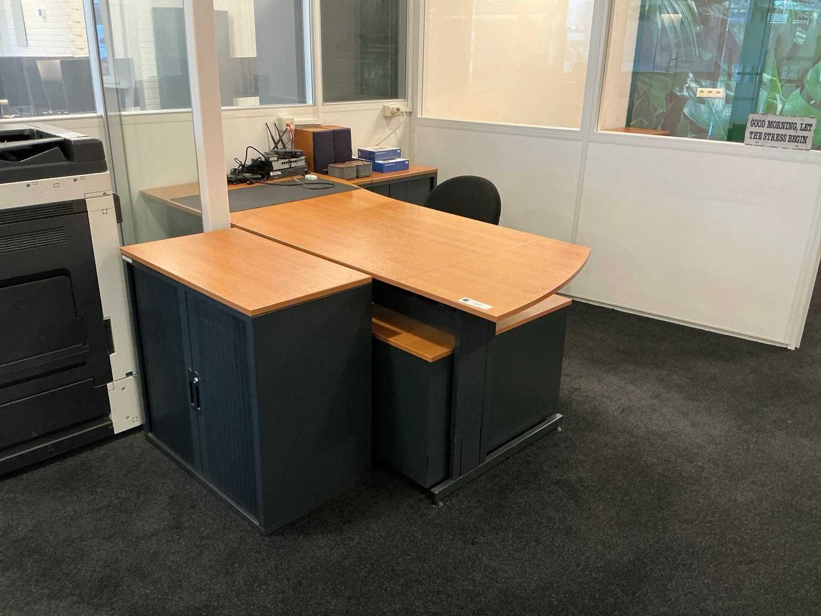 Voorzien van 2 schuifdeurkasten met inhoud , ladeblok, stoel en randapparatuur Merk: Oudholland Lengte: 220cm Breedte: 90cm Hoogte: 76cm