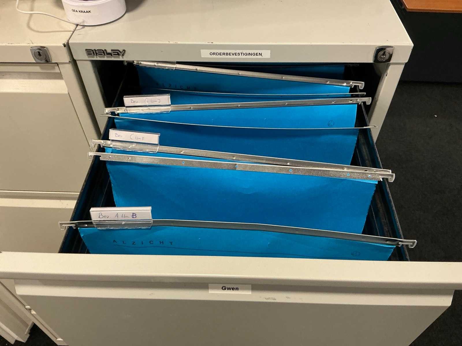 Voorzien van kantooraccesoires. Merk: Bisley Lengte: 47cm Breedte: 62cm Hoogte: 132cm Aantal laden: 4