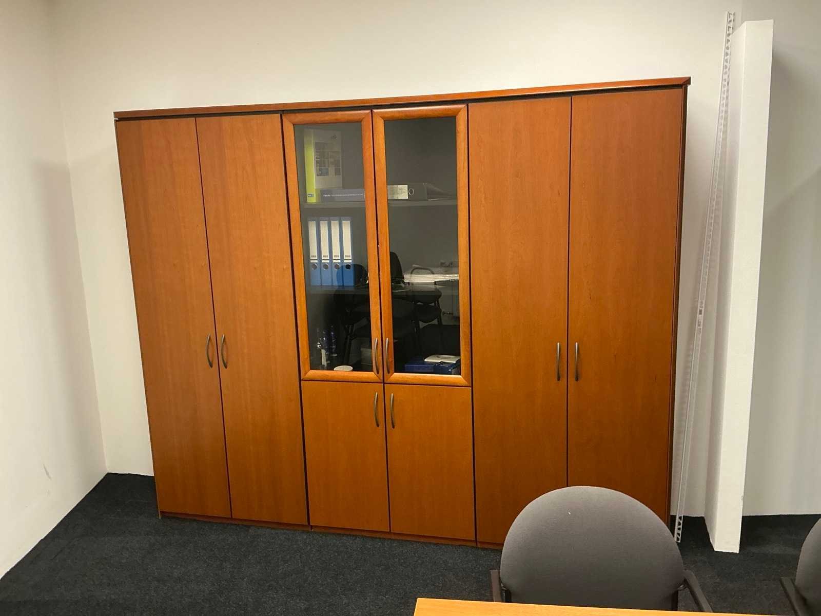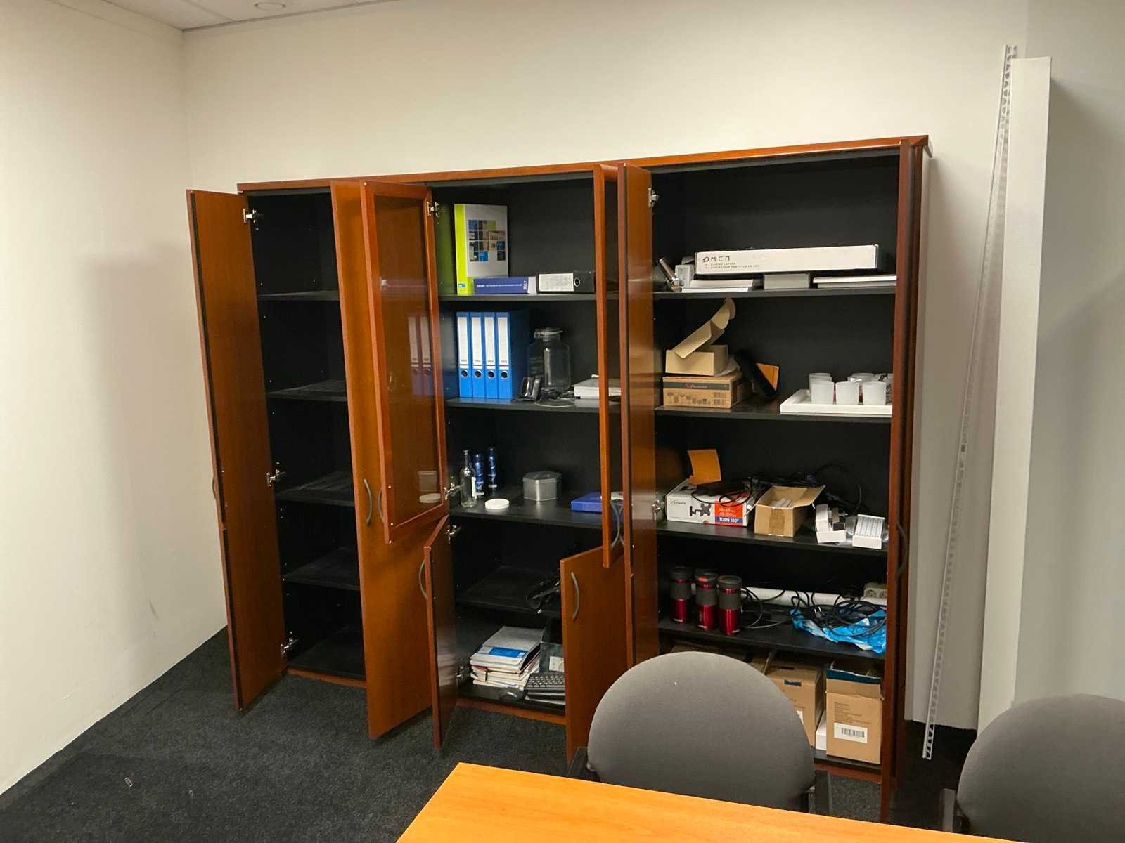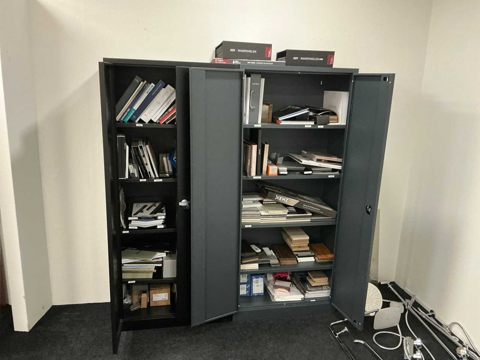 Bestaande uit vergaderset met 9 stoelen, 2 dossierkasten met inhoud, houden wandmeubel met inhoud, wandkastje en diverse sanitair materialen waaronder dummy kranen. Dit kavel dient bezemschoon opgeleverd te worden.