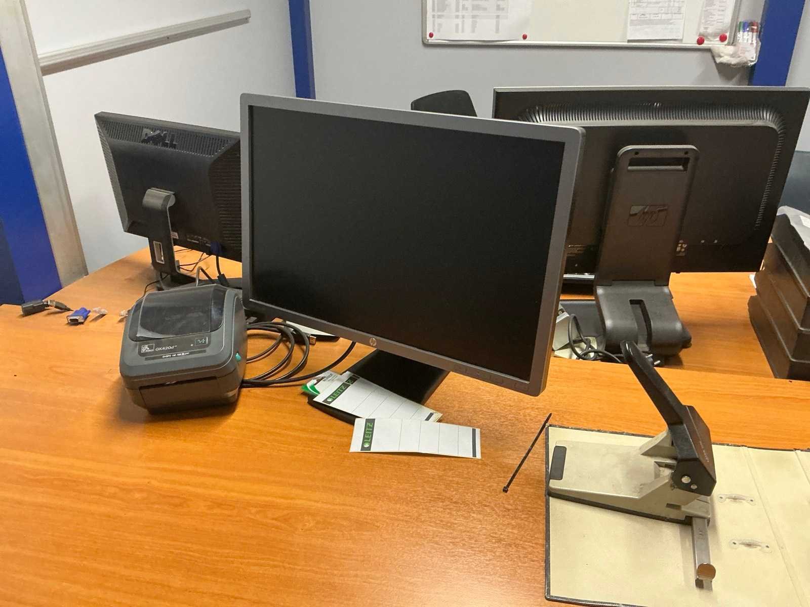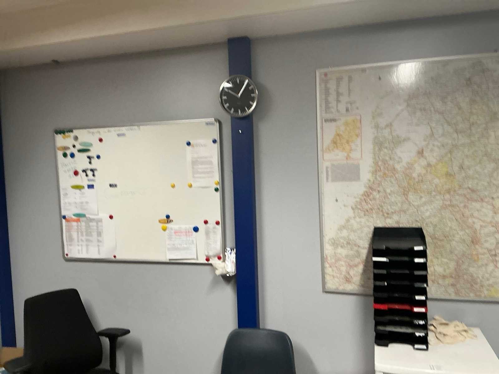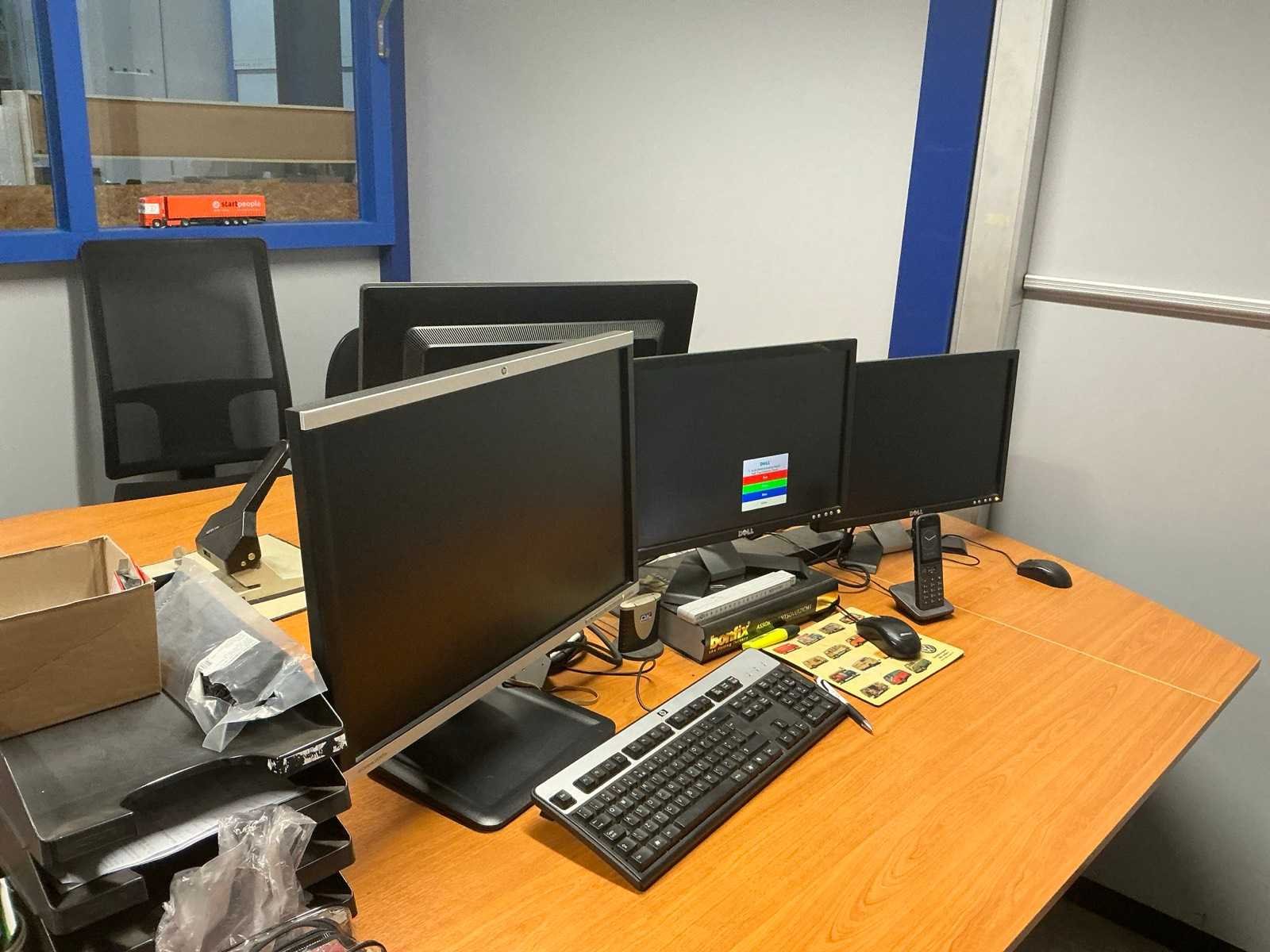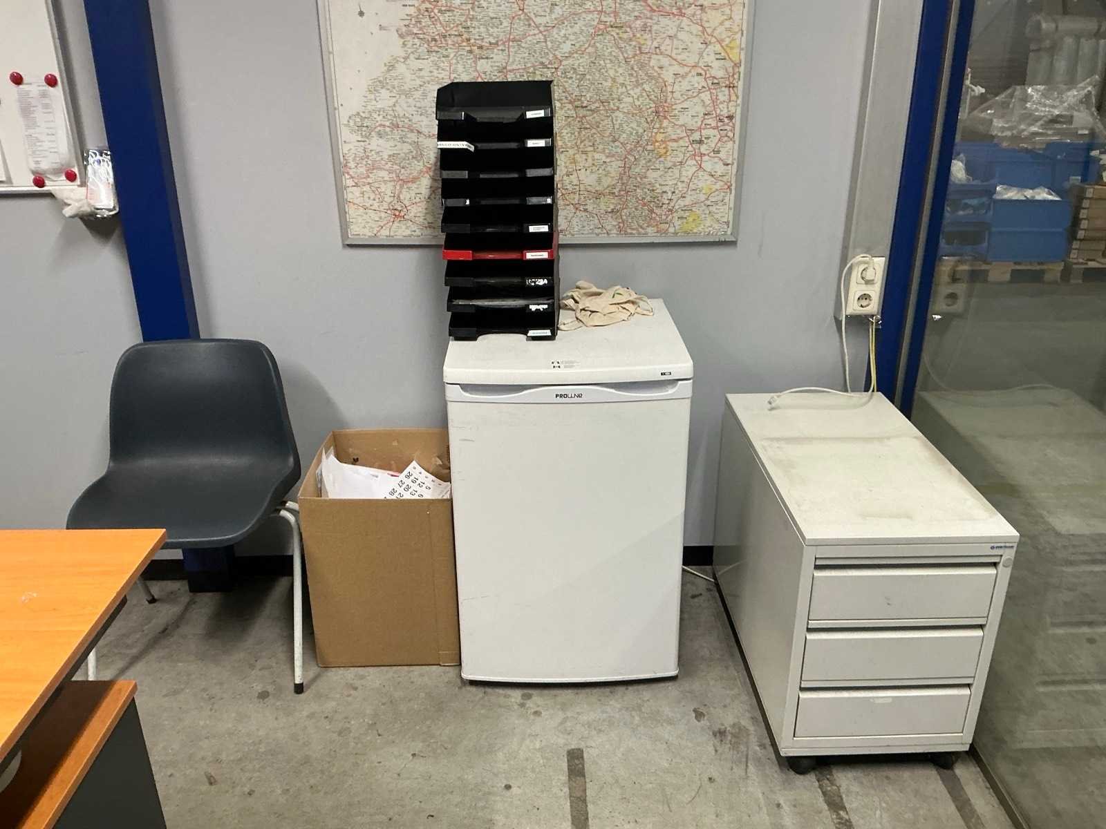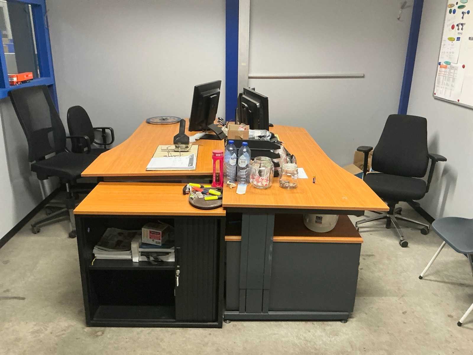 Bestaande uit 2 bureaus, 4 bureaustoelen, koelkast, tafel, 2 ladeblokken, 4 monitoren, Zebra GK420D labelprinter. Dit kavel dient leeg opgeleverd te worden.