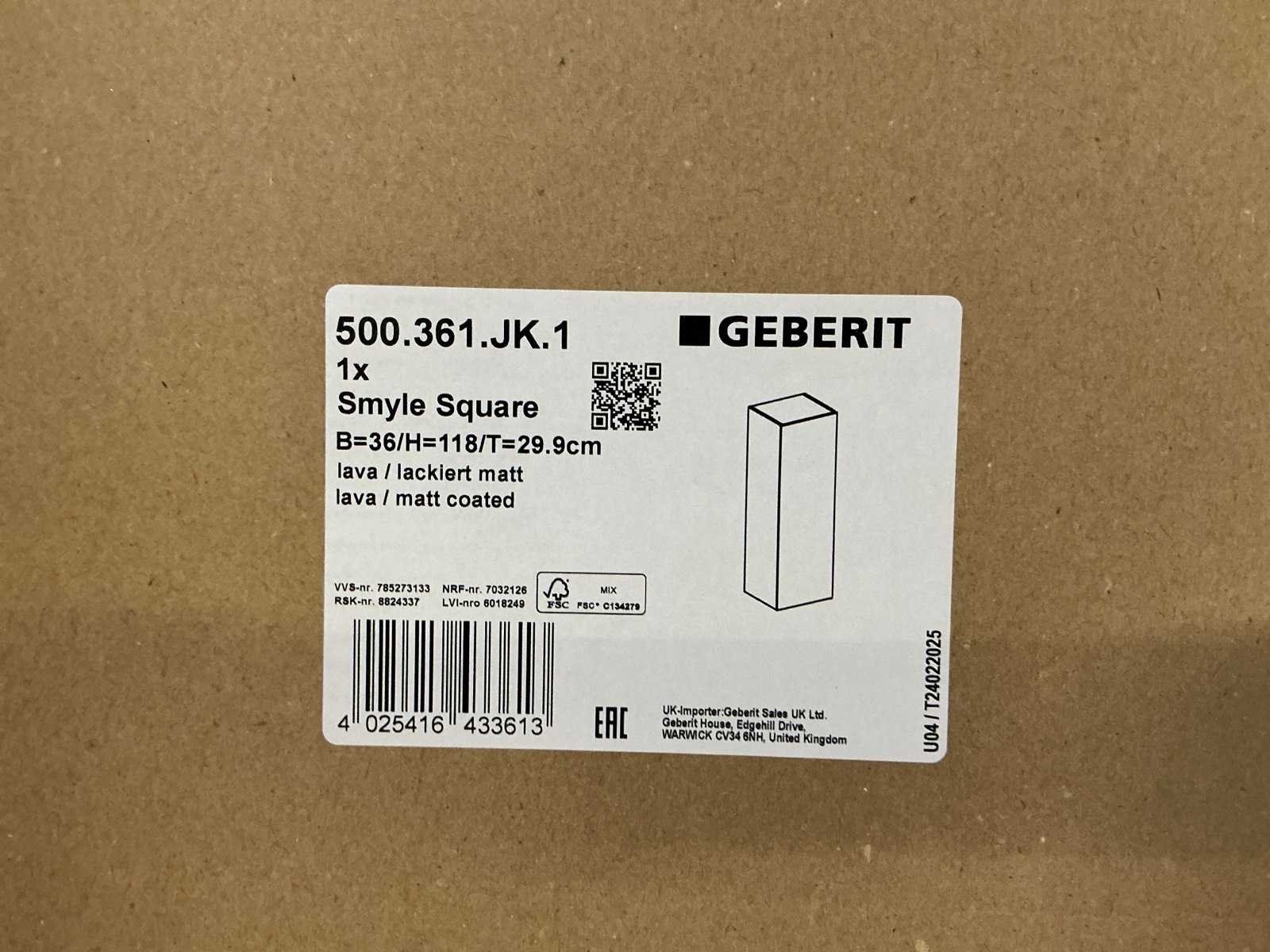 Bestaande uit een hoge kast 36x29.9x118cm en een onderkast 88,4x 47x61,7cm. Ongebruikt in doos. Merk: Geberit Model: Smyle Square Kleur: Lava mat gecoat