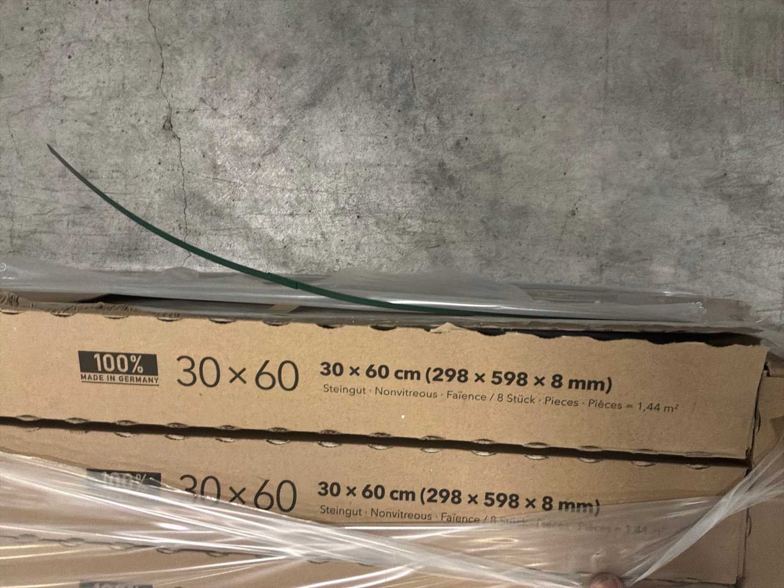 Pallet ongebruikte tegels. Bestaande uit 19 dozen. 27,36m2 wandtegels 30x60. Panaria steignut nonvitrrous faïence beige Merk: Panaria Kleur: Beige Lengte: 30cm Breedte: 60cm Dikte: 8mm Aantal m² per verpakking: 1.44m² Aantal pakken: 19 Totaal oppervlakte: 27.36m² Totaal gewicht: 379kg