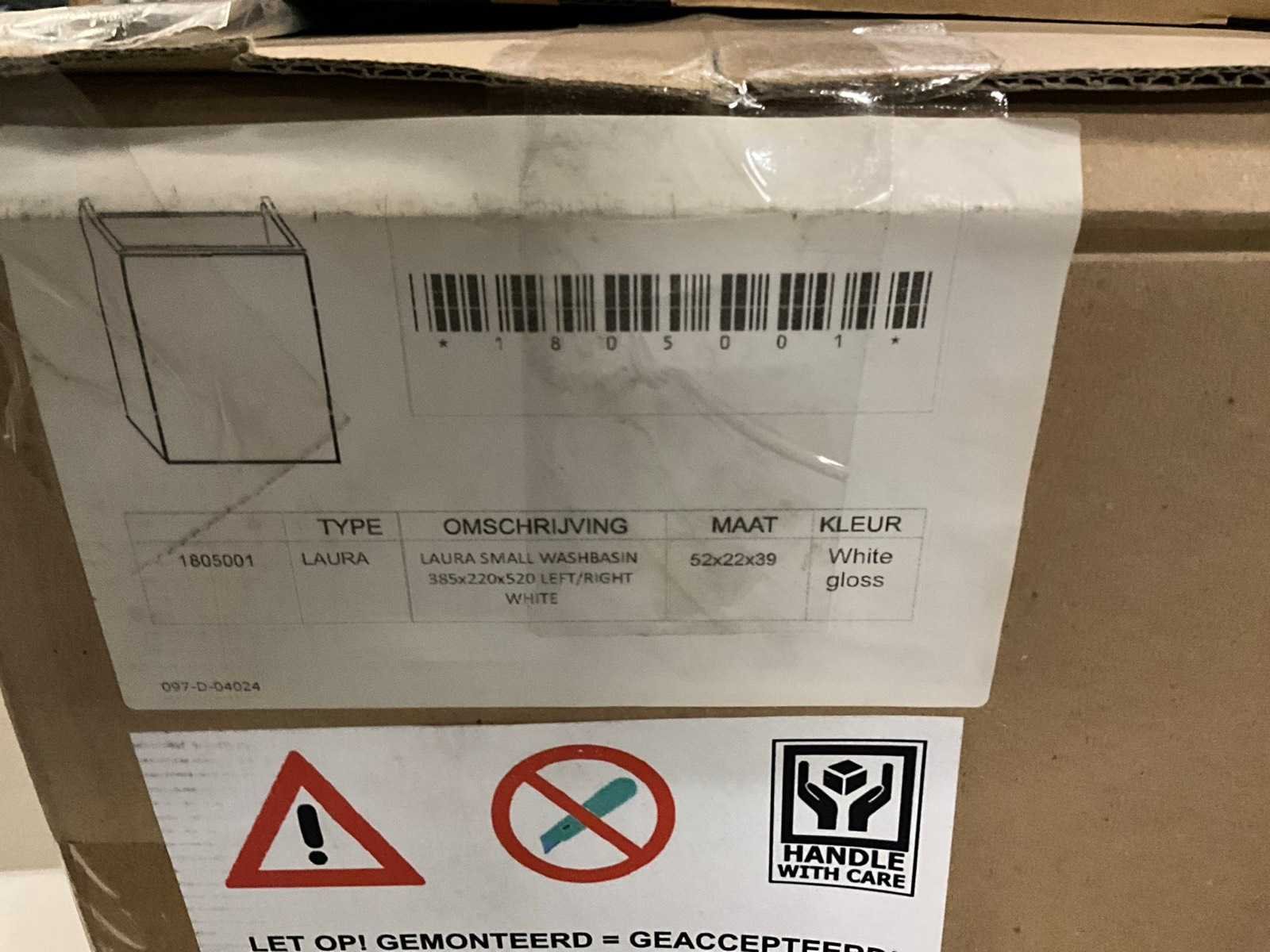 Waaronder wasbak, onderkast en meubelonderdelen, toiletbril.