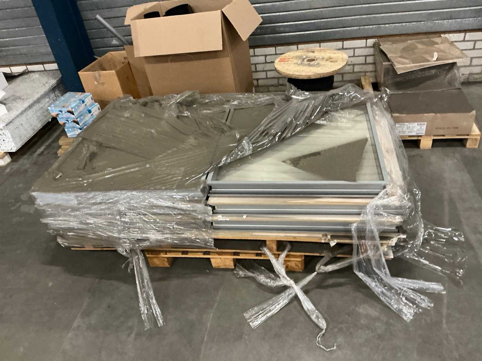 Verschillende soorten en maten op 5 pallets waaronder ramen, isolatie, buizen, mastic tubes.