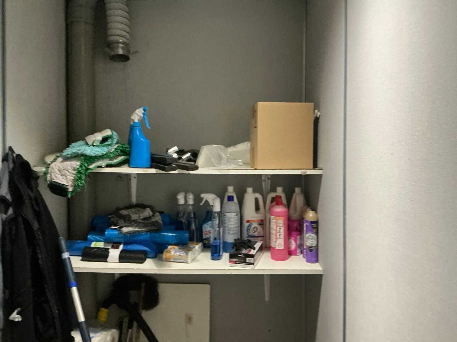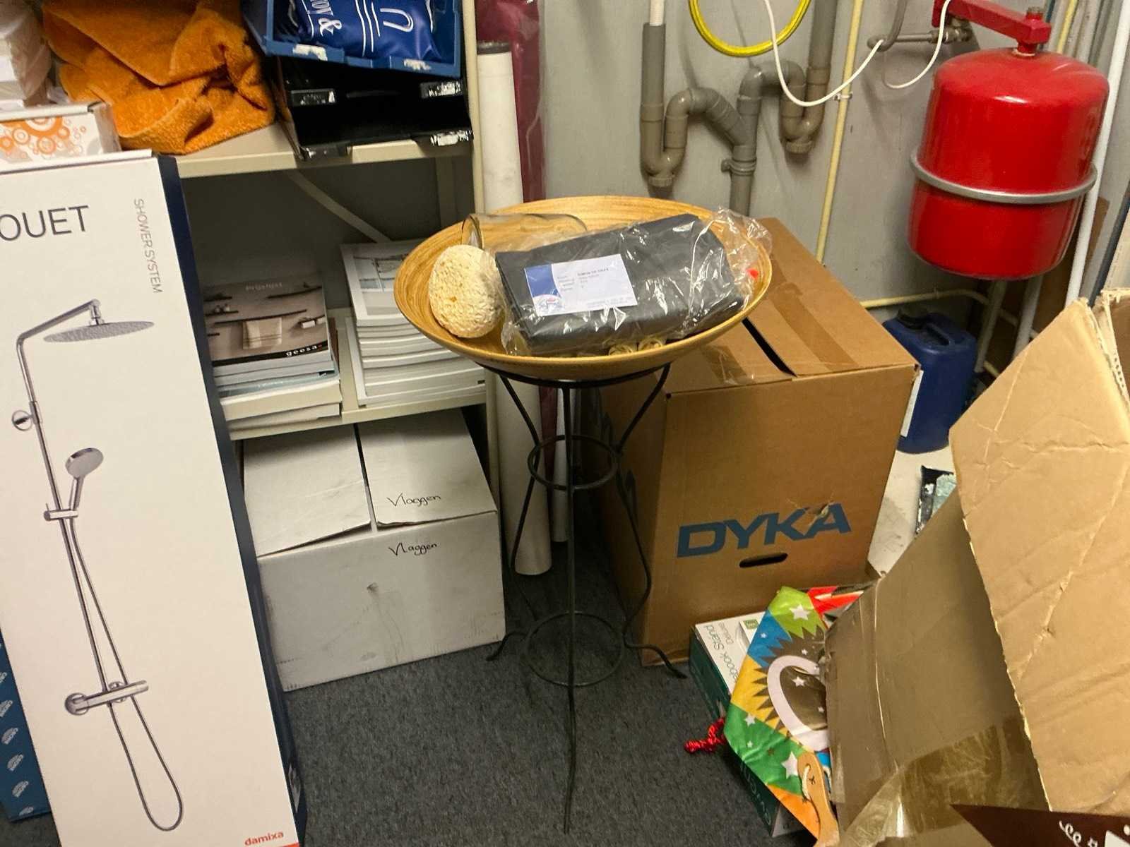 Bestaande uit decoratie materialen, dubbelzijdige uitzettrap , 2 magazijnkasten, 2 kasten, stofzuiger, schoonmaak artikelen , zonder de administratie. Dit kavel dient leeg opgeleverd te worden.