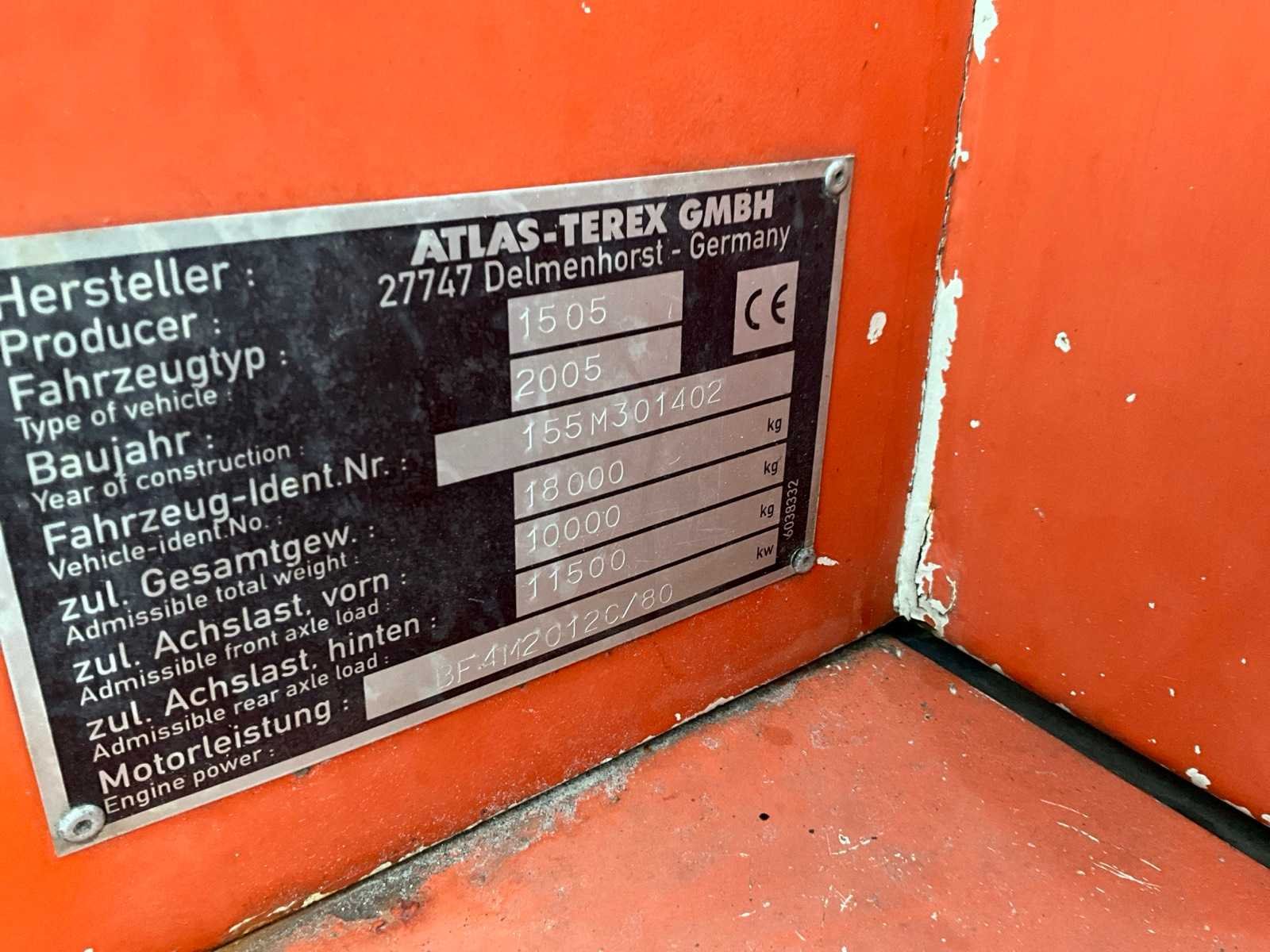 Stelgiek, “Verachtert” CW30 hydraulische snelwissel type 213-7688, maaikorf functie, hamer / sorteergrijp functie, rotatie functie, schuifblad, camera achterzijde, airco, centrale smeerfunctie, Inclusief “Verachtert” slotenbak Merk: Atlas Type: 1505 Bouwjaar: 2005 Serienummer: 155M301402 Kenteken: TPV-10-G Merk motor: Deutz type BF 4M 2012 C Motorvermogen (kW): 88kW Aantal cilinders: 4 Brandstof: diesel Gieklengte: 7500mm Met graafbak: true Graafbak afm. l: 800mm Graafbak afm. b: 1800mm Graafbak afm. h: 700mm Bandenmaat: 600/50-22.5 Cabine: true Totale afmeting Breedte: 2450mm Totale afmeting Hoogte: 3100mm