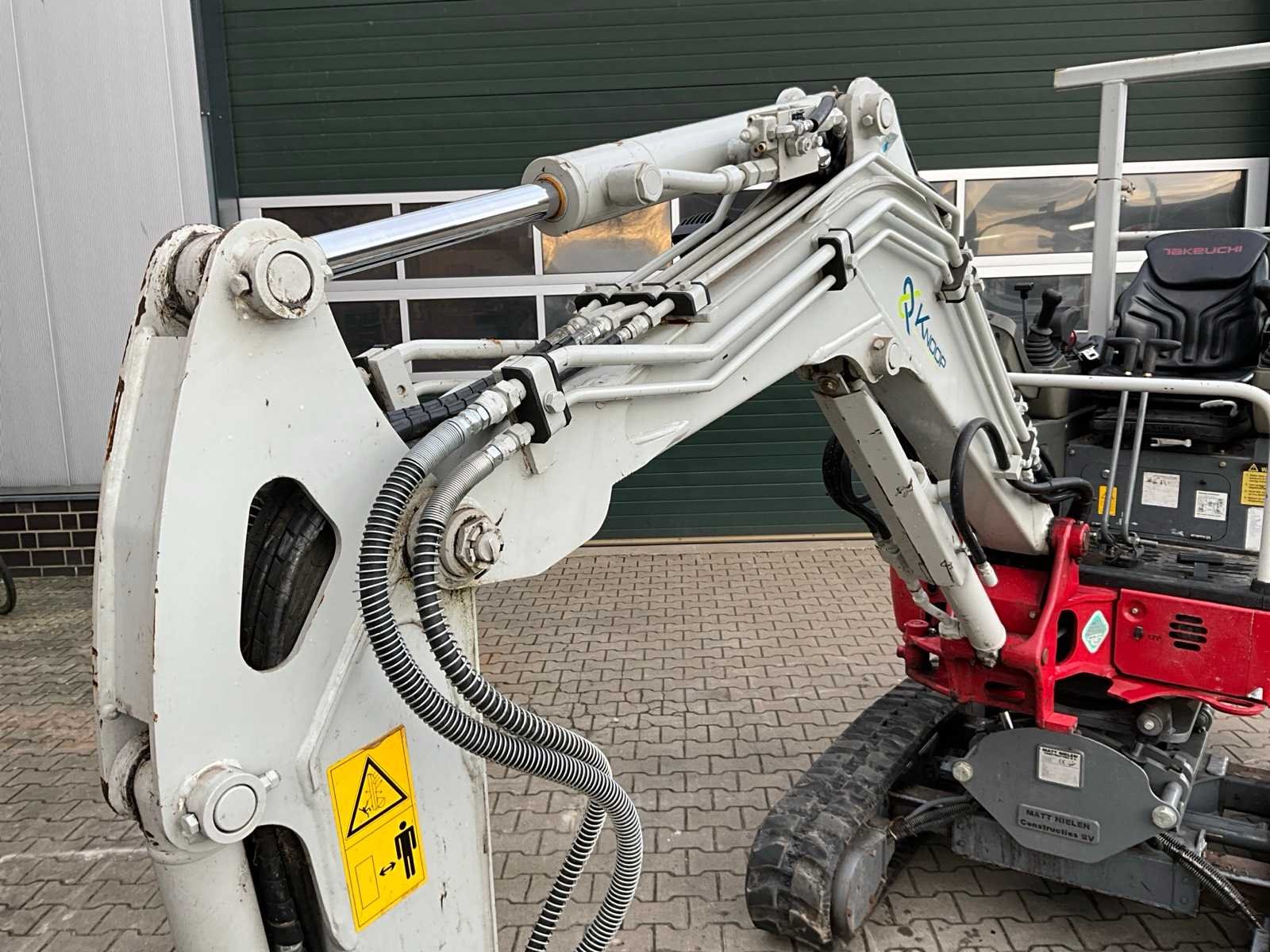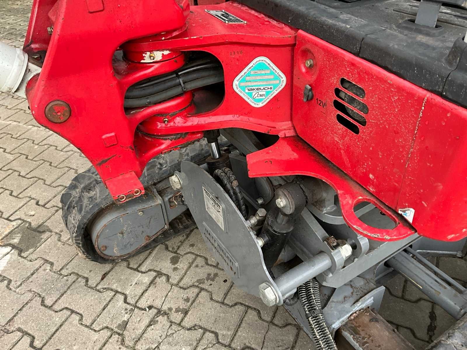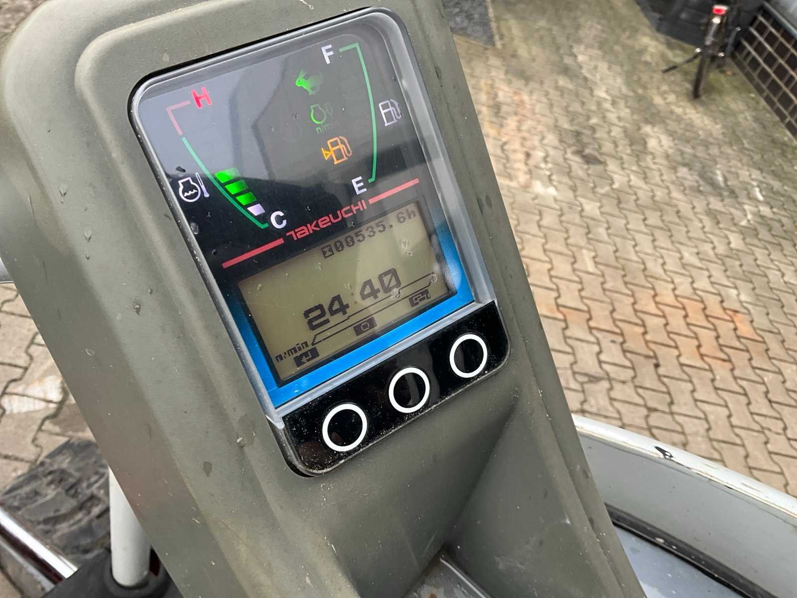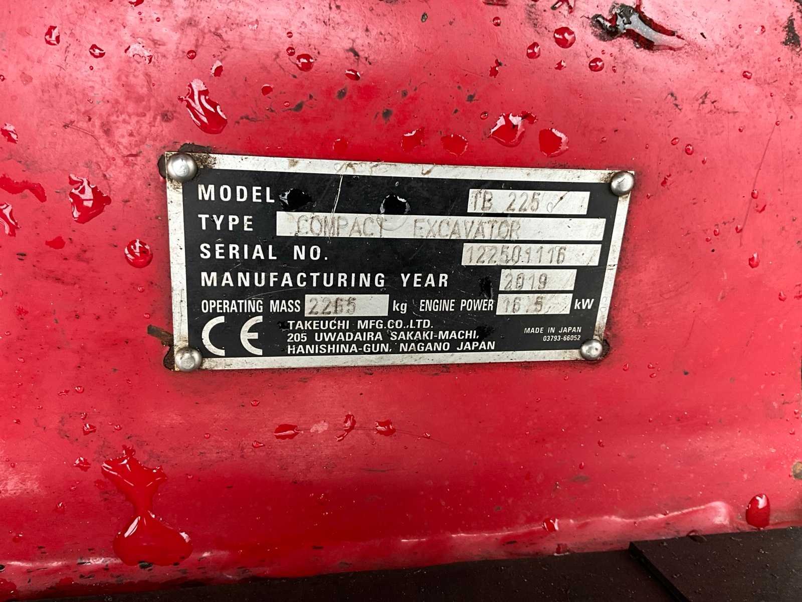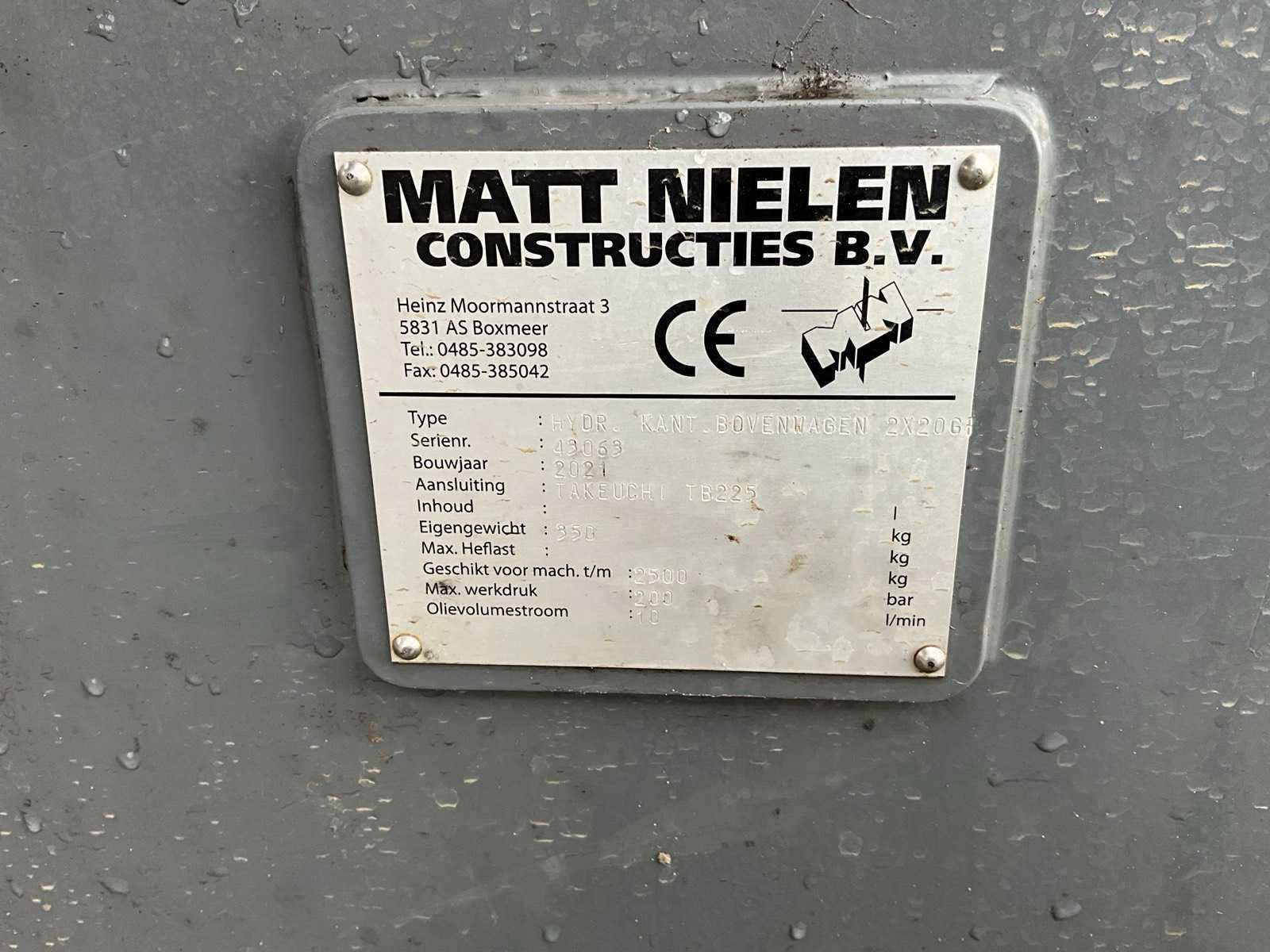 Voorzien van: “Matt Nielen” demontabel onderstel met kantelmechanisme en neerklapbare rolbeugel, snelwissel CW05, startonderbreker, 3 extra functies op giek, verstelbare spoorbreedte, 1100 mm tot 1500 mm, inclusief originele canopy Merk: Takeuchi Type: TB225 canopy Bouwjaar: 2019 Serienummer: 13122501116 Merk motor: Yanmar Motorvermogen (kW): 16.3kW Aantal cilinders: 3 Brandstof: Diesel Max. werkbereik: 4375mm Max. graafdiepte: 2580mm Inclusief graafbak: Yes Graafbak afm. l: 400mm Graafbak afm. b: 1200mm Graafbak afm. h: 300mm Rups breedte: 200mm Afgelezen urenstand: 535 Totale afmeting L: 4375mm Totale afmeting Breedte: 1100mm Totale afmeting Hoogte: 2430mm