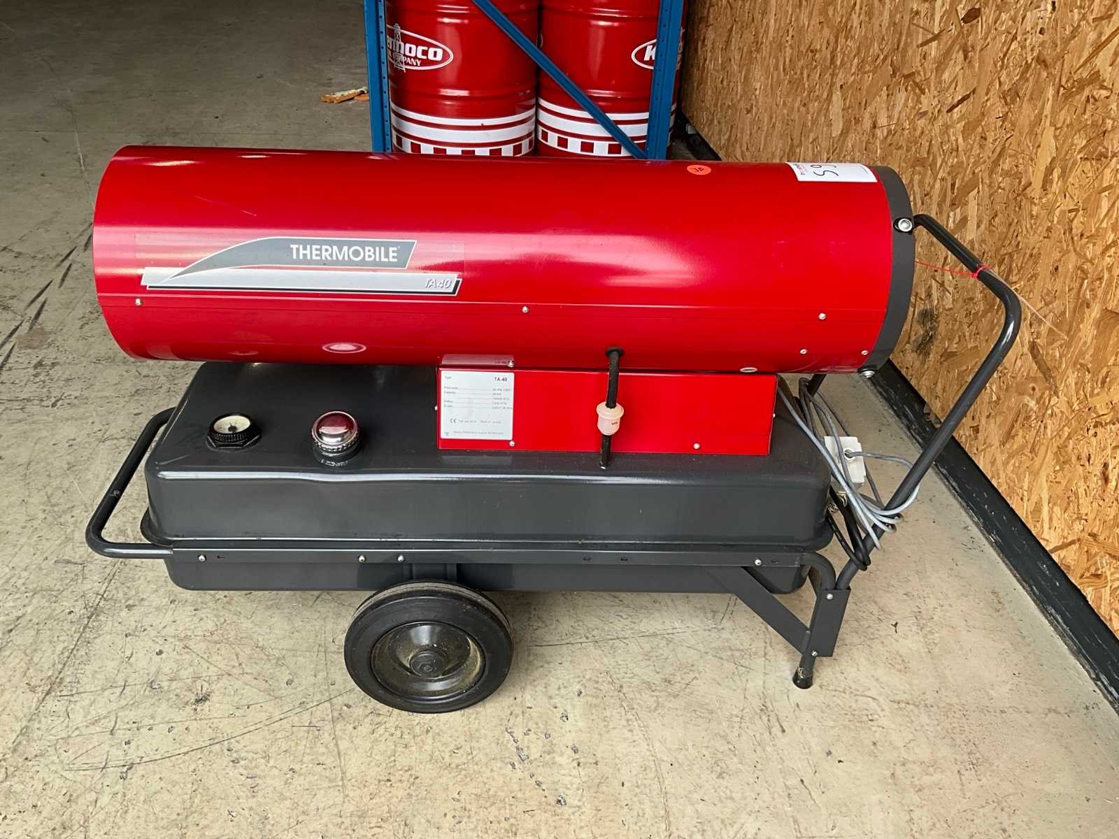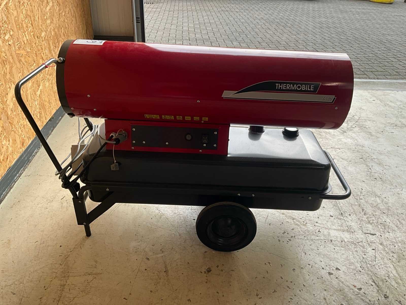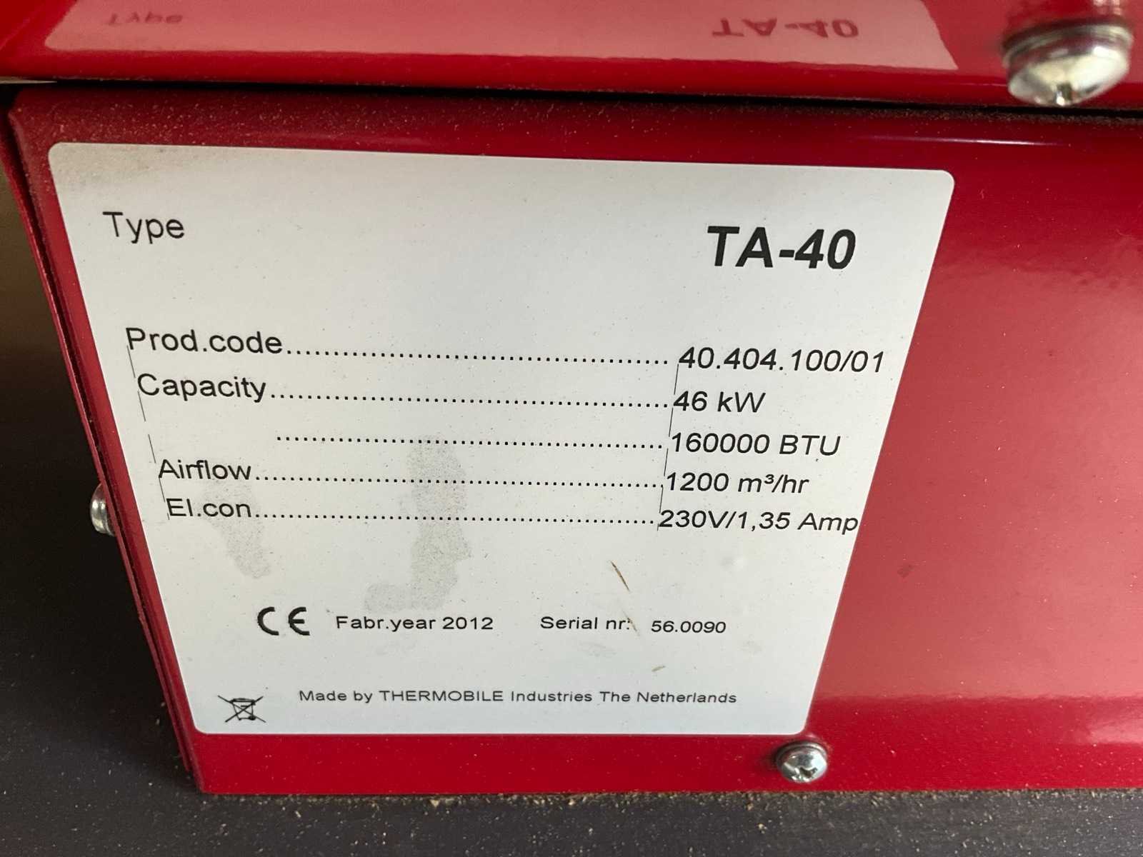 Merk: Thermobile Type: TA-40 Bouwjaar: 2012 Serienummer: 40.404.100/01 Vermogen: 46kW Capaciteit.: 160000BTU/hr Brandstof: Diesel Totale afmeting L: 1300mm Totale afmeting Breedte: 510mm Totale afmeting Hoogte: 800mm