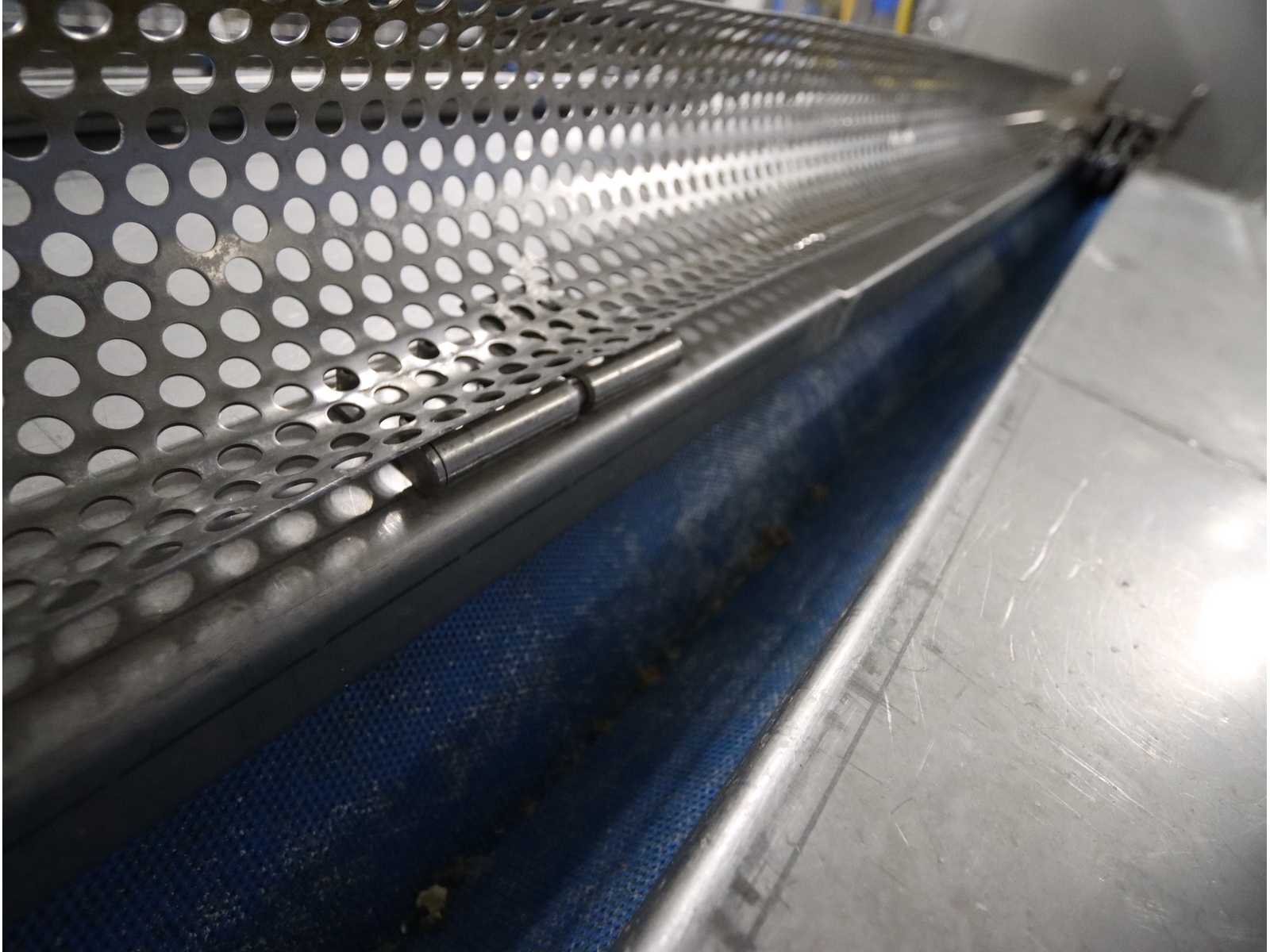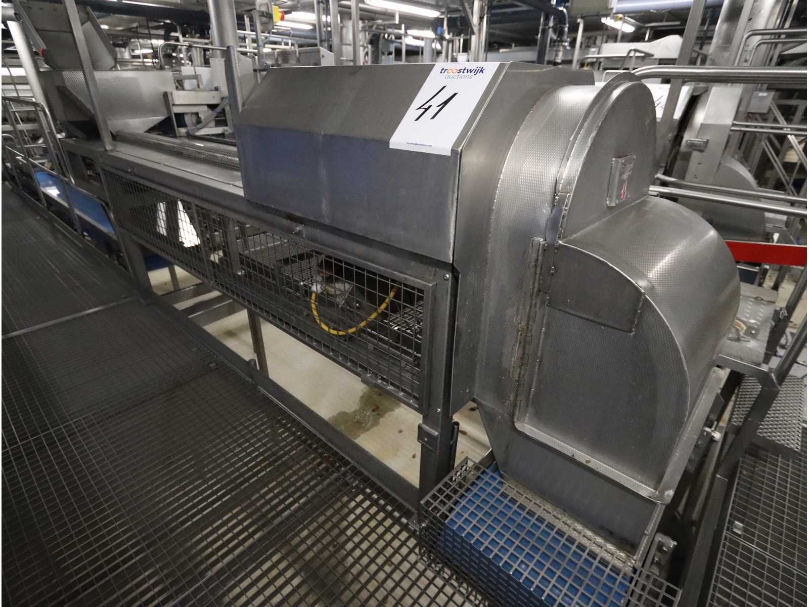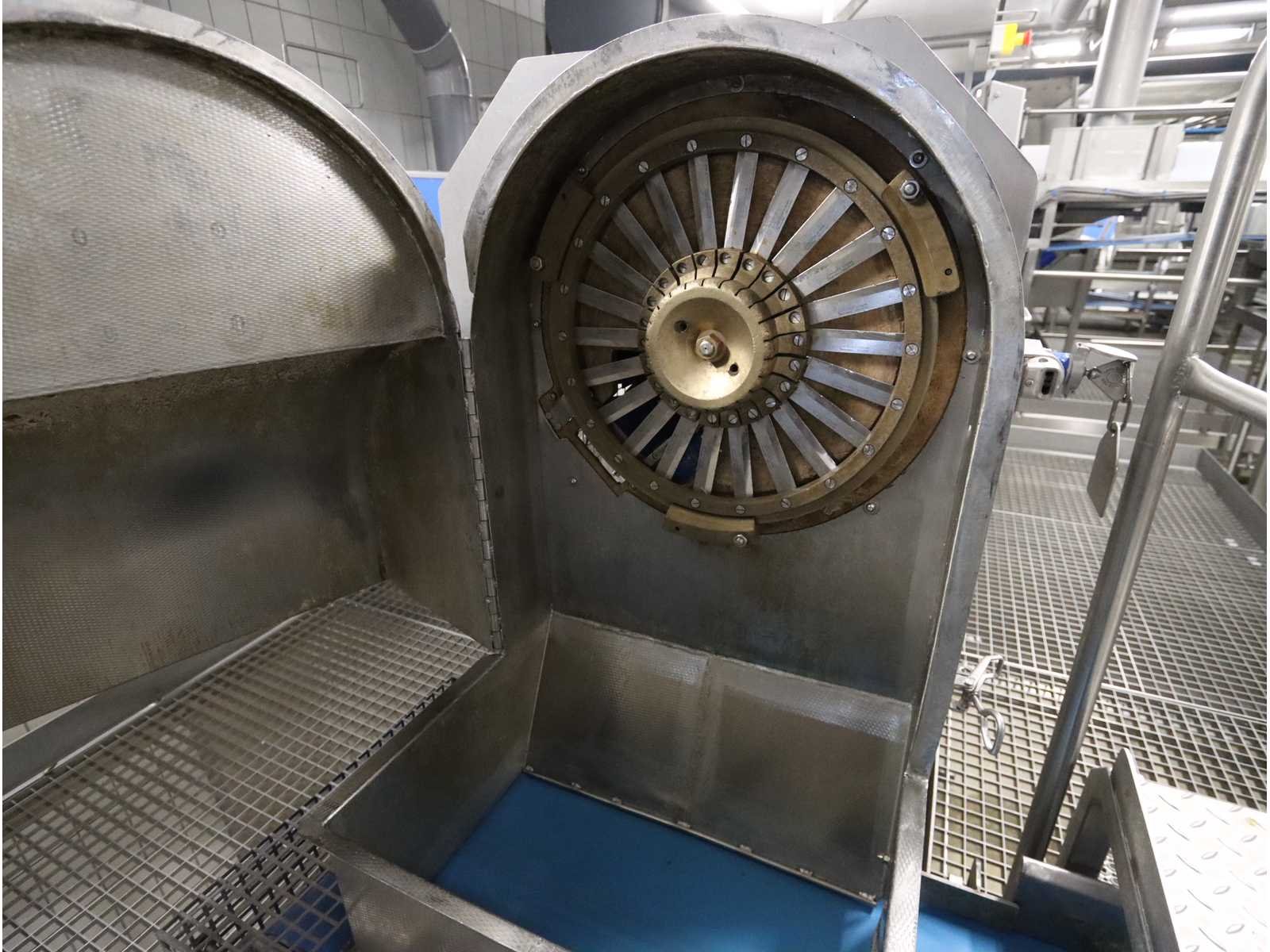 Mes diameter circa 400 mm, voorzien van aanvoer transportband, lengte circa 3000 mm, in rvs frame afmeting 3100x650x900 mm, 1,5 kW, inclusief 2 reserve messen, zonder bordes en roostervloer Totale afmeting L: 3600mm Totale afmeting Breedte: 650mm Totale afmeting Hoogte: 1300mm