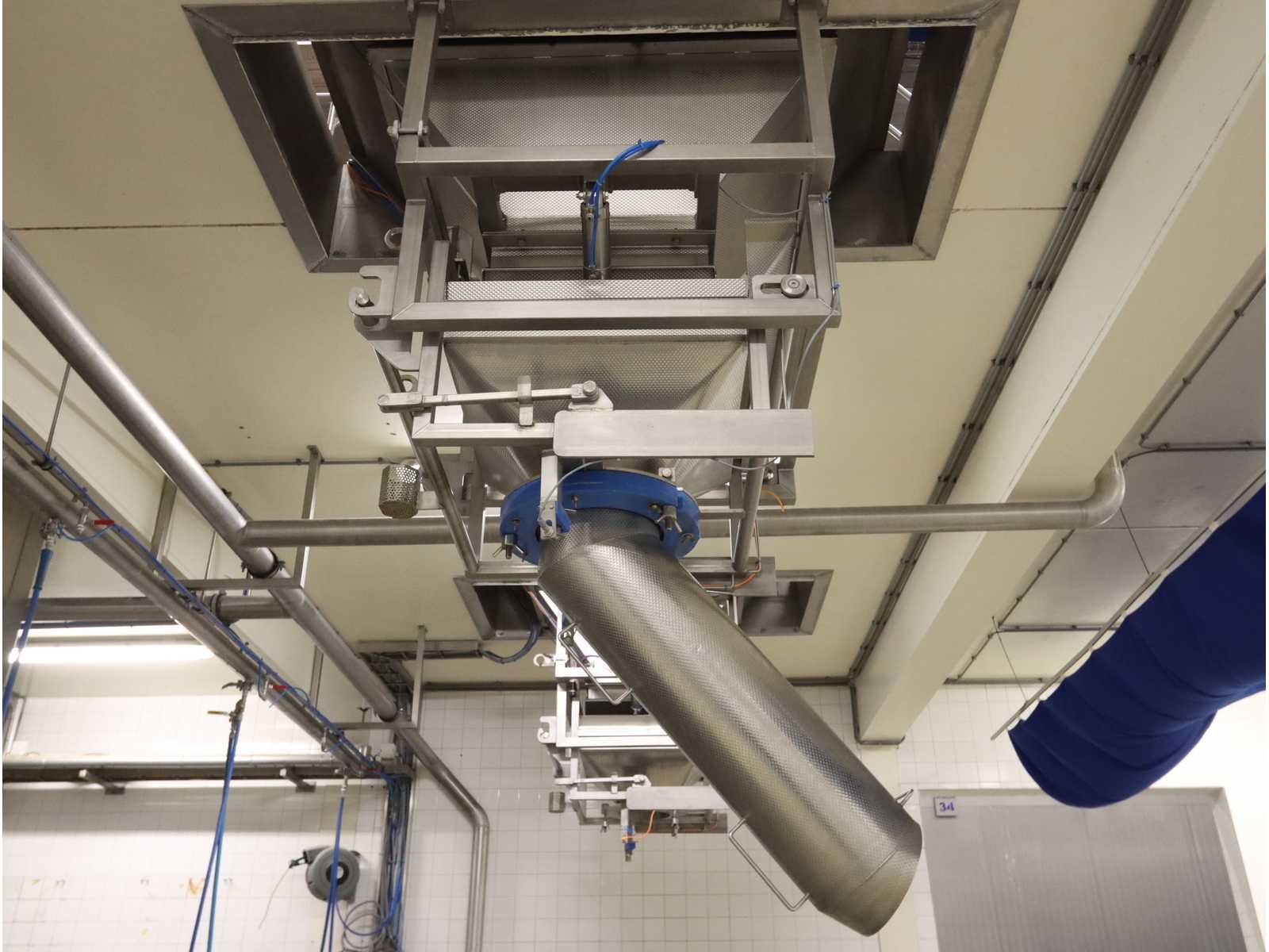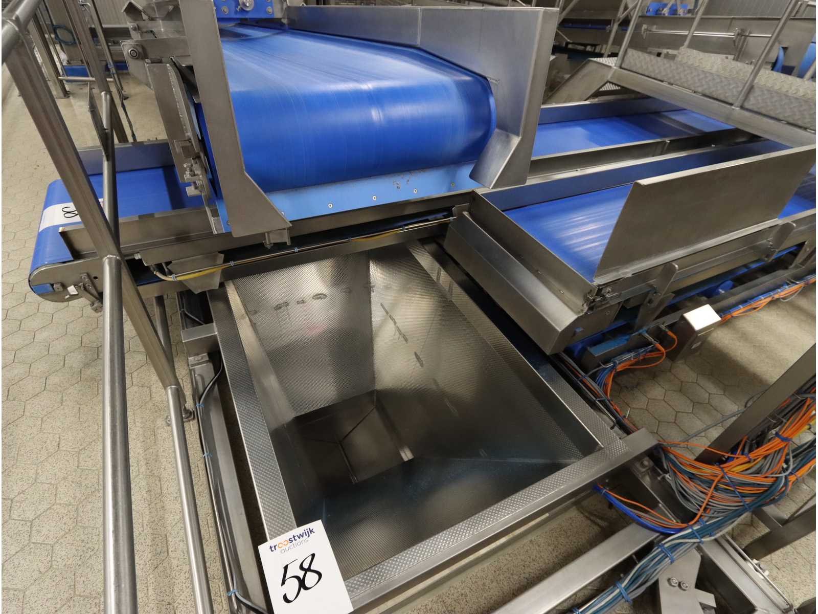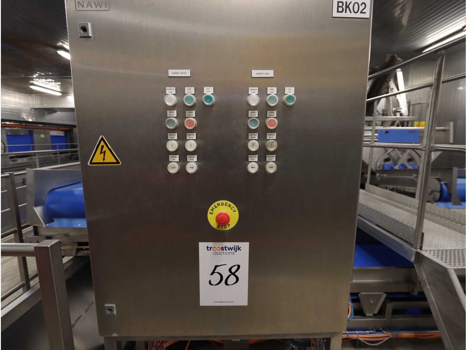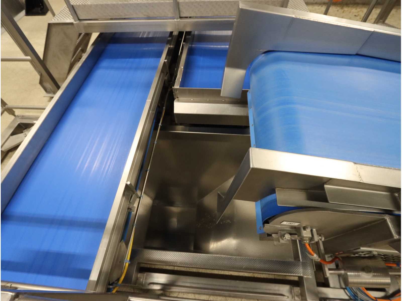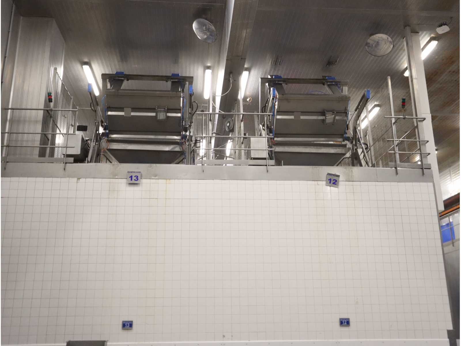 Bestaande uit: 2 bakken kantelaars, maximale bakafmeting 1600x1600x1100 mm, schuingestelde uitvoer transportband, onderlopende verdeel transportbanden, 2 stortbunkers en centrale besturingskast, zonder trappen Merk: Nawi