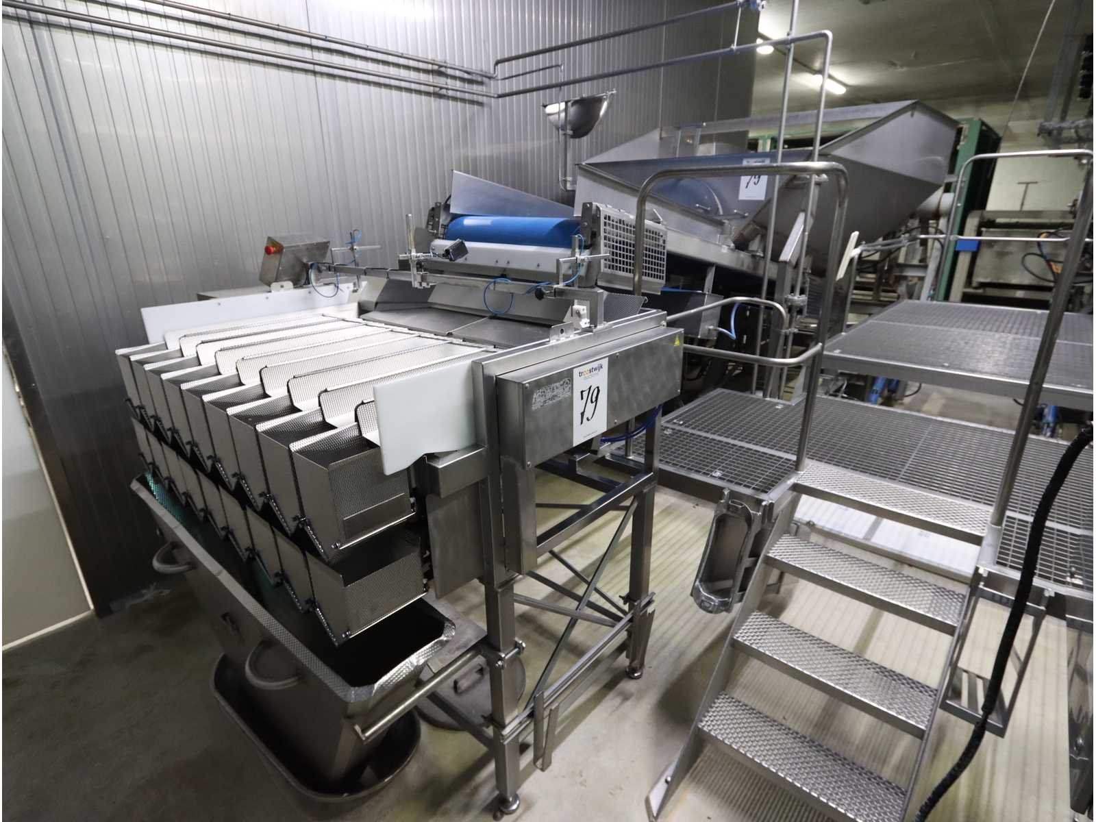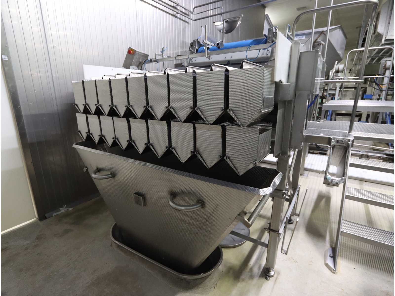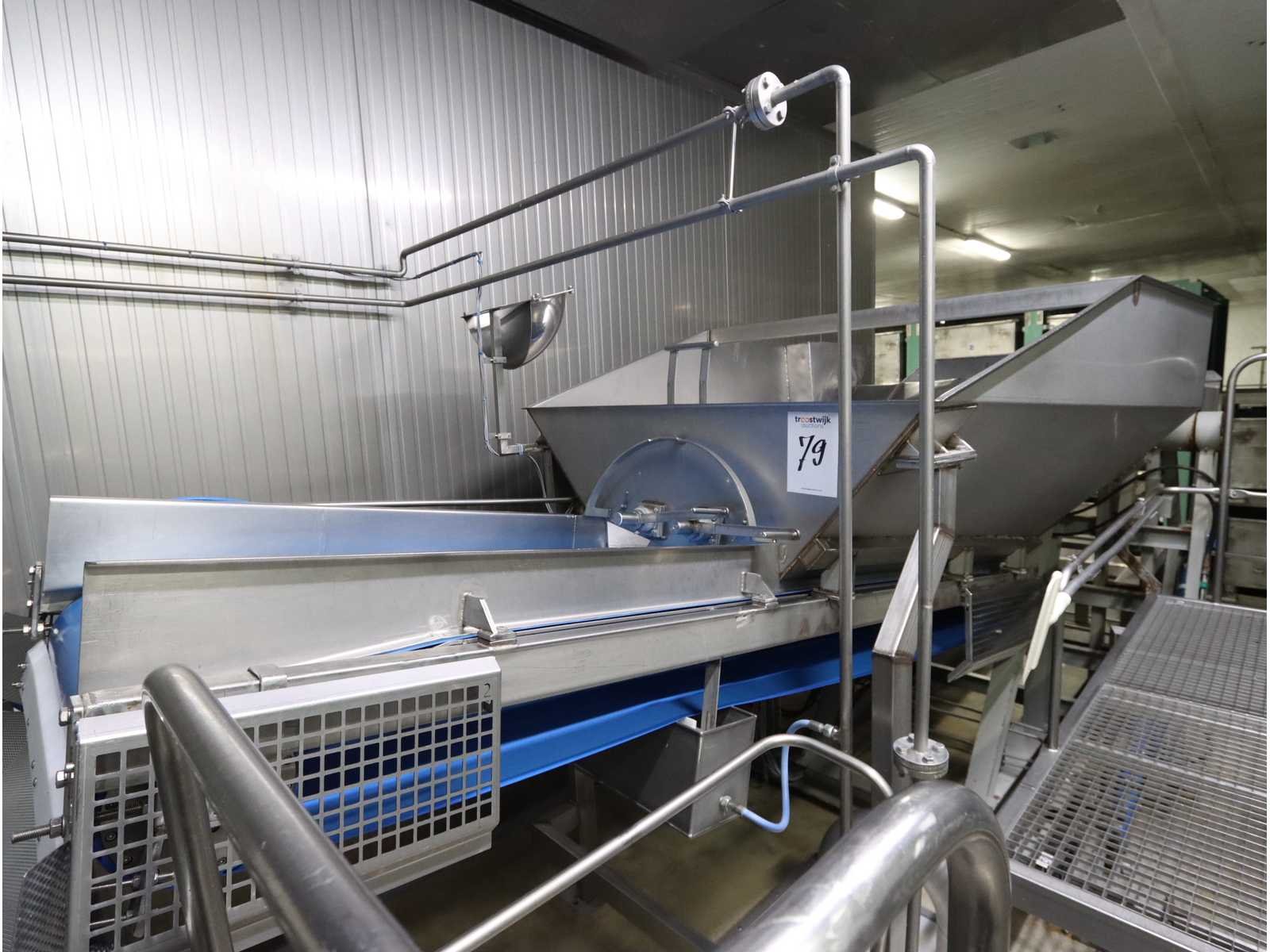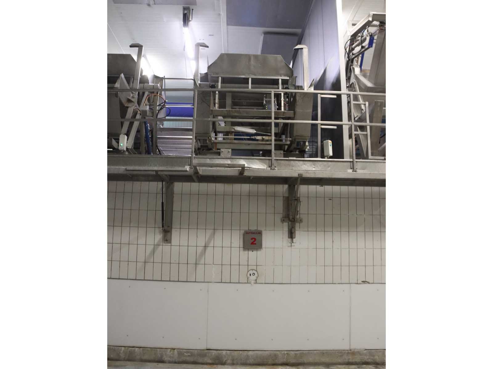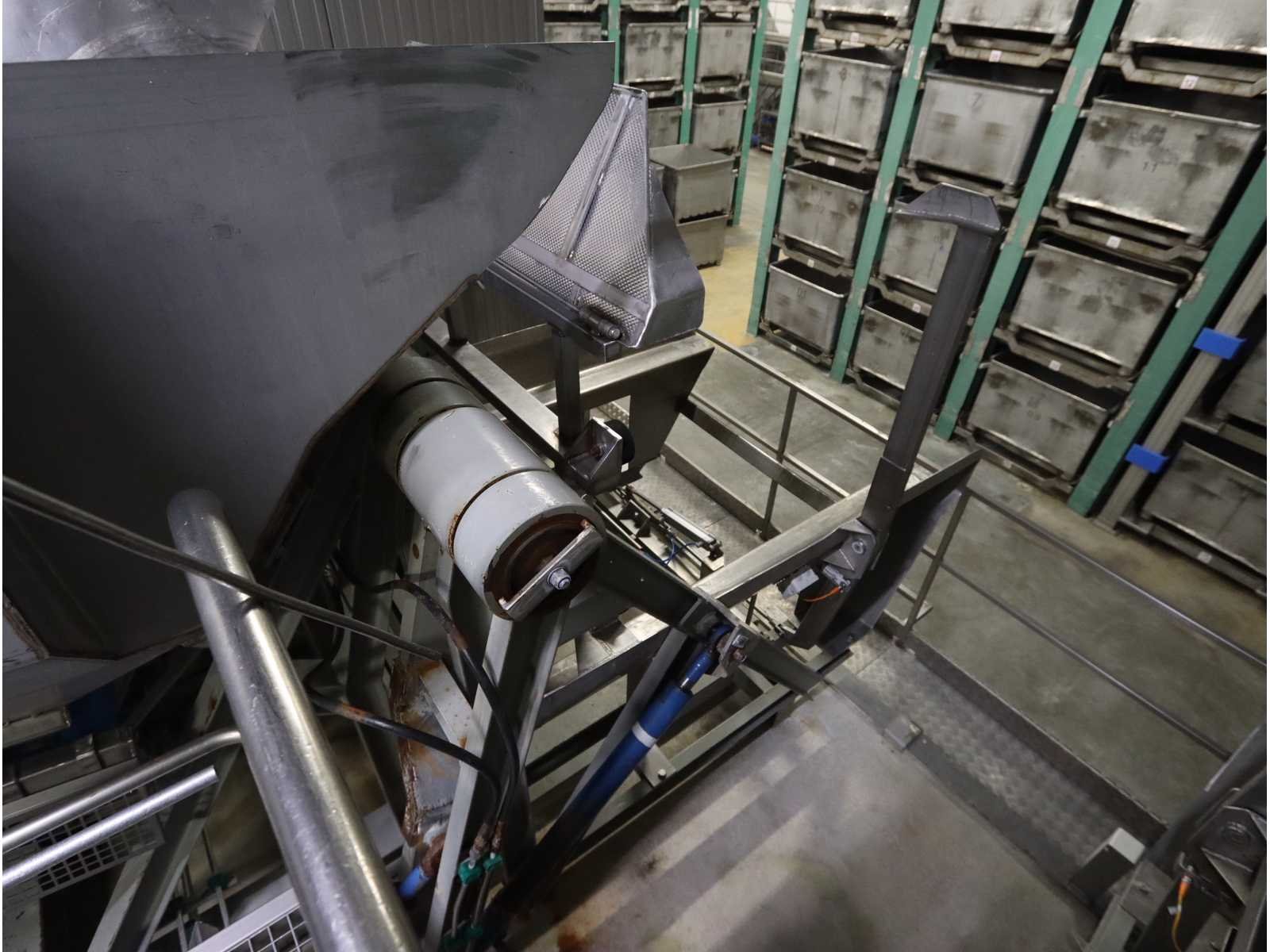 Bestaande uit: bakken kantelaar met onderlopende transportband, breedte 800 mm, lengte 3600 mm, hopper opening 2700x1800, “Jasa” multilijns weger, type 2009PCB , 9 lijns, weegbereik 10000 gram, vloer doorvoer, bordes en besturing niet inbegrepen
