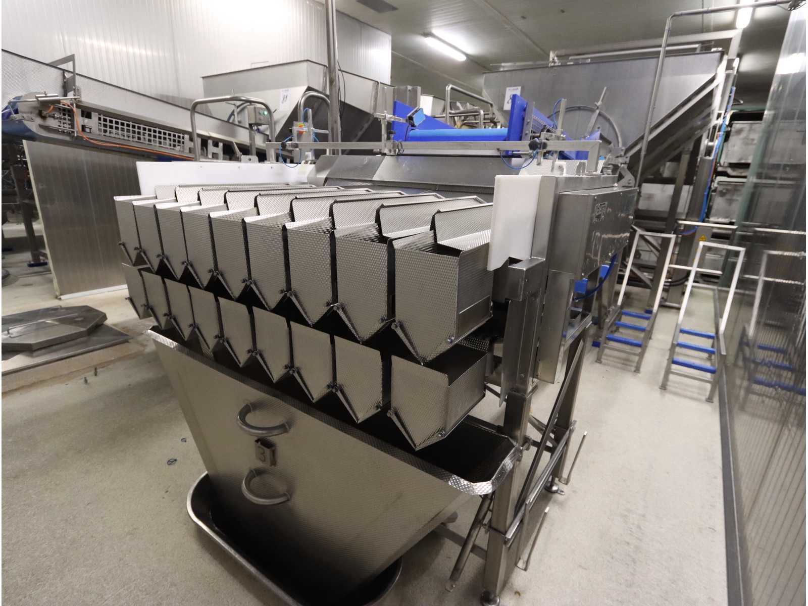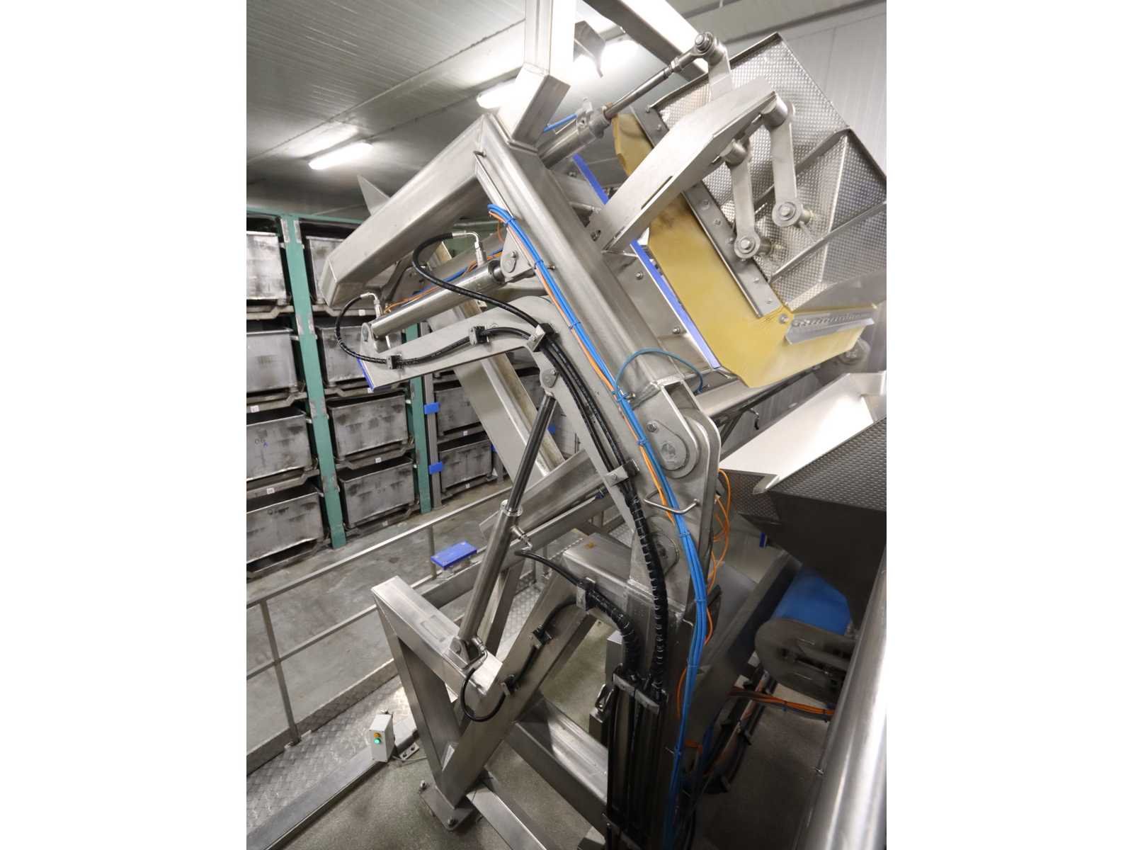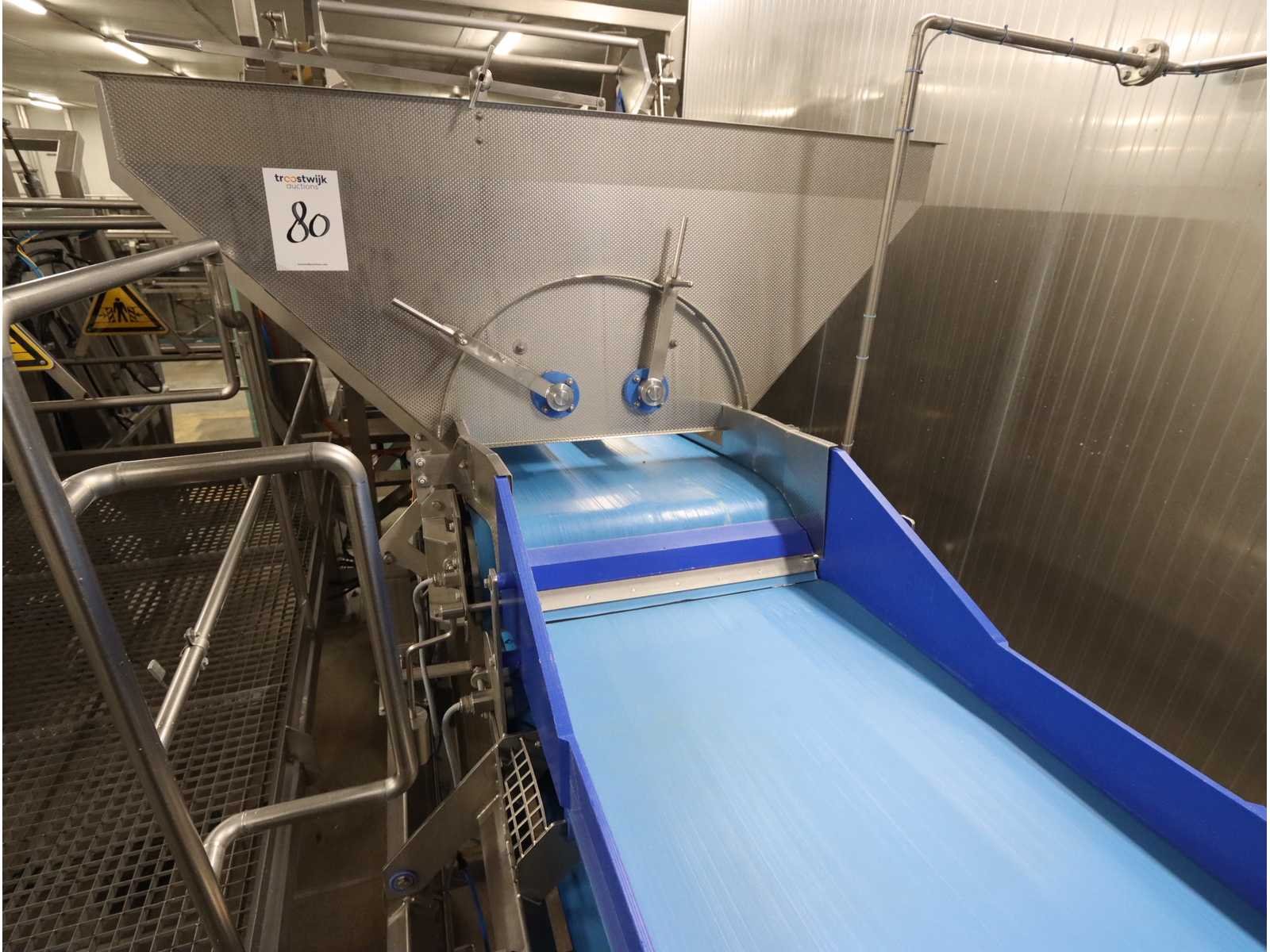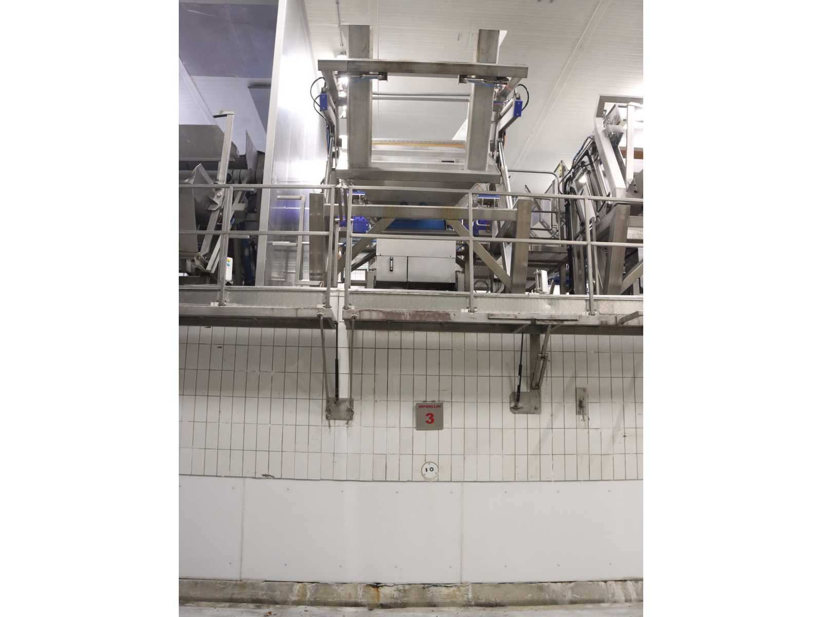 Bestaande uit: bakken kantelaar met onderlopende transportband, breedte 800 mm, lengte 2300 mm, hopper opening 1900x2000, tussen transportband, lengte 1700 mm, “Jasa” multilijns weger, type 2009PCB , 9 lijns, weegbereik 10000 gram, vloer doorvoer, bordes en besturing niet inbegrepen