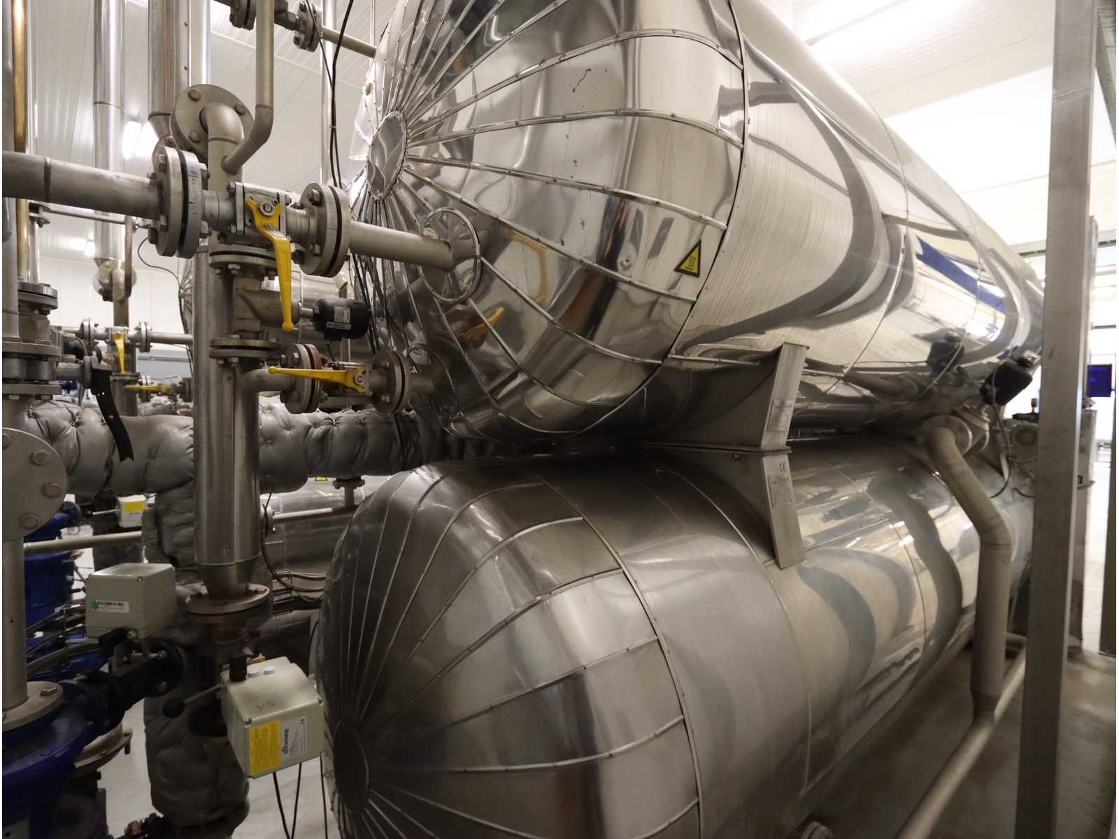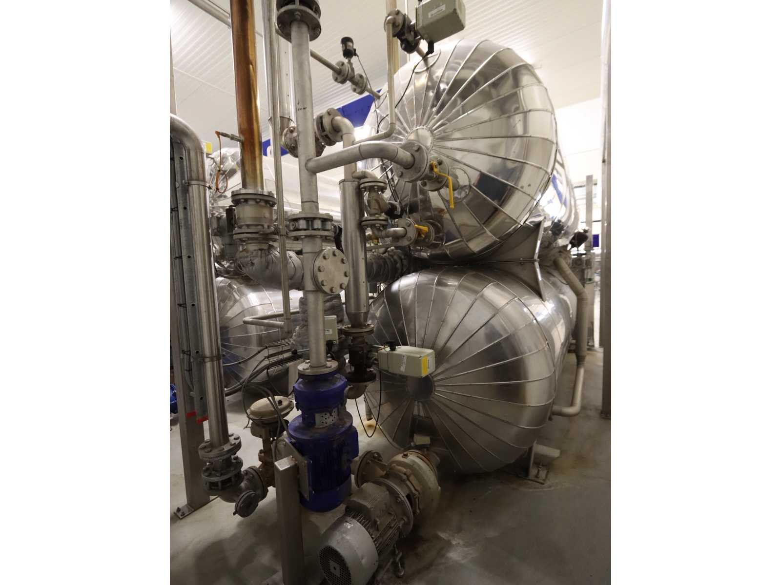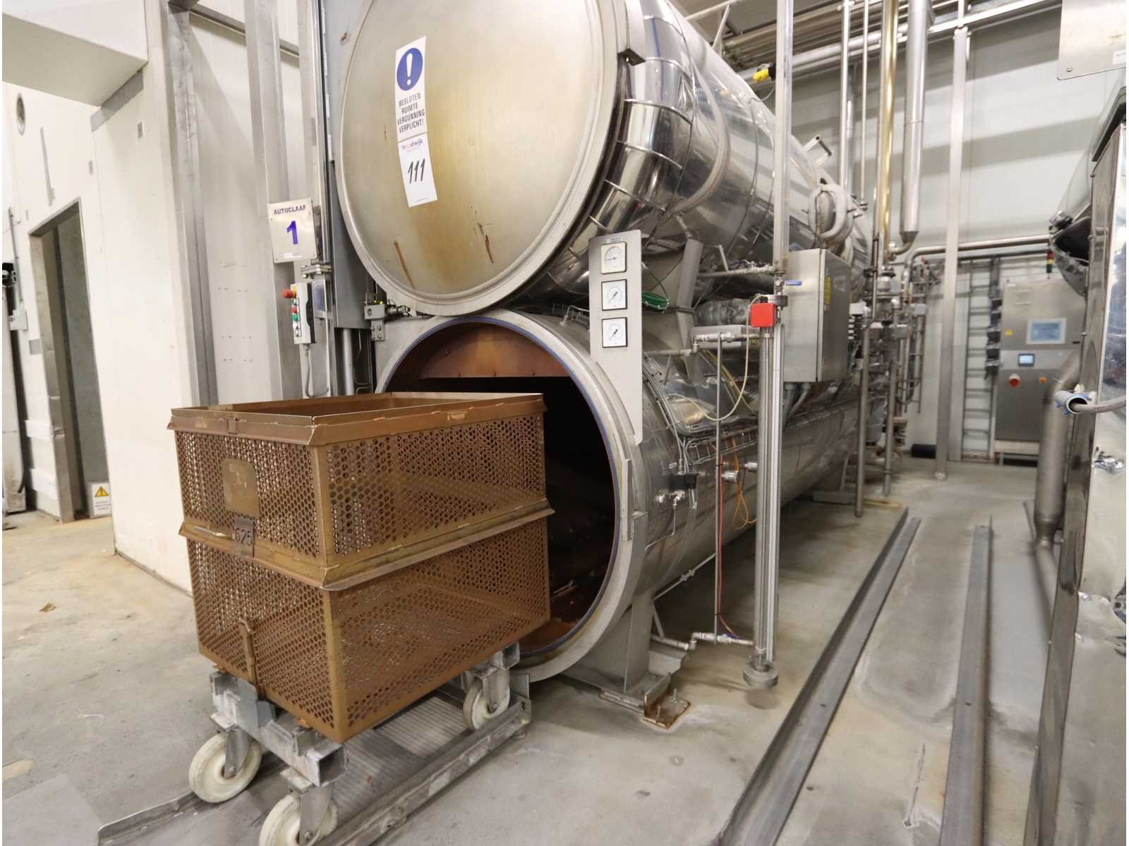 Voorzien 1x buffer tank (5700 liter) en autoclaaf tank (6000 liter), tank afmeting Ø 1400 mm, lengte 4750 mm, voorzien van liftdeur, diverse pompen en besturingskast Merk: Satoris Type: SAZ-1300-5-HV-VA Bouwjaar: 2005 Serienummer: 64713 Inhoud: 11700l Sterilisatietemperatuur: 165°c Aansluiting: 400V