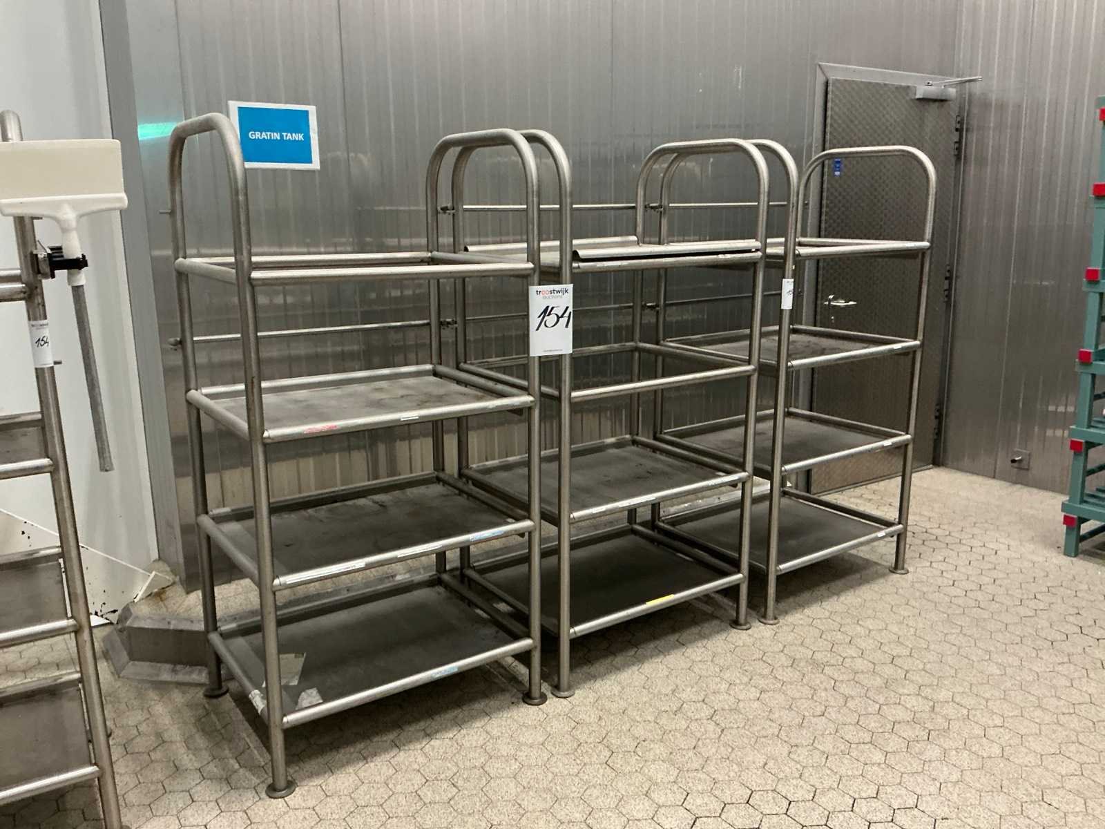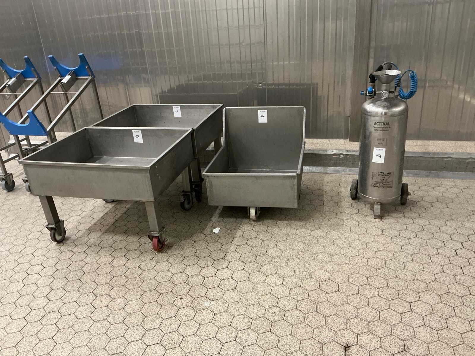 Waaronder 3x RVS stelling, afmeting 870x680x1800 mm, 2x kunststof koelcel stelling, 4x snijtafel, 2x gasflessen houder, 3x mobiele spoelbak, fles reiniger en 2 zakhouders