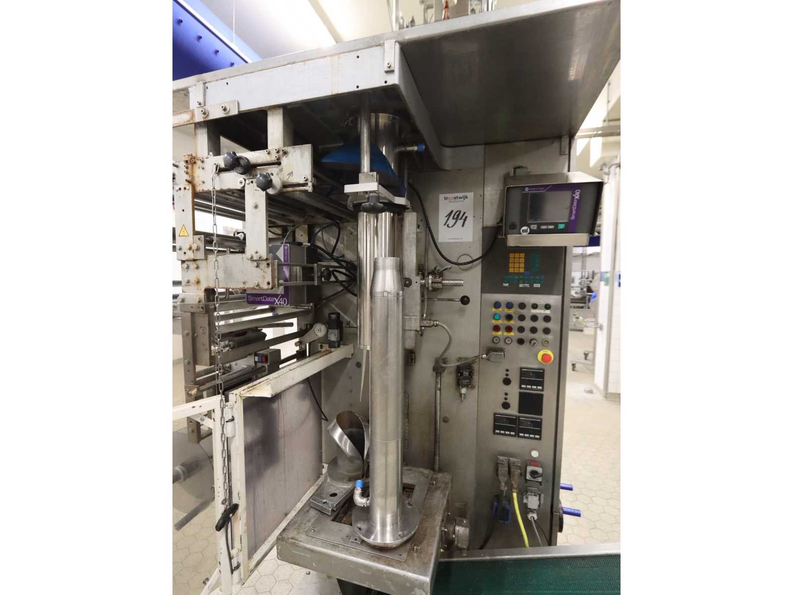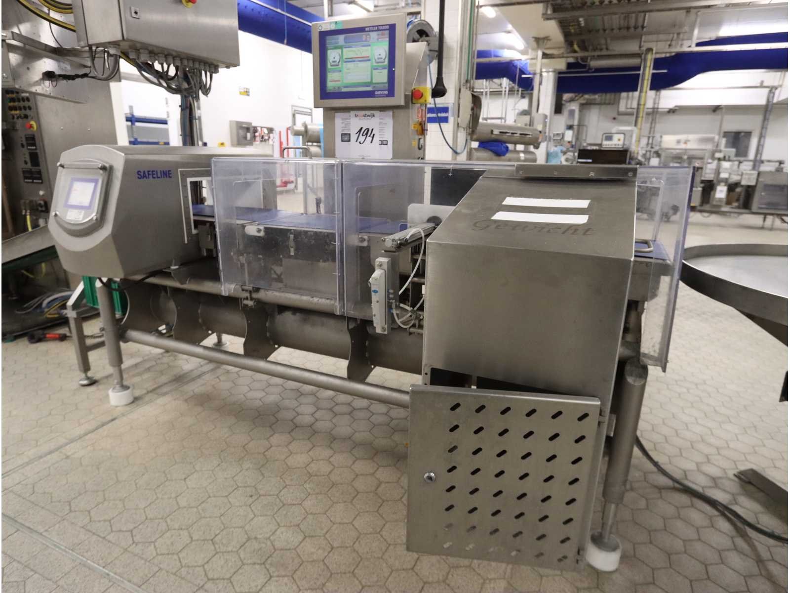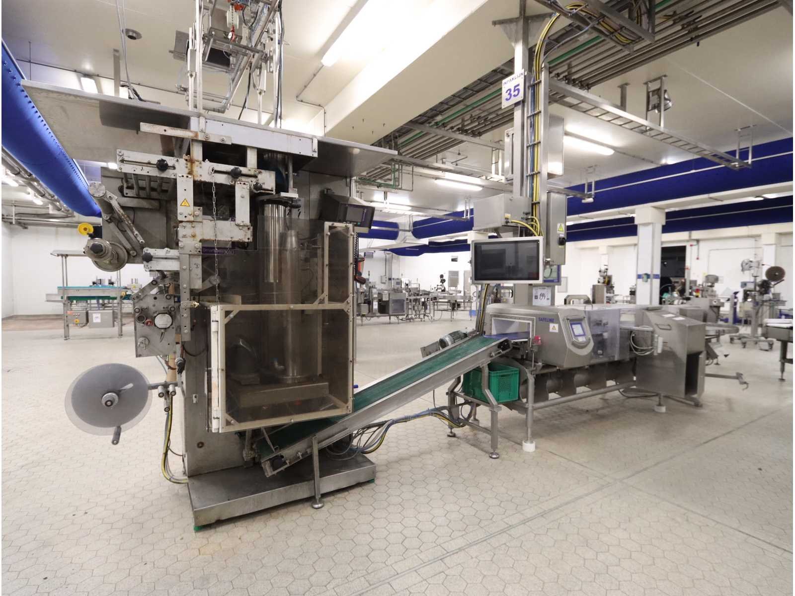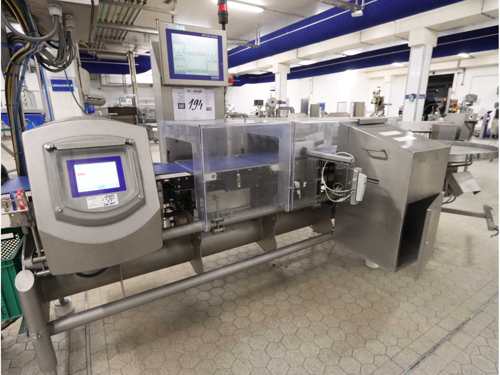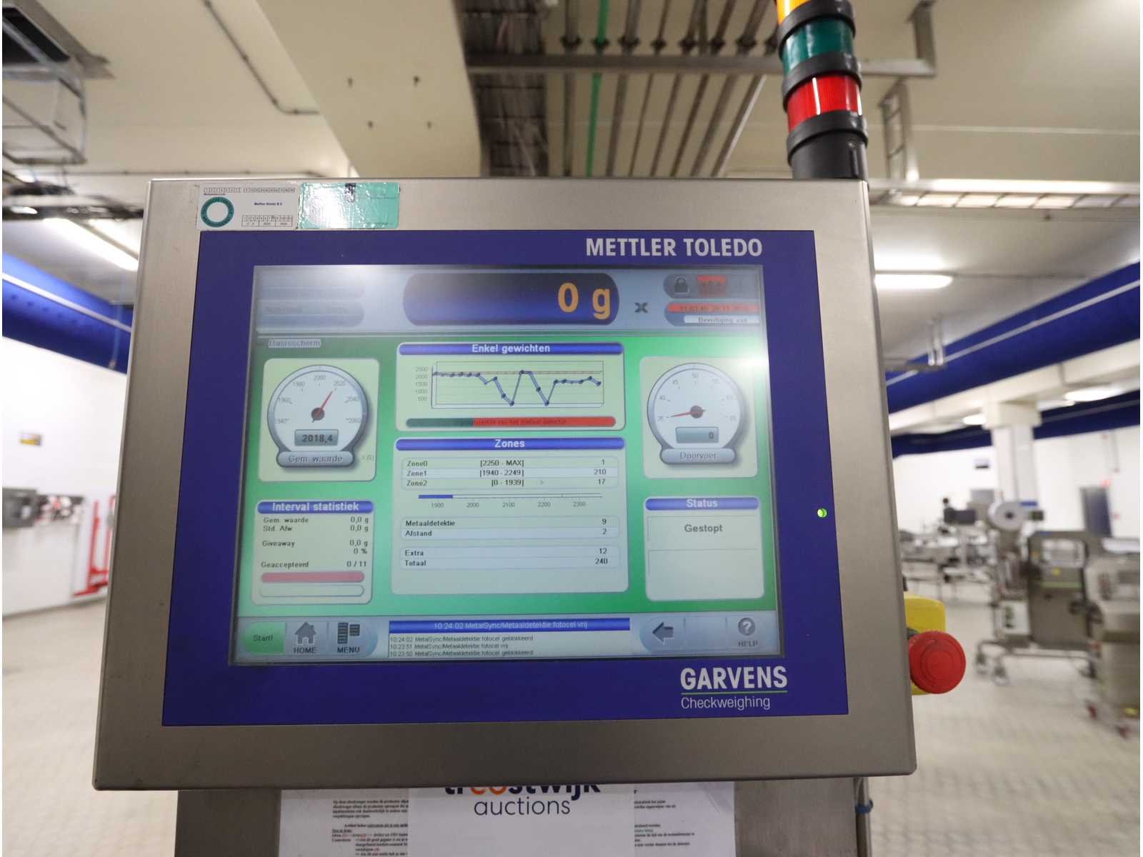 Voorzien van “Bosch” folie verpakkingsmachine, type SVZ2500A, met “Markem-Imaje” inkjet codeermachine, checkweigher, “Mettler Toledo” type XS3CC, met metaaldetector en dubbel uitwerpstation, inclusief buffertafel Merk: Bosch/Mettler Toledo
