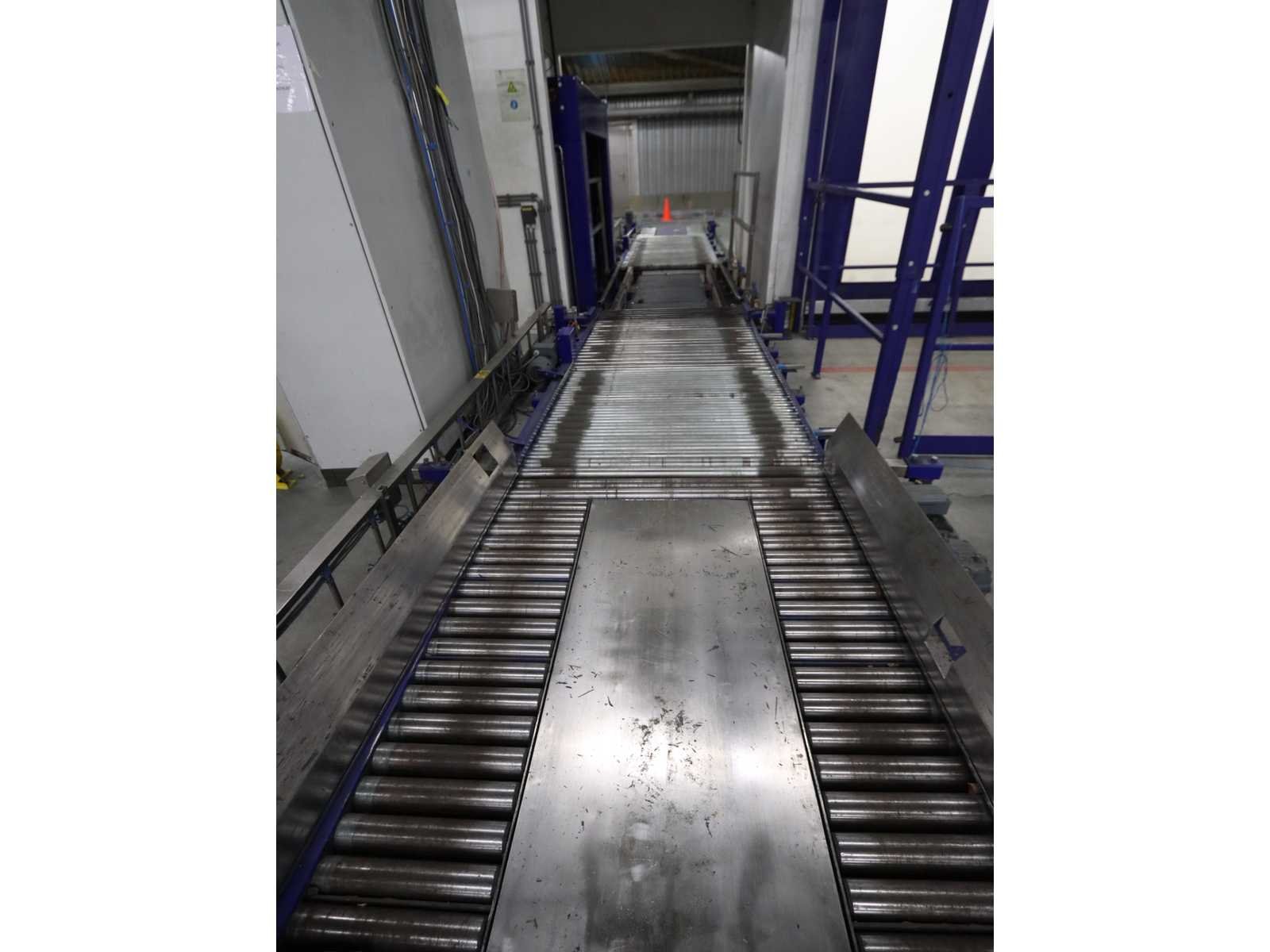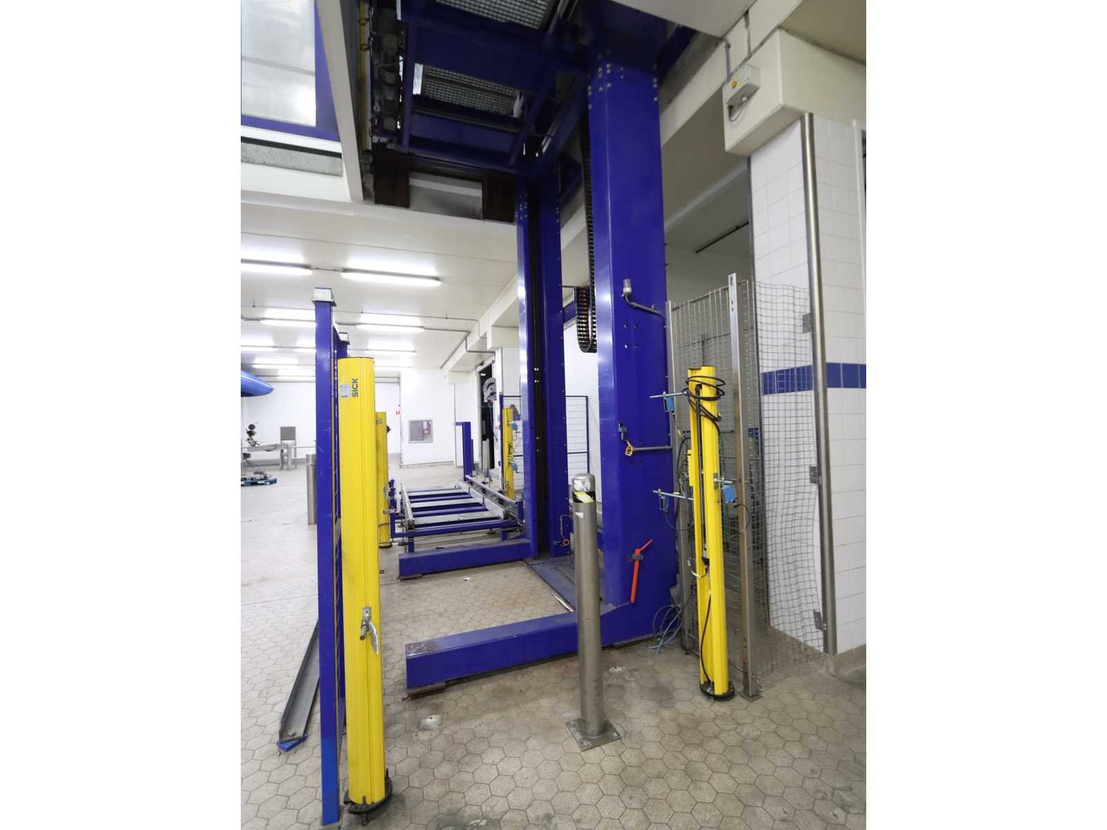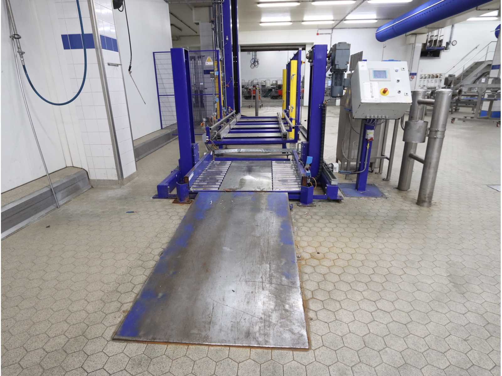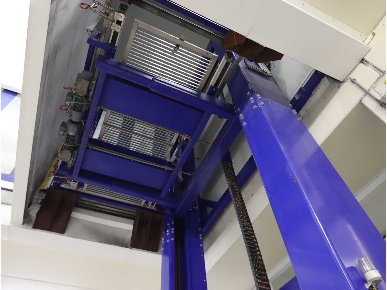 Hef hoogte 4600 mm, voorzien van veiligheidshek, optische beveiliging, schakelkast, inrij buffer, ketting transportbaan, lengte 3500 mm, 2 zijdige rollen uitvoer transportbaan, lengte 4500 mm, (speeddeuren op de 1e verdieping zijn niet inbegrepen) Plateau afm. l: 2250mm Plateau afm. b: 1120mm
