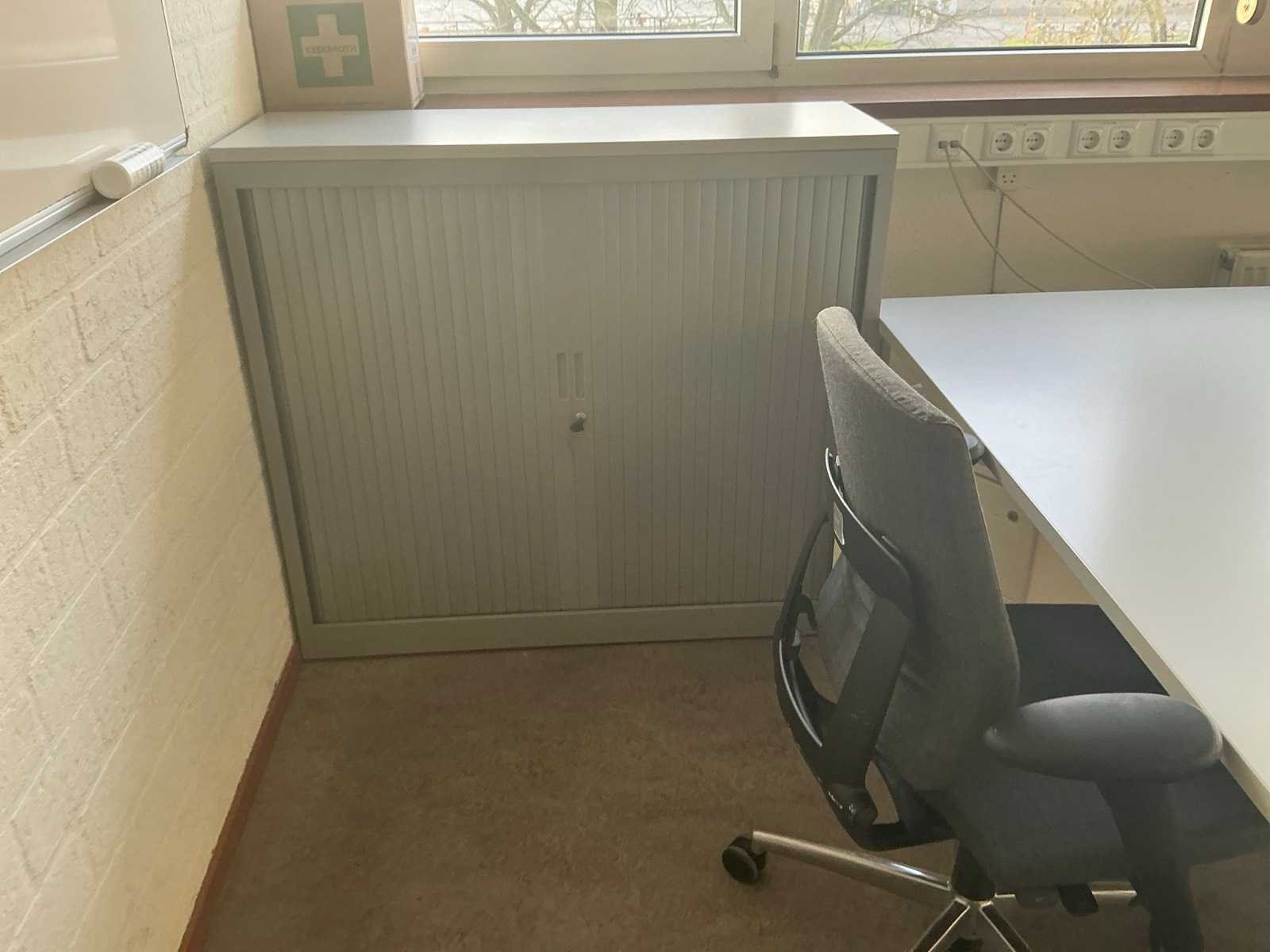 Waaronder 4 schrijftafels, 3 verijdbare burostoelen, jalouziedeurkast, en divers