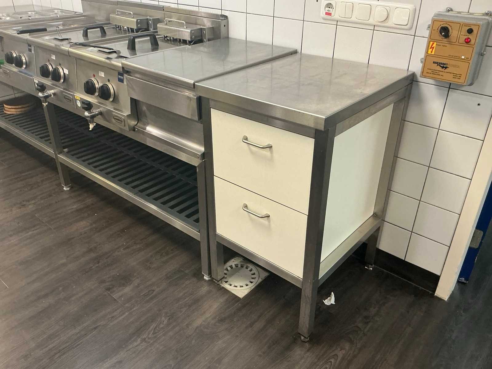 Bestaande uit: 2x “Combisteel” friteuse, kookplaat, au-bain-marie, 2x neutrale unit op onderschap en ladenkast Totale afmeting L: 610mm Totale afmeting Breedte: 2910mm Totale afmeting Hoogte: 900mm