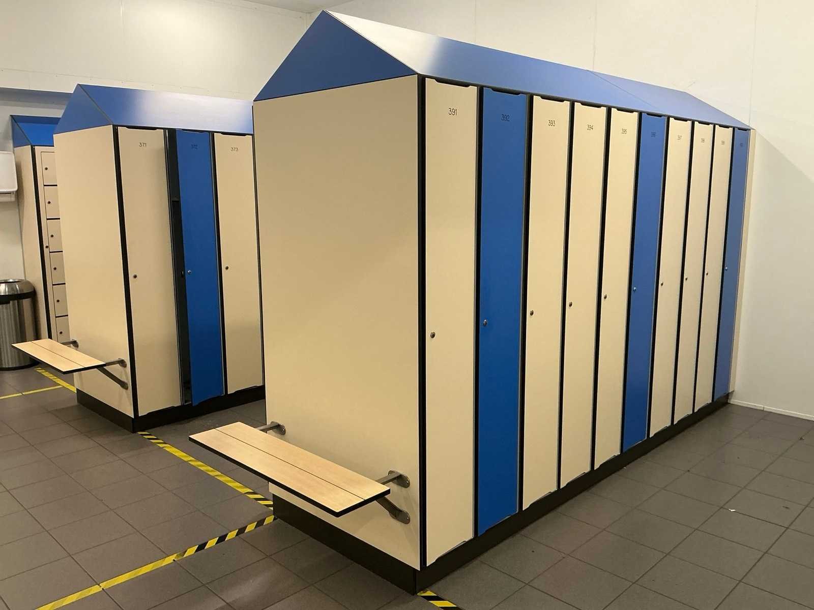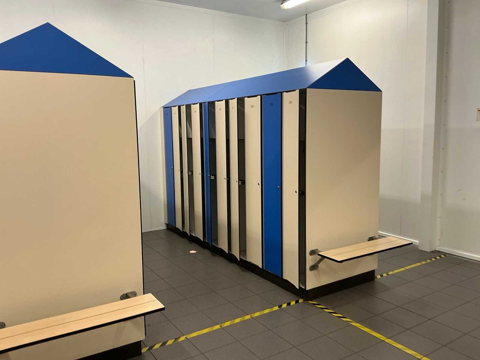 In diverse afmetingen en met verschillende uitvoeringen, totale lockerkast lengte circa 44 meter, inclusief bezoekers lockerkast